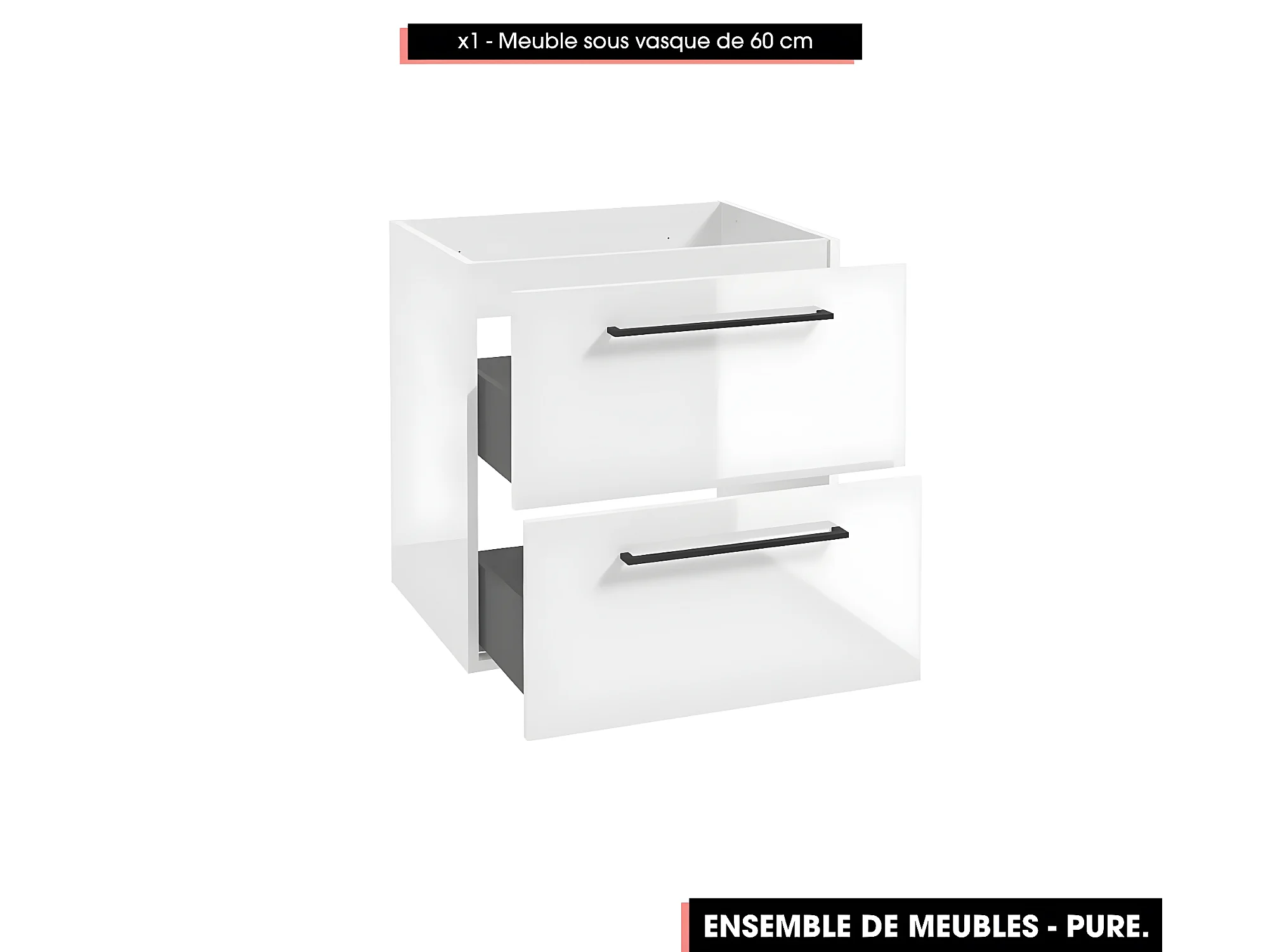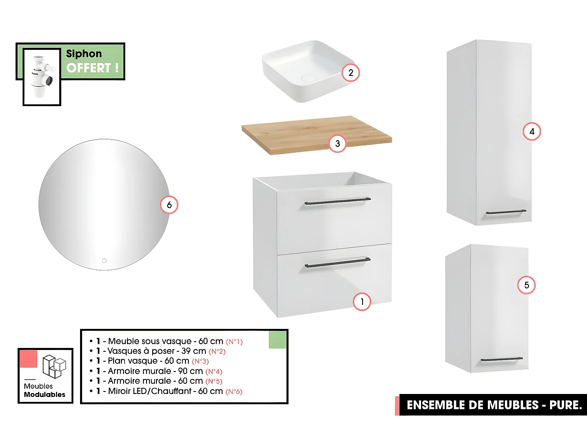 Emsemble complet de salle de bain - Meuble - Armoires - Miroir - Vasque à poser avec Siphon OFFERT | PURE | Blanc | 60 x 60 x 45 cm