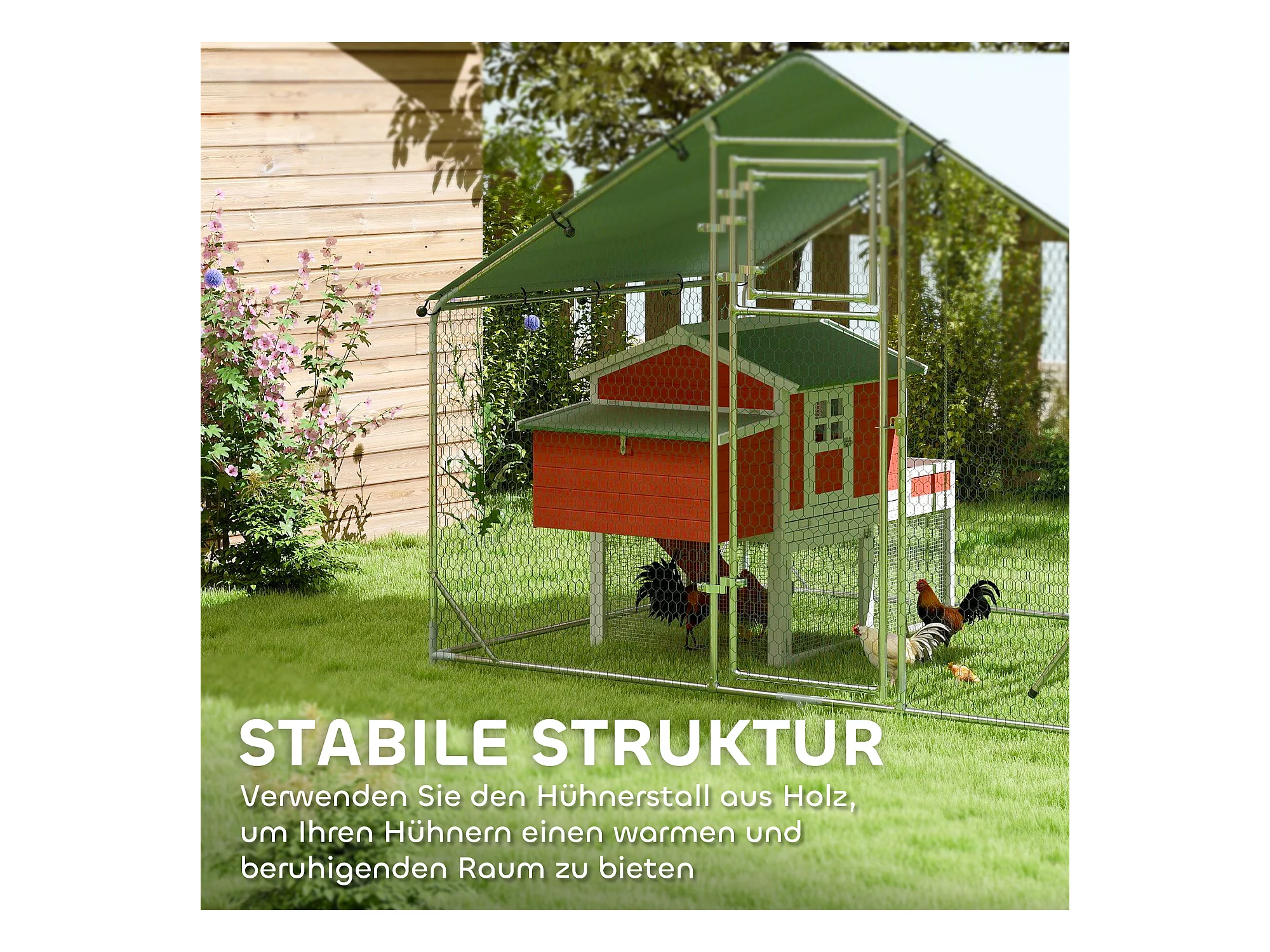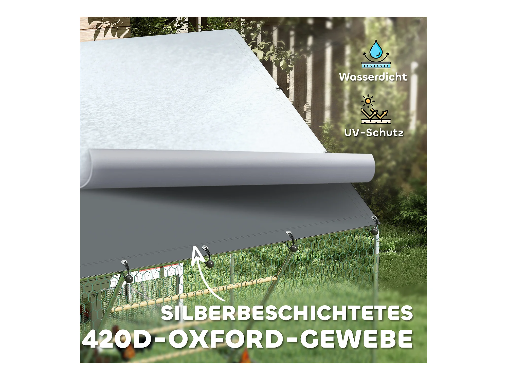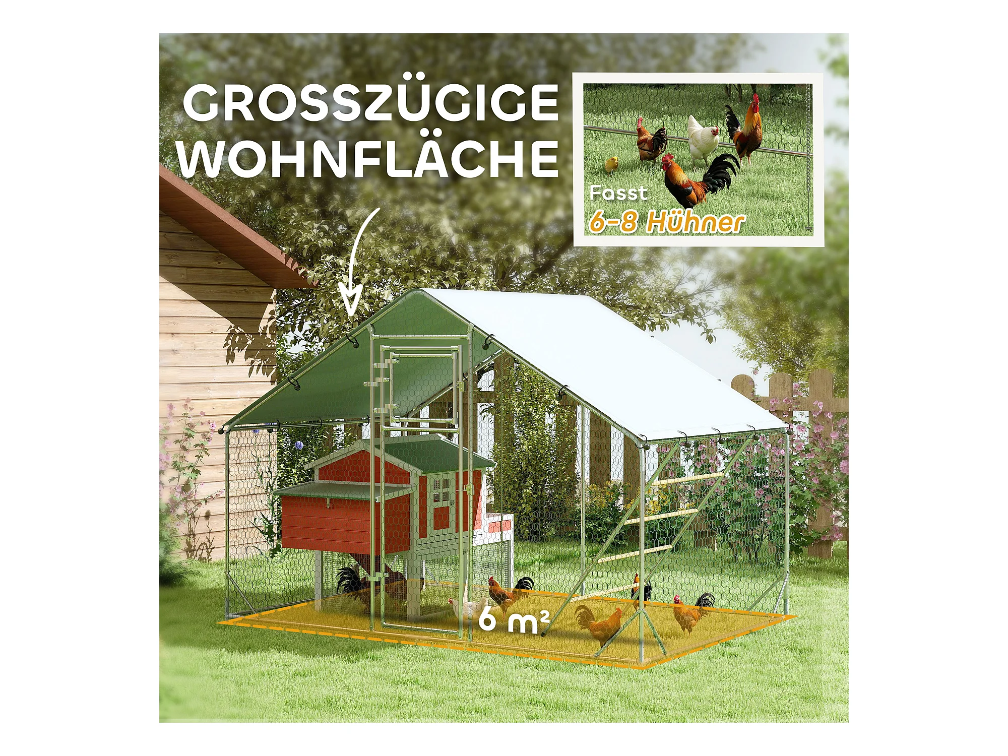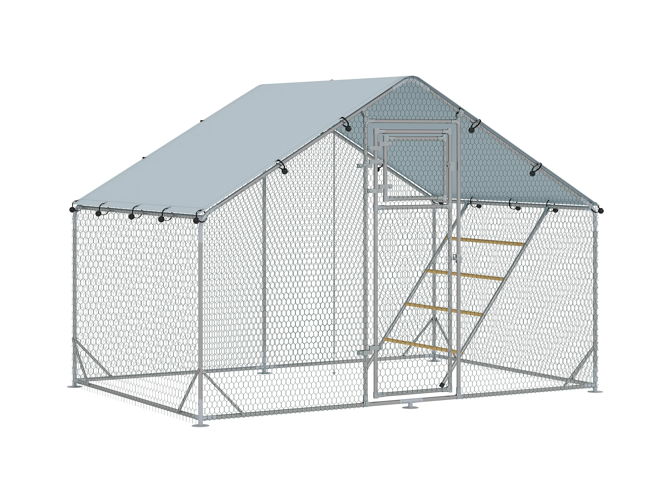 Enclos extérieur pour poules en acier, toit UV résistant, porte distributeur, perchoir, couleur argent (300x200x195cm)