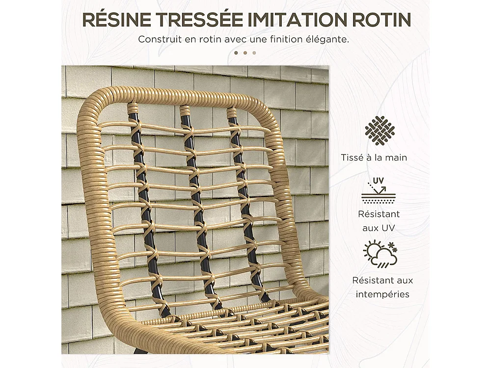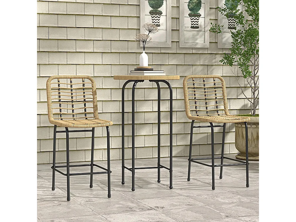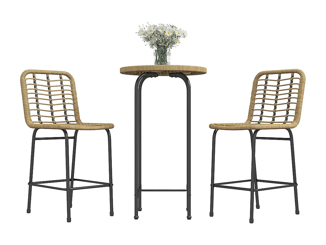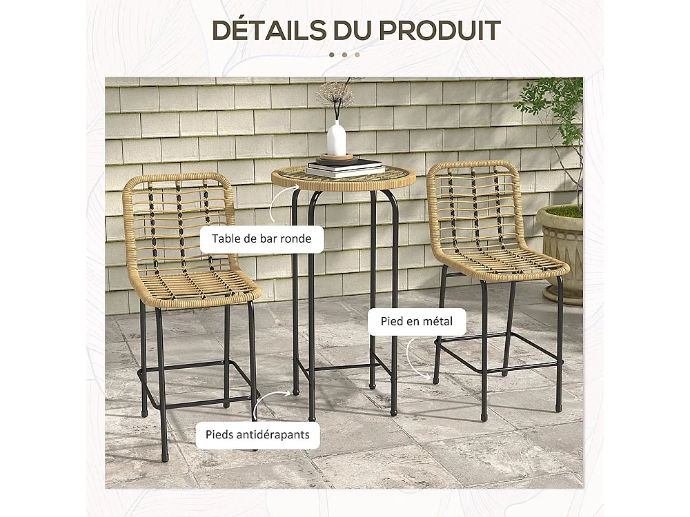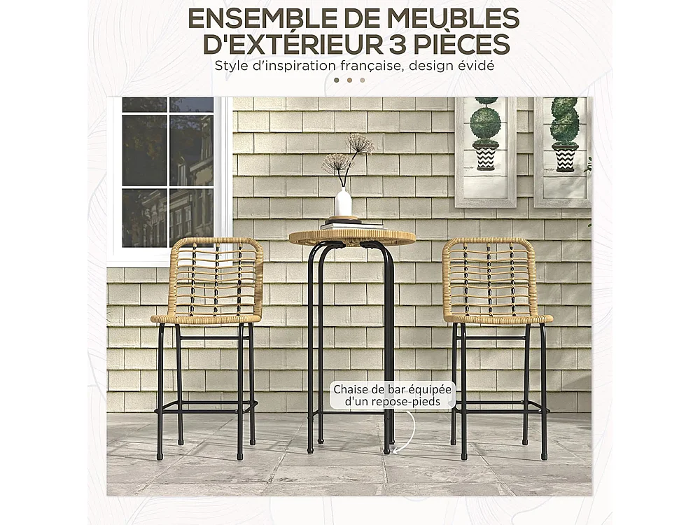 Ensemble 3 pièces 1 table haute ronde design bohème + 2 tabourets ronds avec repose-pied en métal 2 personnes, naturel