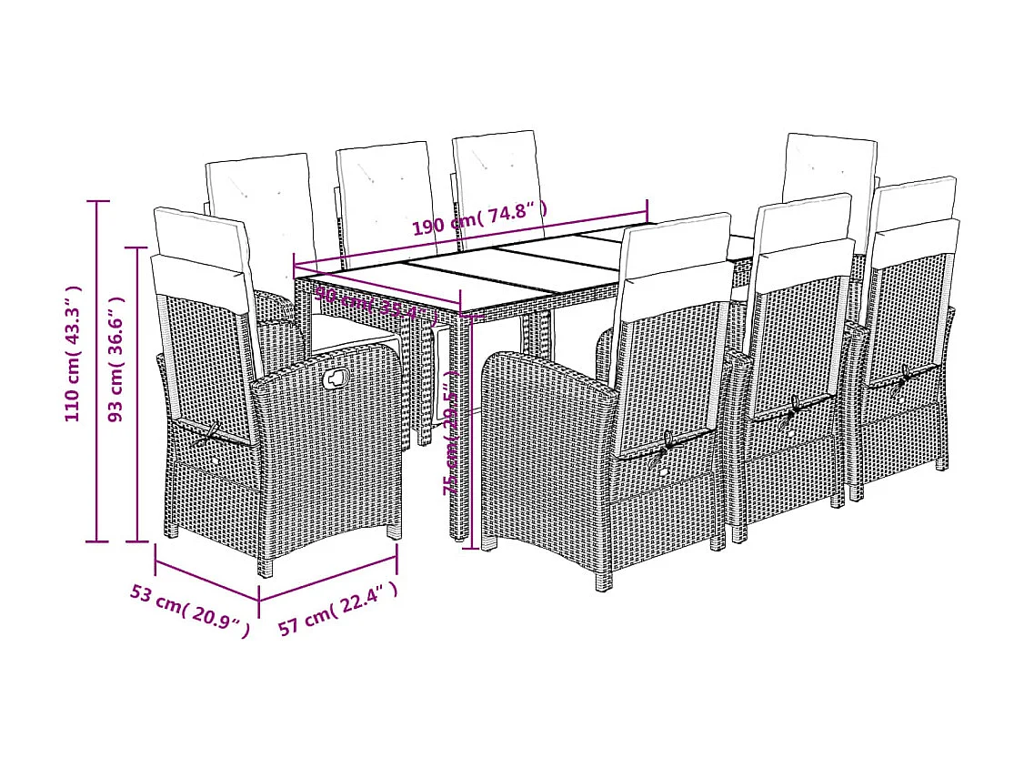 Ensemble à manger de jardin 9pcs coussins noir résine tressée