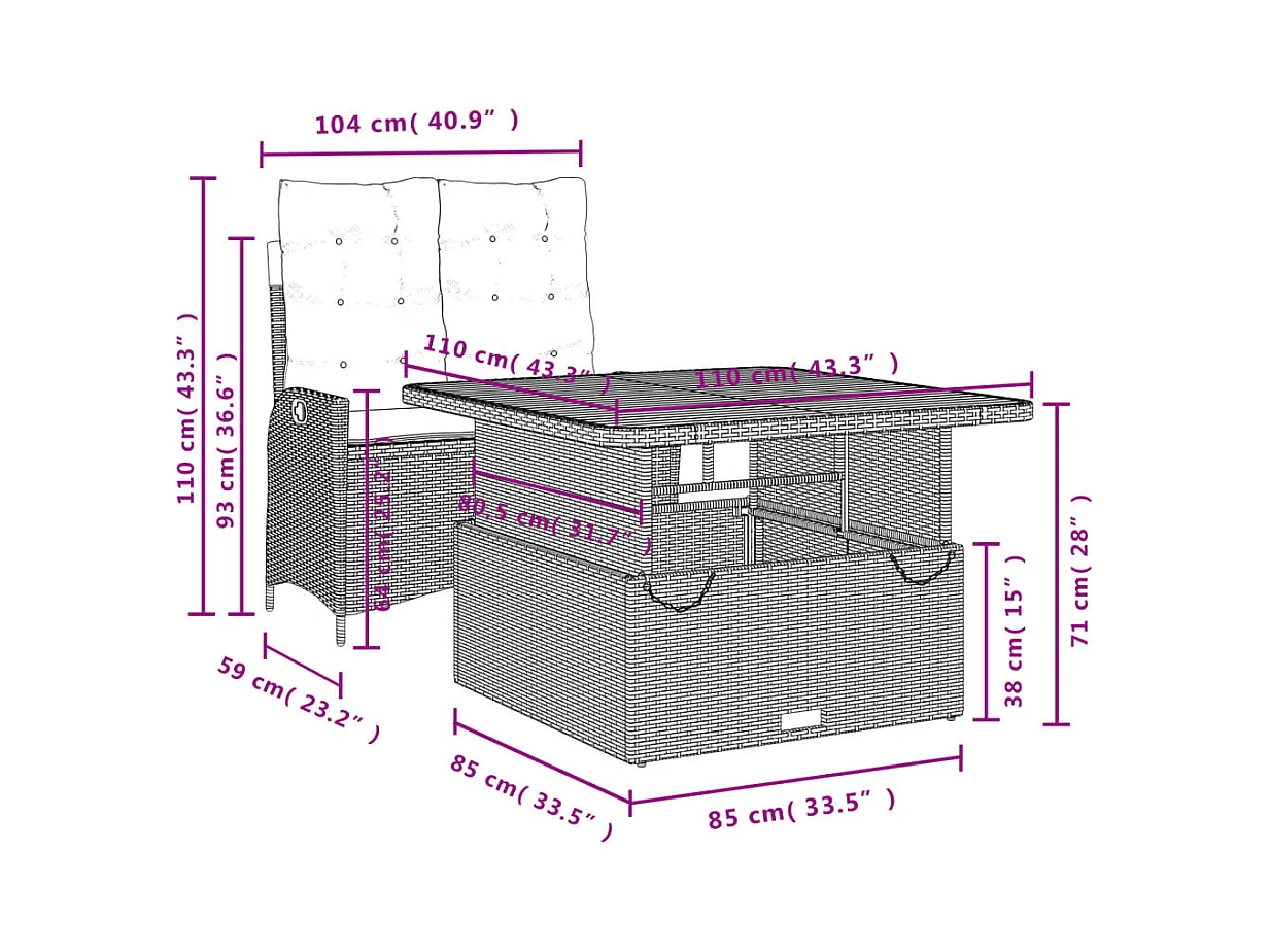 Ensemble à manger de jardin coussins 2pcs noir résine tressée