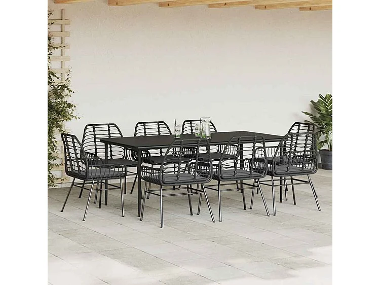 Ensemble à manger de jardin coussins 9pcs noir poly rotin verre