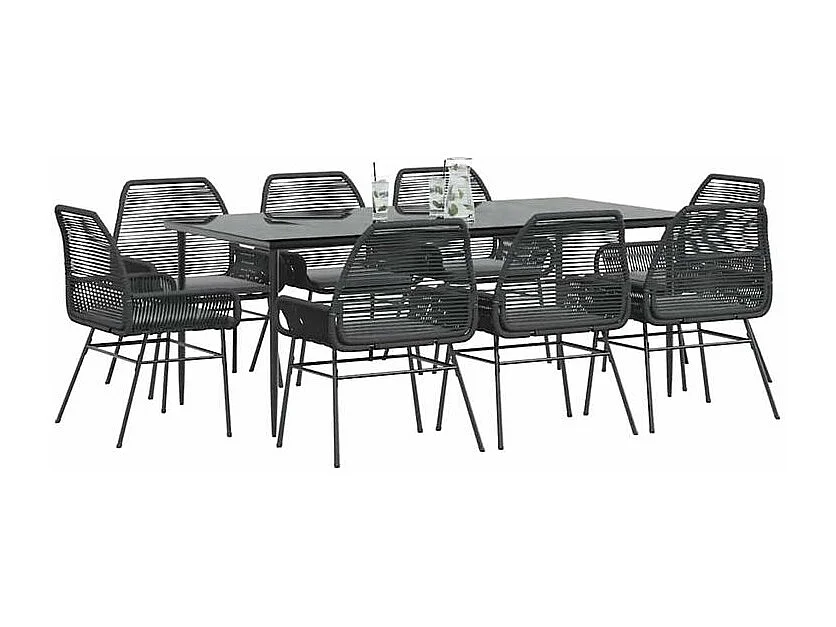 Ensemble à manger de jardin coussins 9pcs noir poly rotin verre