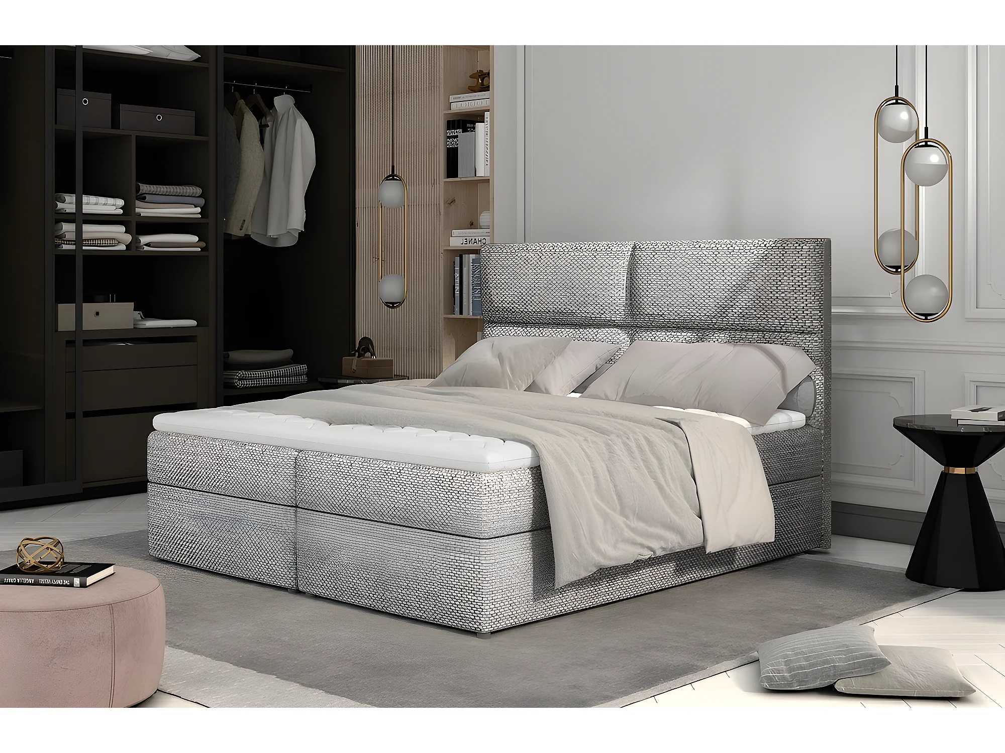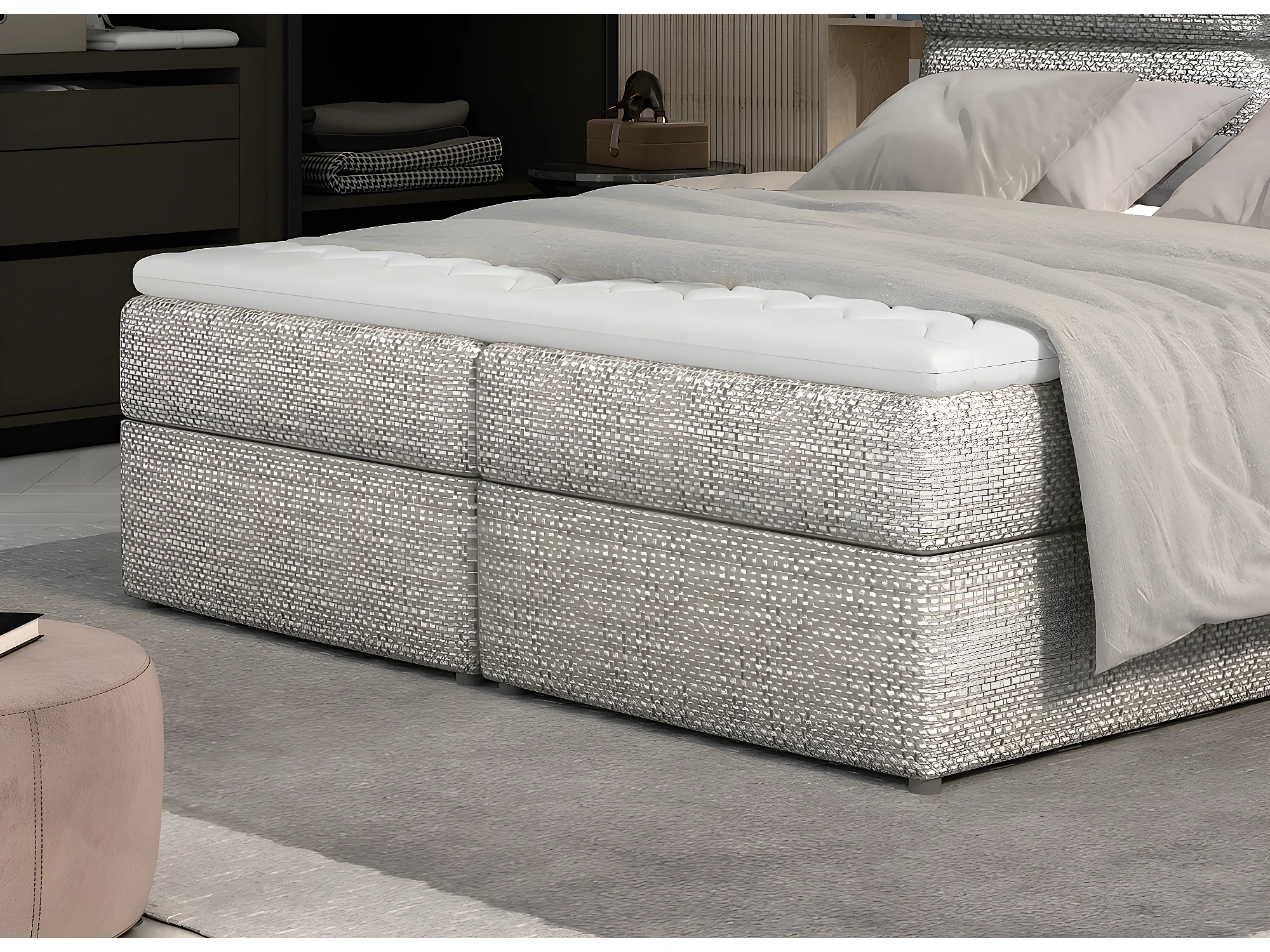 Ensemble boxspring complet tête de lit + sommiers + matelas + surmatelas AMARIS de VENESETTI - tissu luxe gris - 160x200 cm