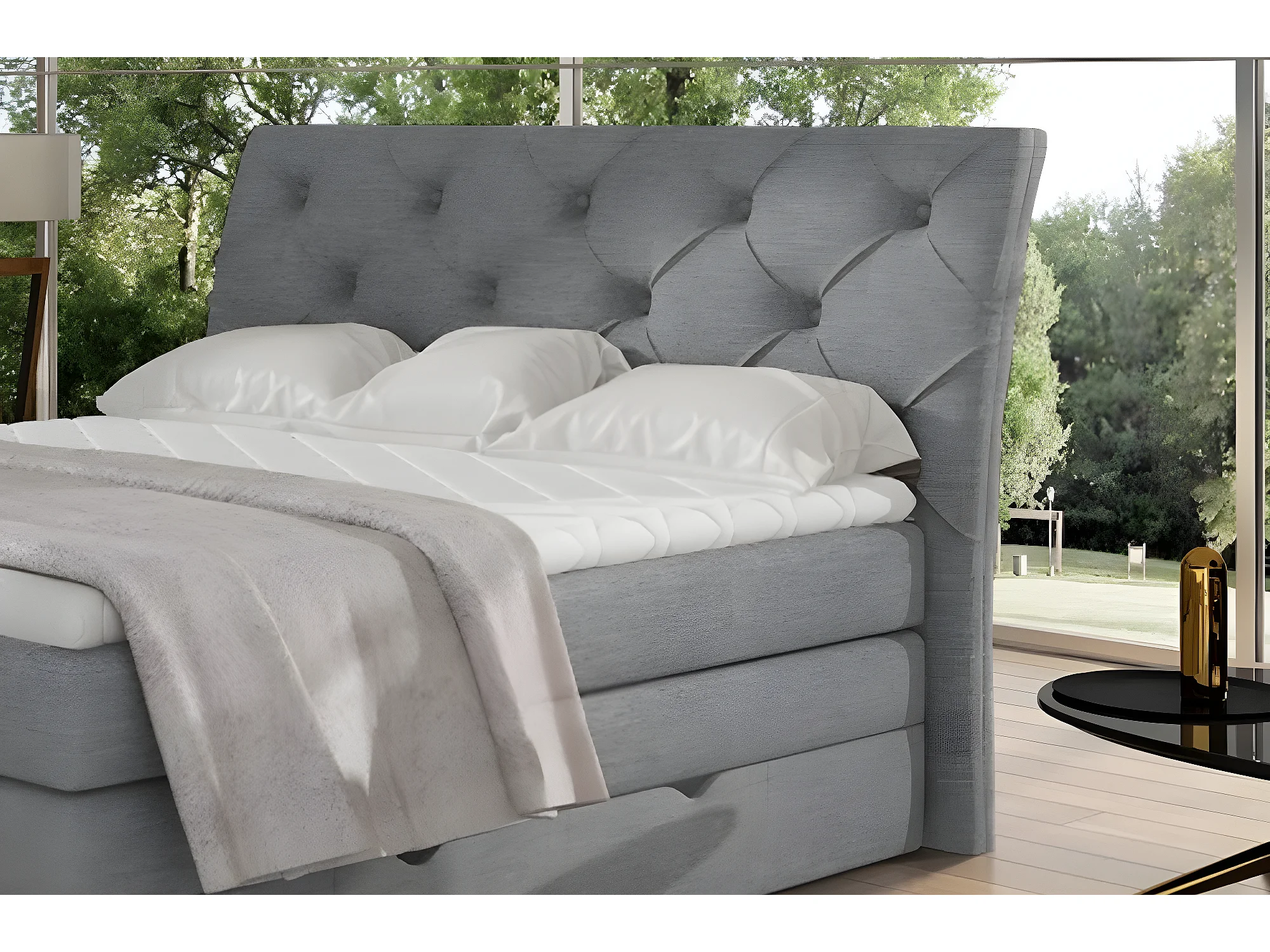 Ensemble boxspring complet tête de lit + sommiers + matelas + surmatelas MIRO tissu luxe gris - 140x200 cm