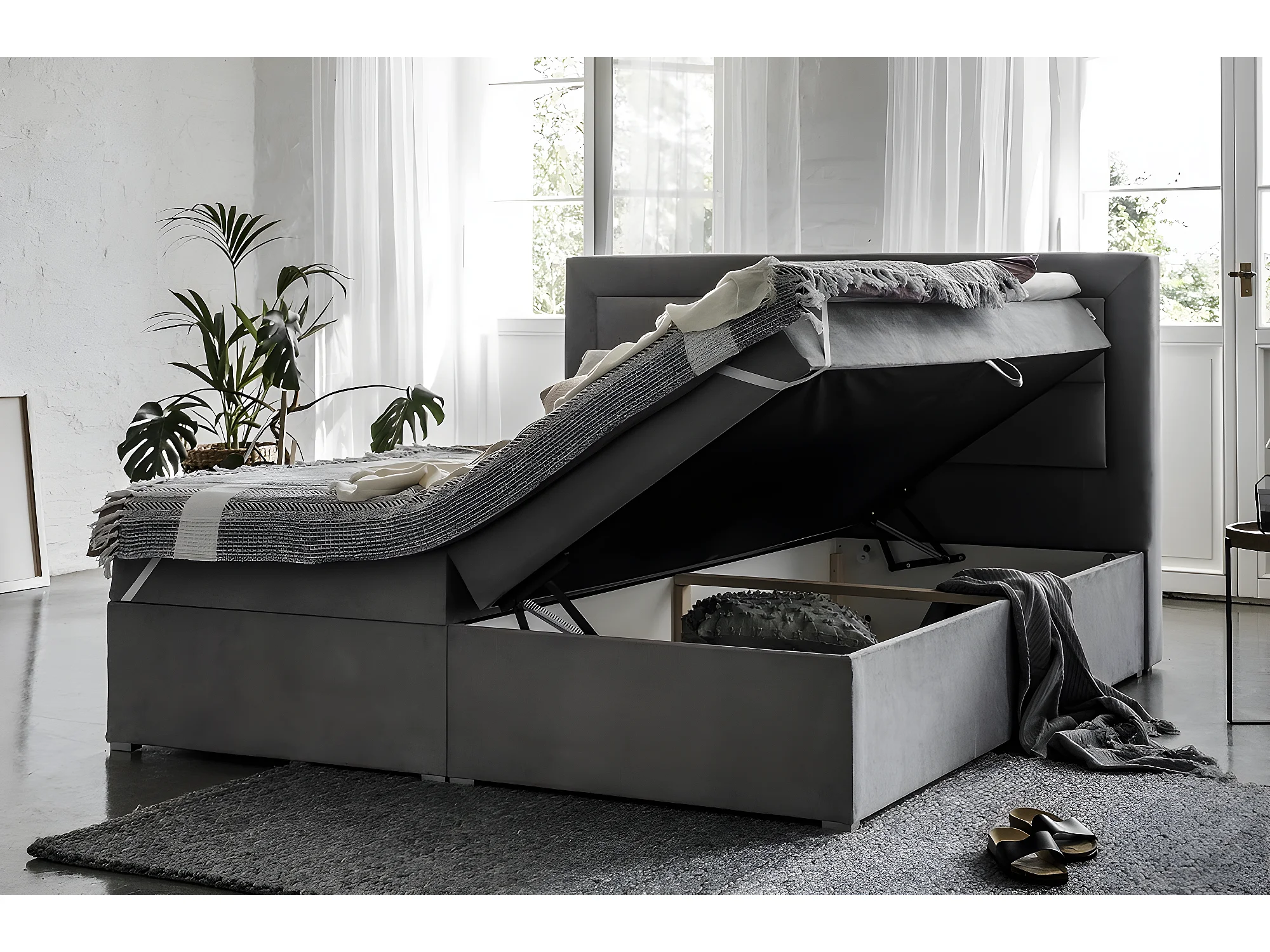 Ensemble boxspring complet tête de lit + sommiers + matelas + surmatelas VISTA de VENESETTI - tissu luxe gris foncé - 160 x 200 cm