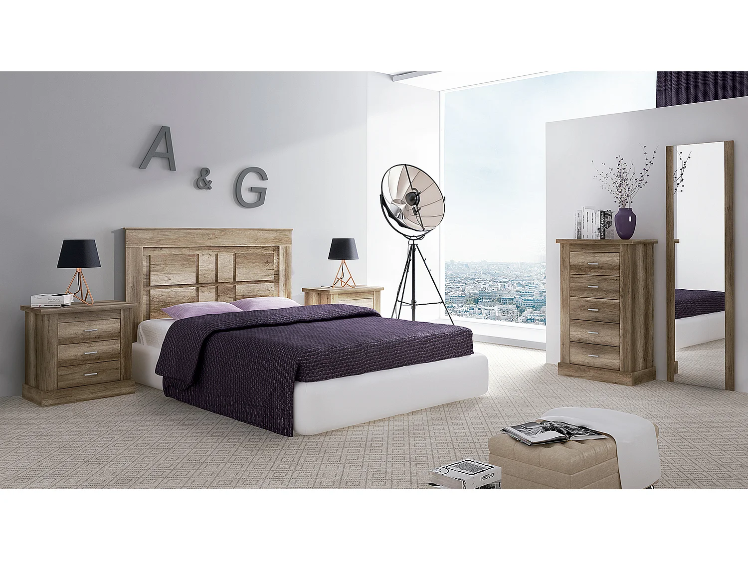 Ensemble chambre à coucher, tête de lit + 2 tables chevets + chiffonnier + miroir mural coloris chêne vieilli