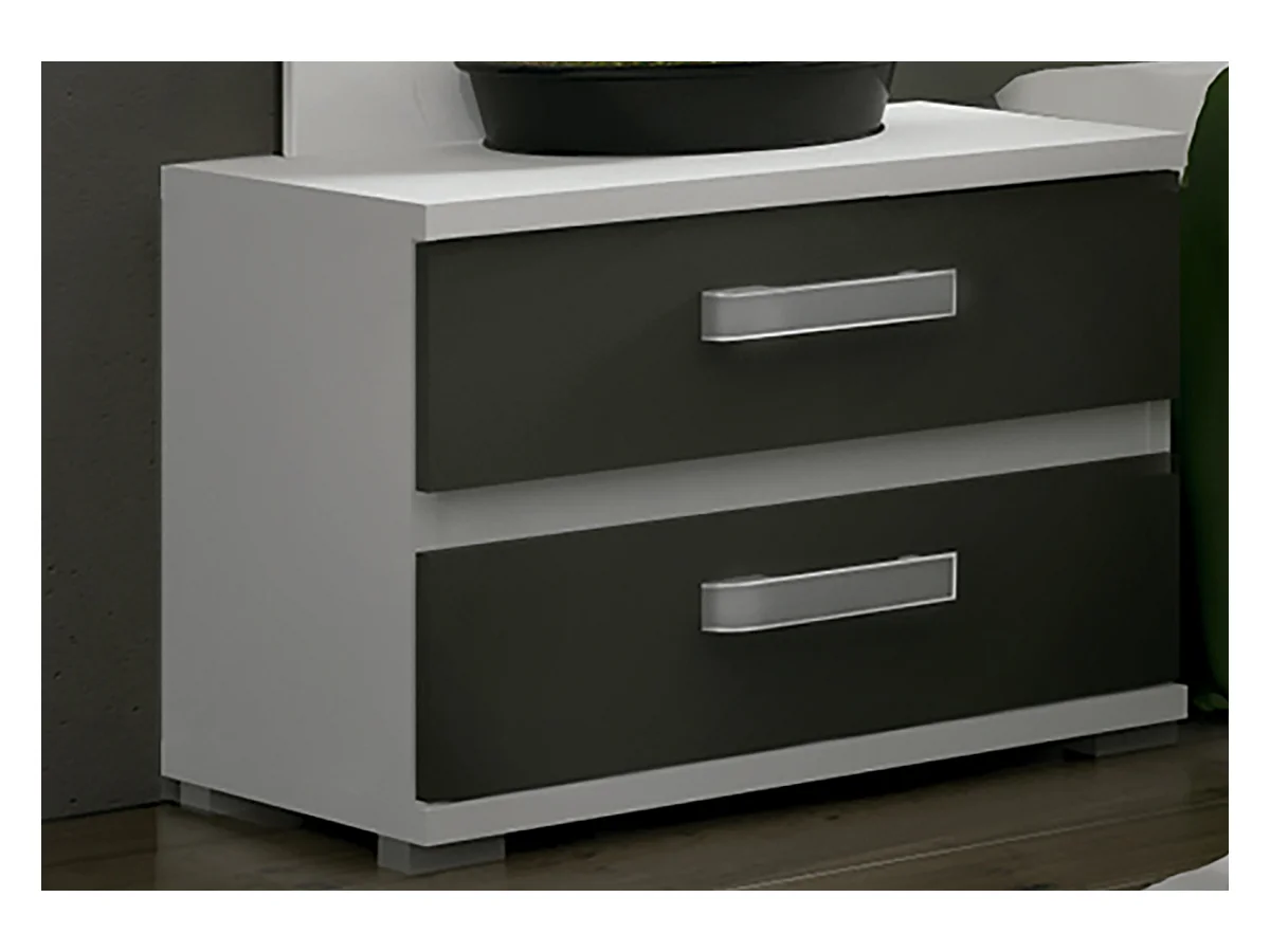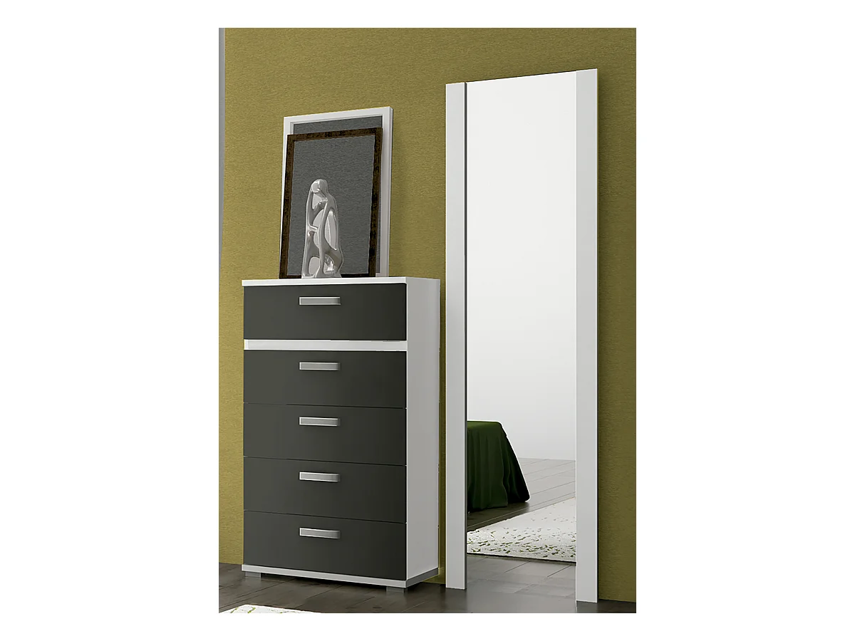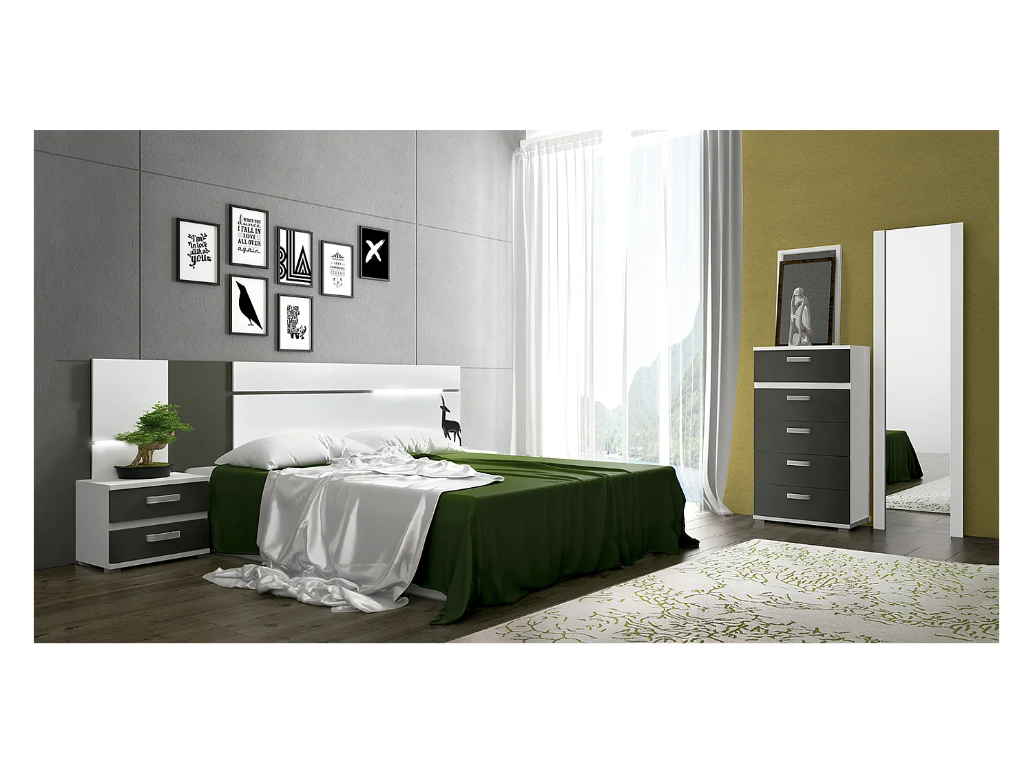 Ensemble chambre à coucher, tête de lit avec LED + 2 tables chevets + chiffonier + miroir mural long coloris blanc/graphite
