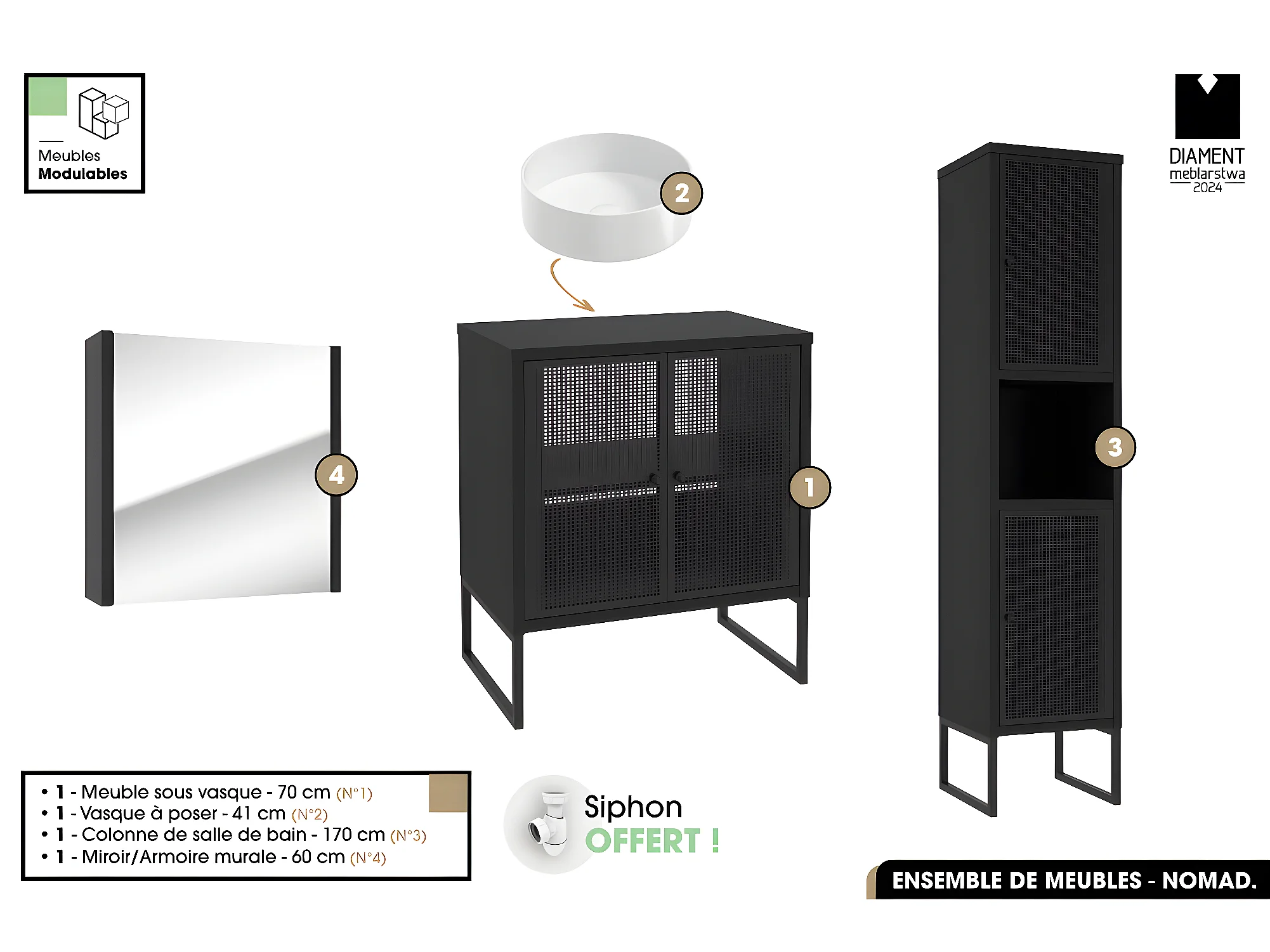 Ensemble complet de salle de bain - Meuble - Colonne - Miroir - Vasque avec Siphon OFFERT | NOMAD | NOIR | 70 x 80 x 43 cm