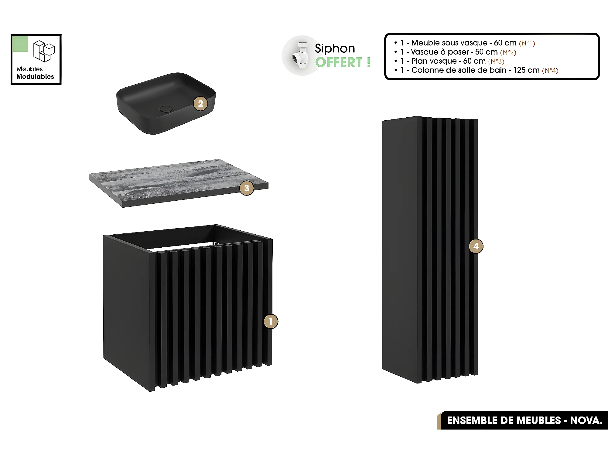 Ensemble complet de salle de bain - Meuble - Colonne - Vasque à poser avec Siphon OFFERT | NOVA | Noir | 60 x 56 x 45 cm