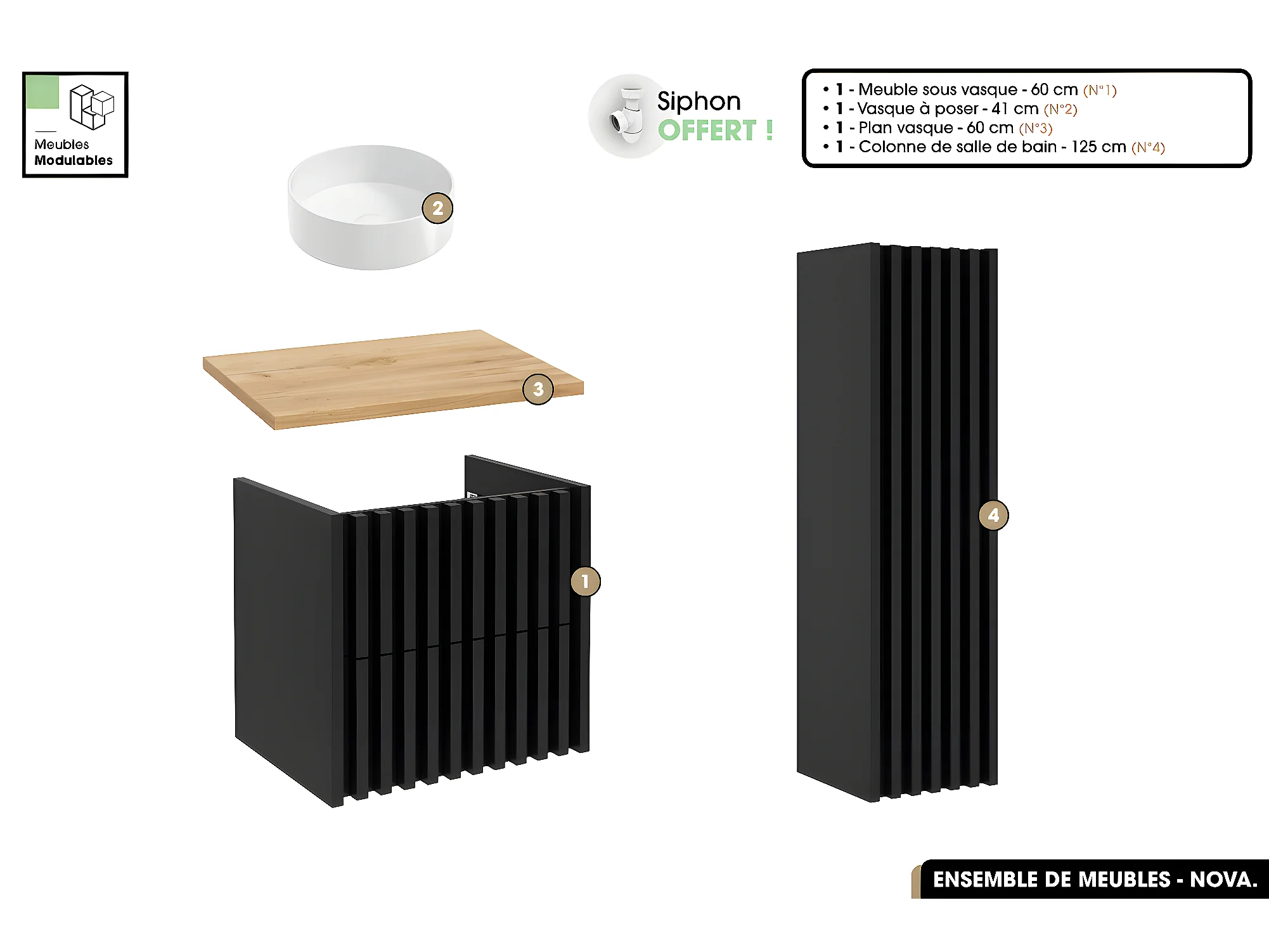 Ensemble complet de salle de bain - Meuble - Colonne - Vasque à poser avec Siphon OFFERT | NOVA | Oak | 60 x 56 x 45 cm