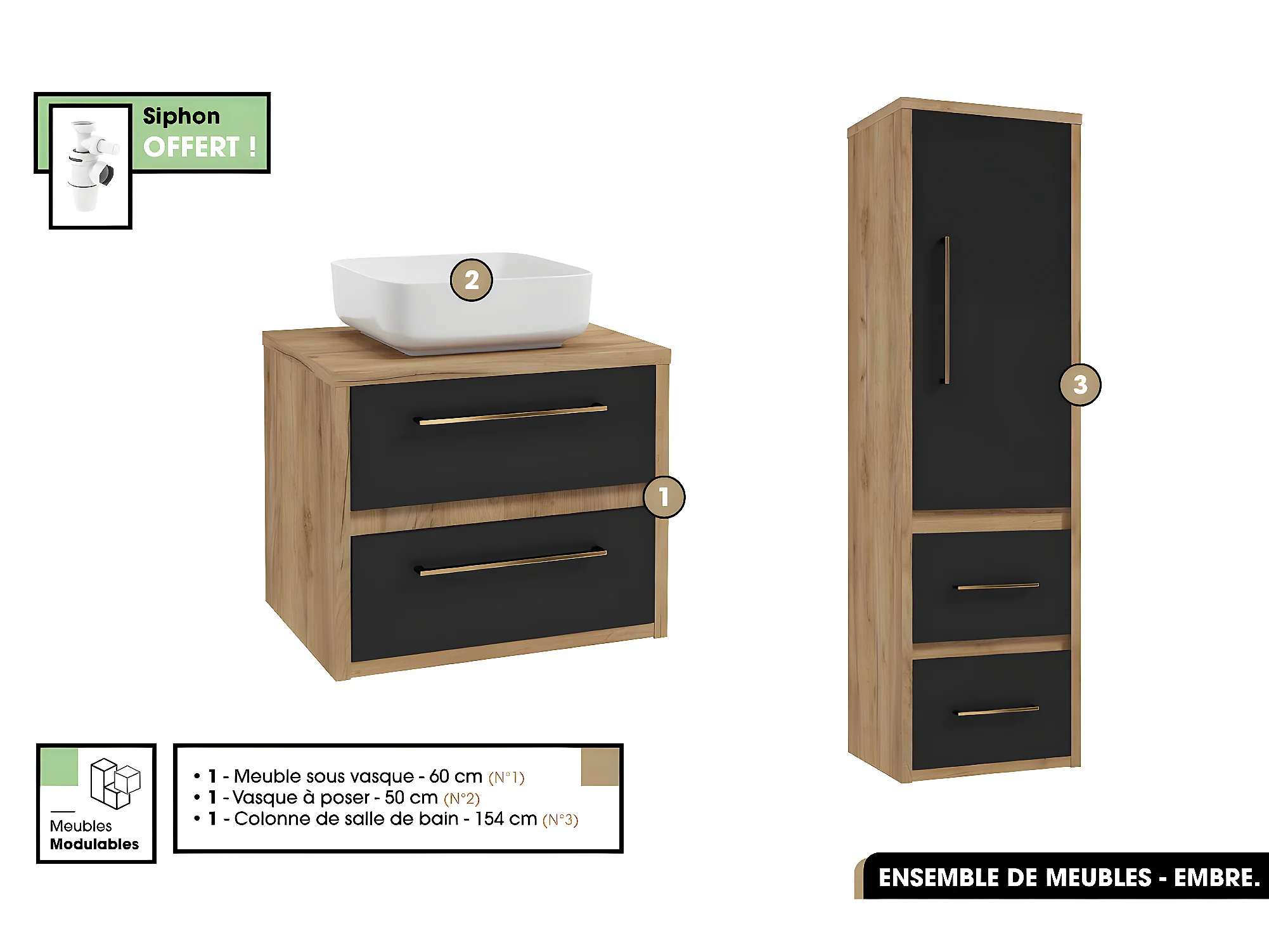 Ensemble complet - de salle de bain - Meuble - Colonne - Vasque avec Siphon OFFERT | EMBRE | Noir | 60 x 50 x 45 cm