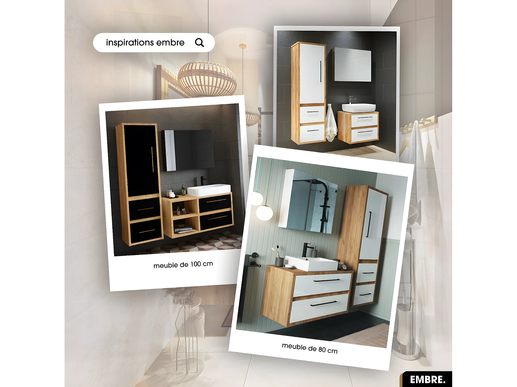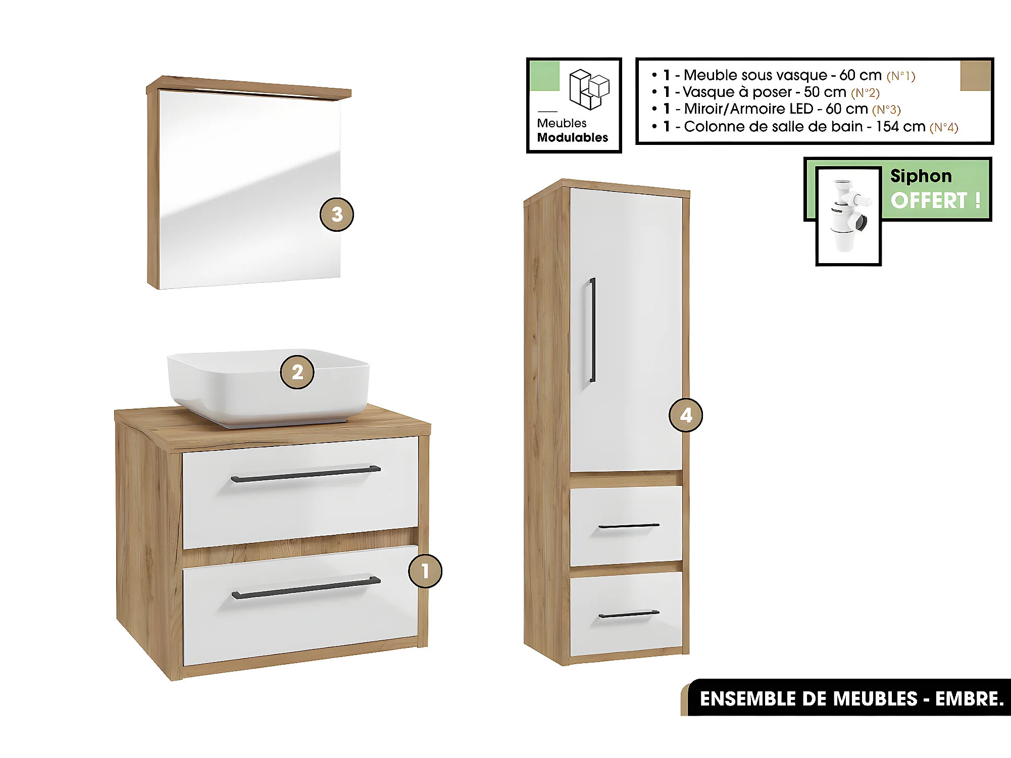 Ensemble complet - de salle de bain - Meuble - Miroir/Armoire - Colonne - Vasque avec Siphon OFFERT | EMBRE | Blanc | 60 x 50 x 45 cm