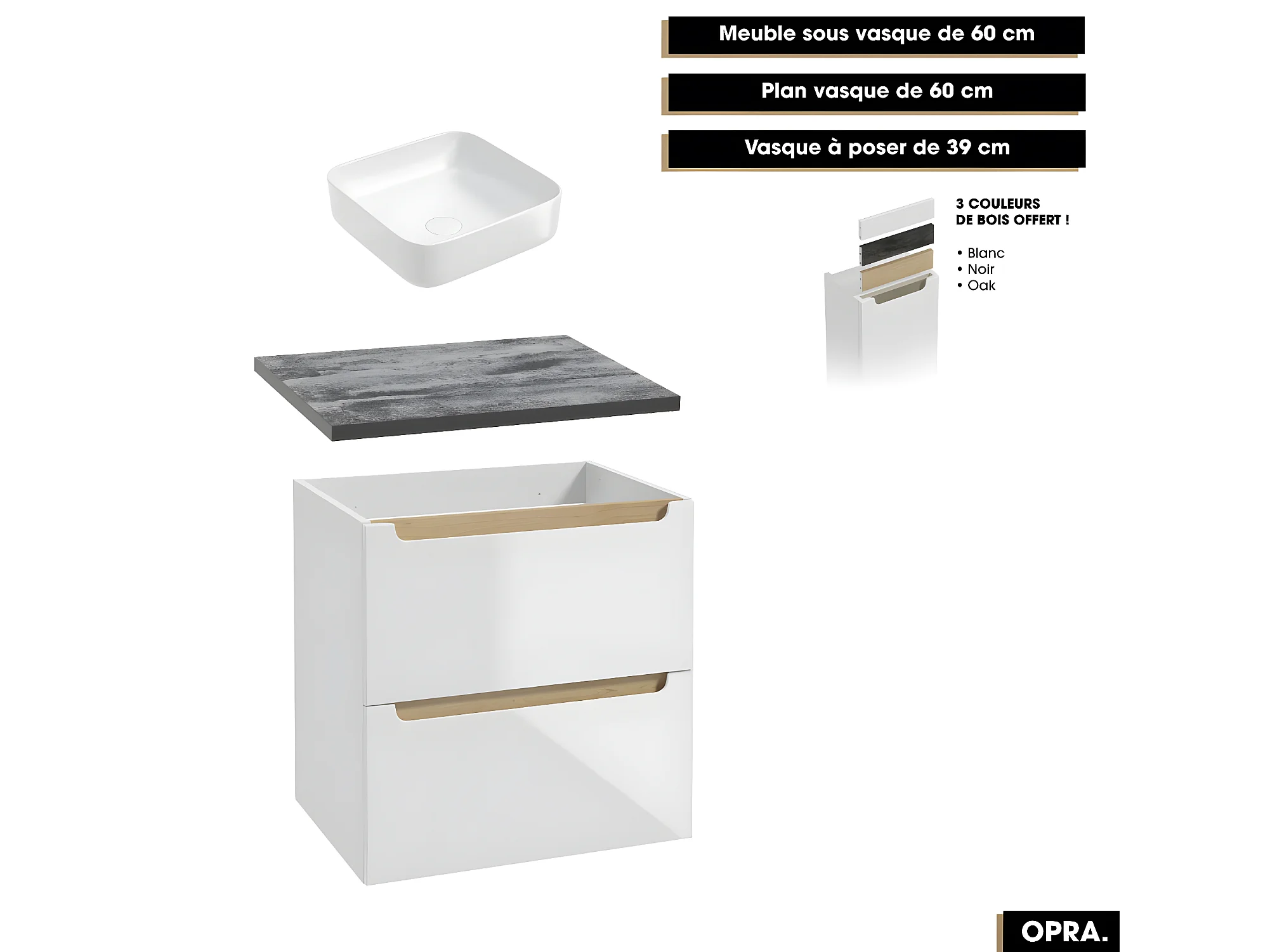 Ensemble complet de salle de bain - Meuble - Plan - Armoires - Miroir - Vasque à poser avec Siphon OFFERT | OPRA | 60 x 60 x 45 cm