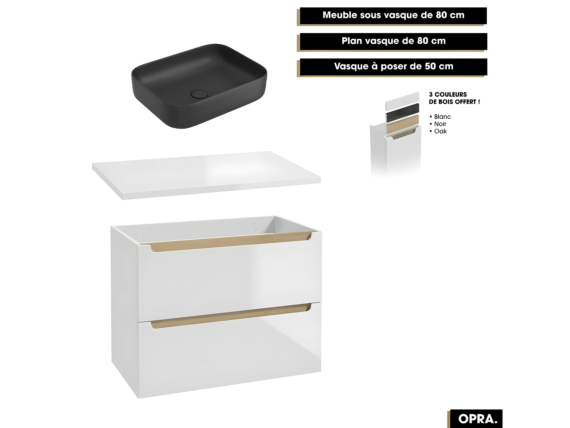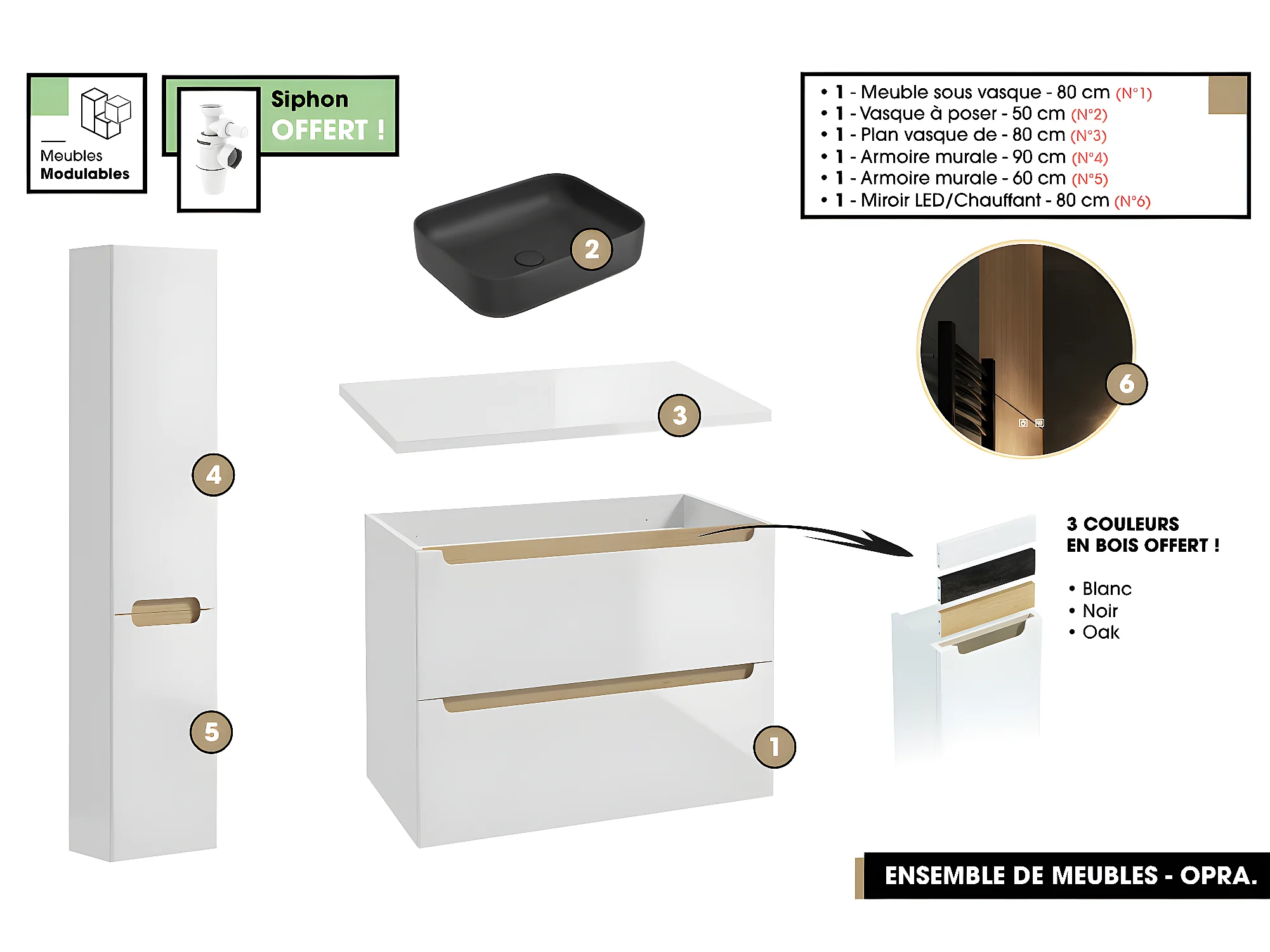 Ensemble complet de salle de bain - Meuble - Plan - Armoires - Miroir - Vasque à poser avec Siphon OFFERT | OPRA | 80 x 60 x 45 cm