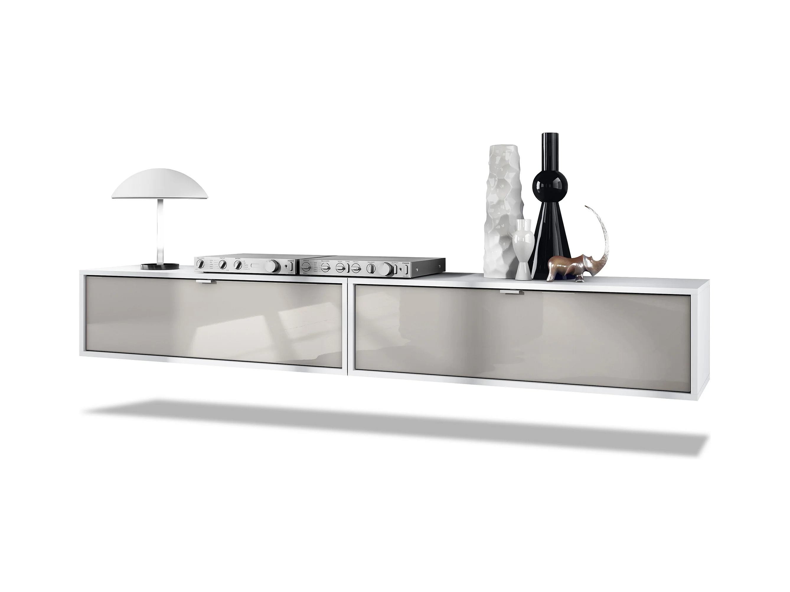 Ensemble de 2 set meuble TV Lana 100, lowboards de 100 x 29 x 37 cm chacun avec beaucoup d'espace de rangement, caisson en Blanc mat, façades en Gris sable brillant