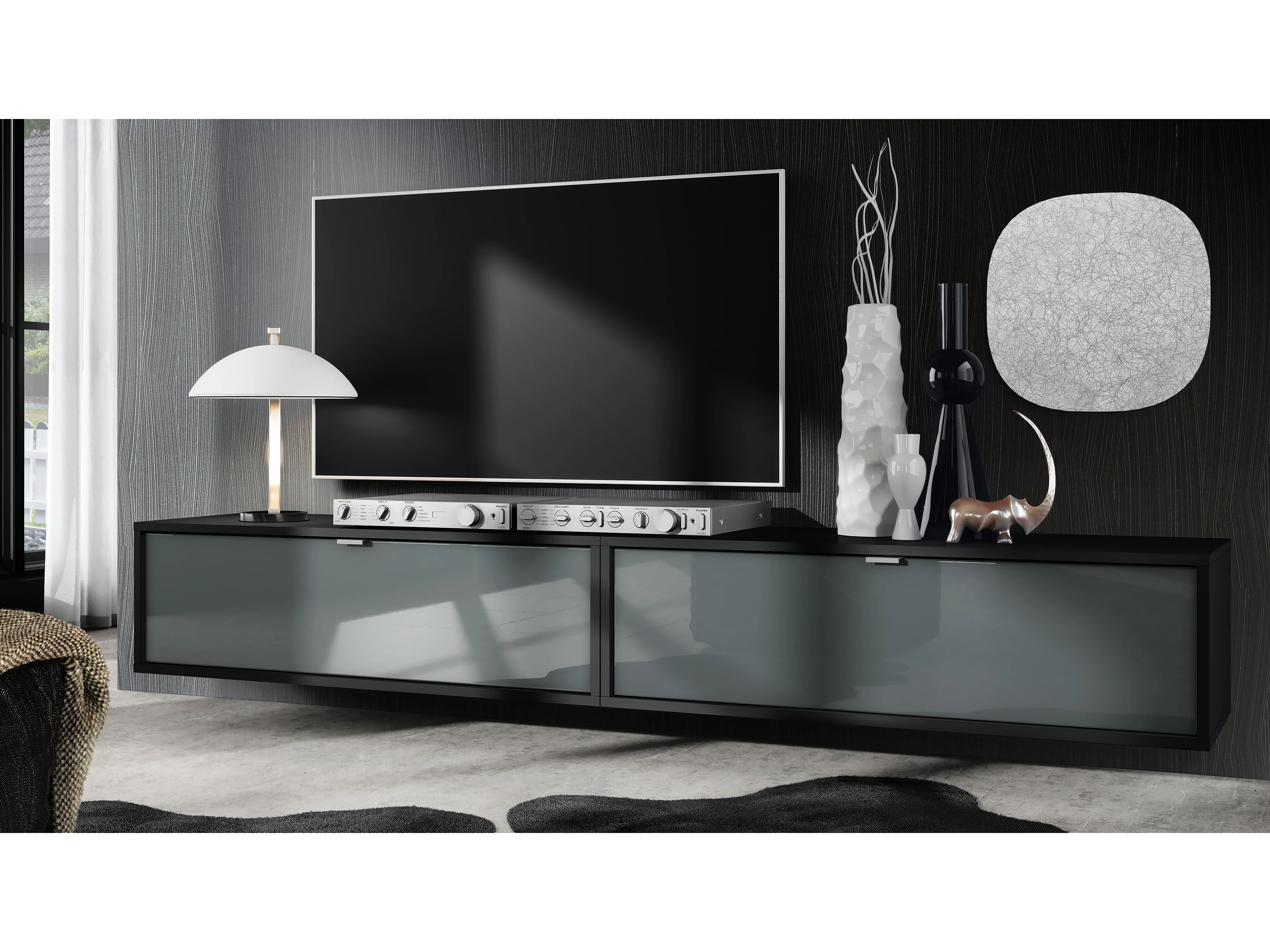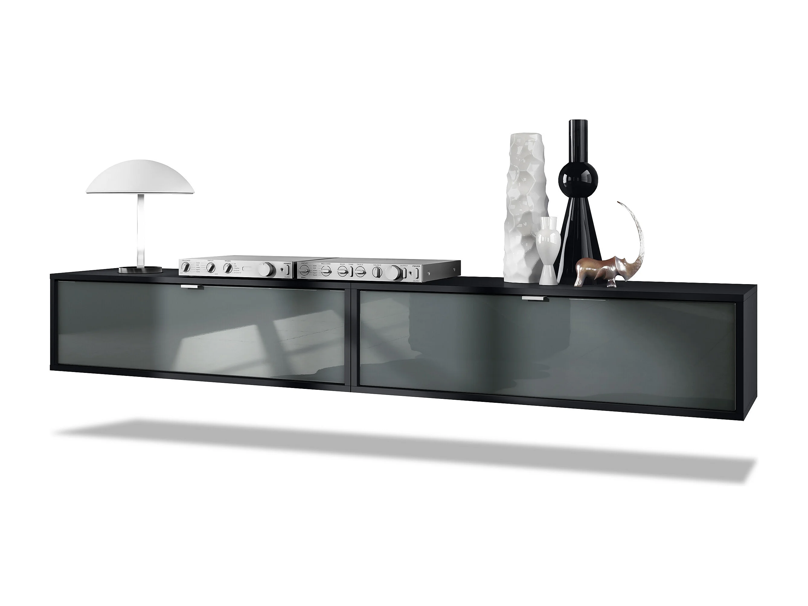 Ensemble de 2 set meuble TV Lana 100, lowboards de 100 x 29 x 37 cm chacun avec beaucoup d'espace de rangement, caisson en Noir mat, façades en Gris haute brillance