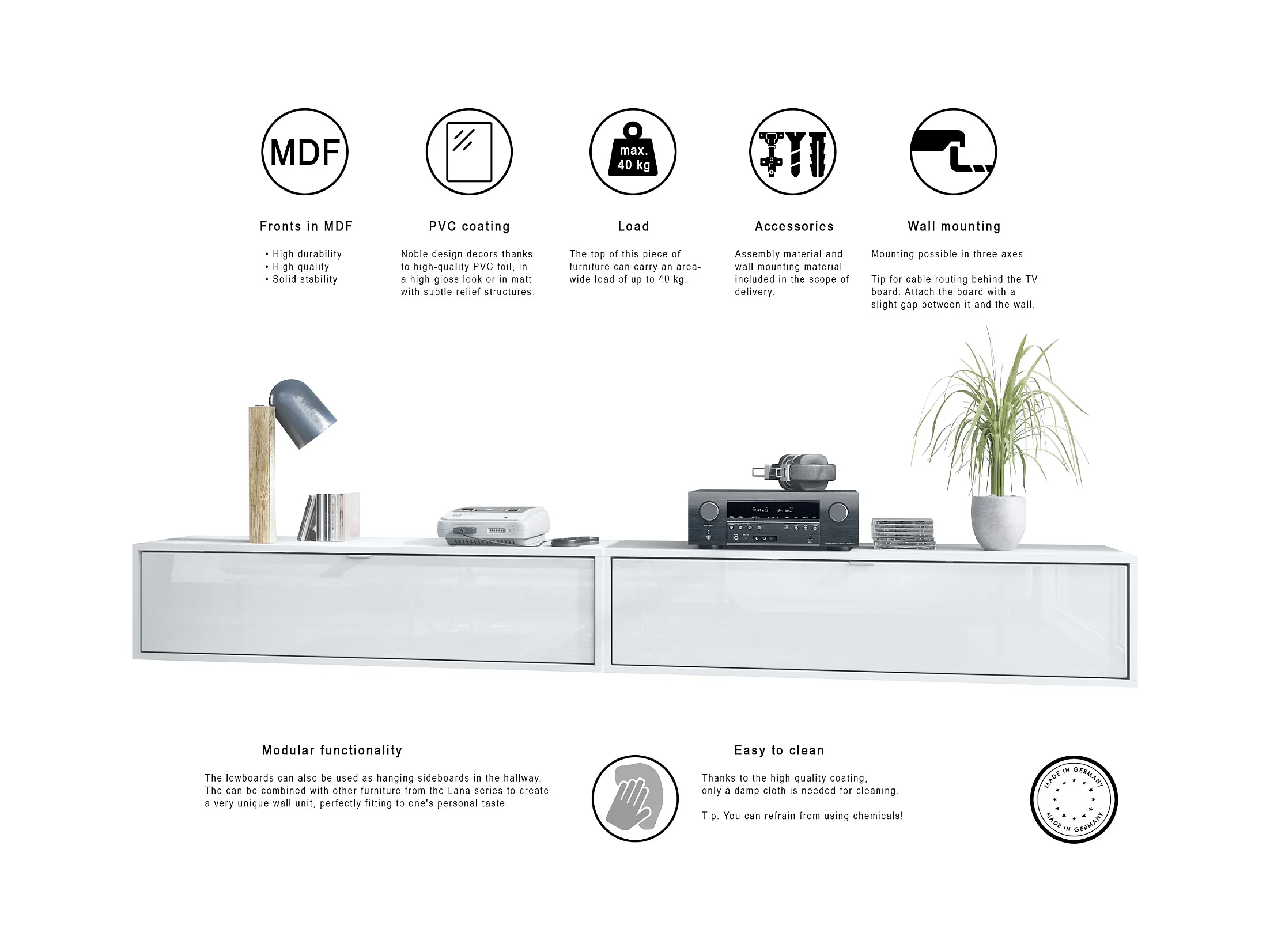 Ensemble de 2 set meuble TV Lana 120, lowboards de 120 x 29 x 37 cm chacun avec beaucoup d'espace de rangement, caisson en Blanc mat, façades en Gris sable brillant
