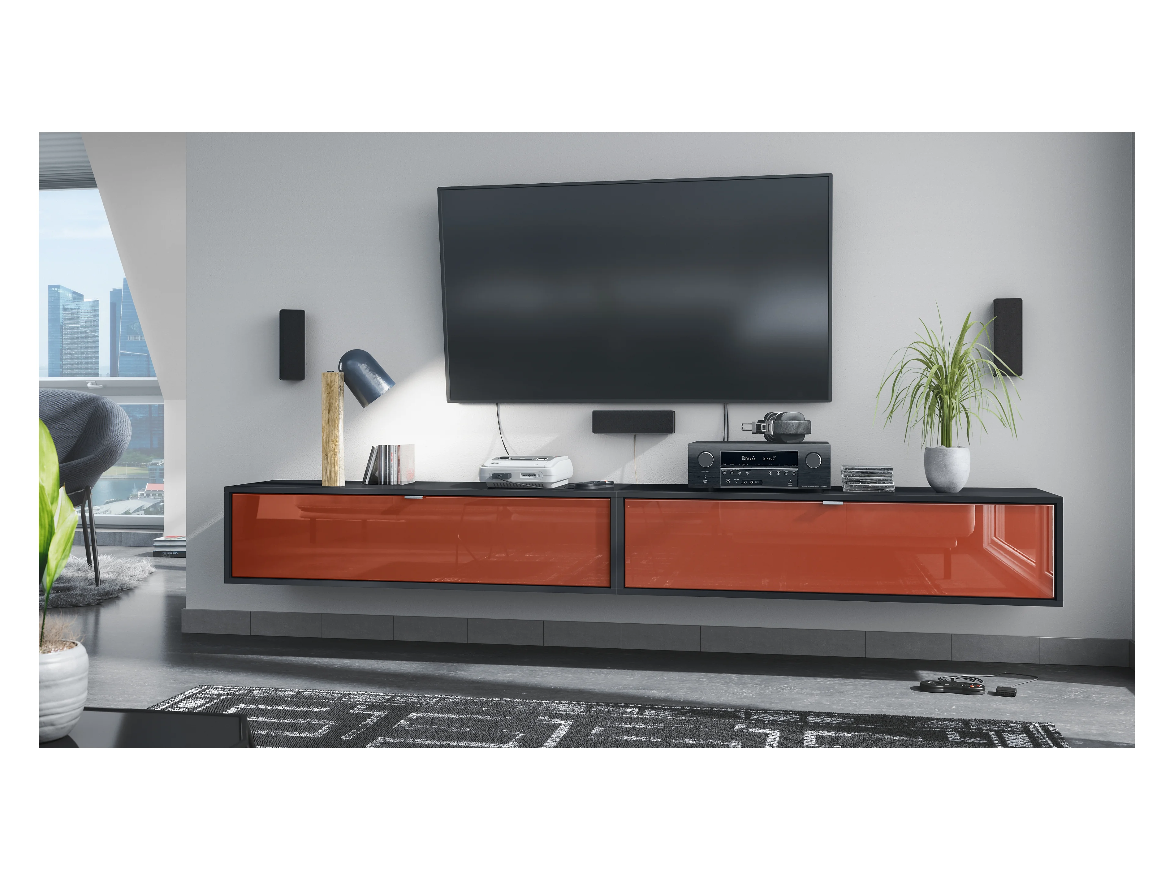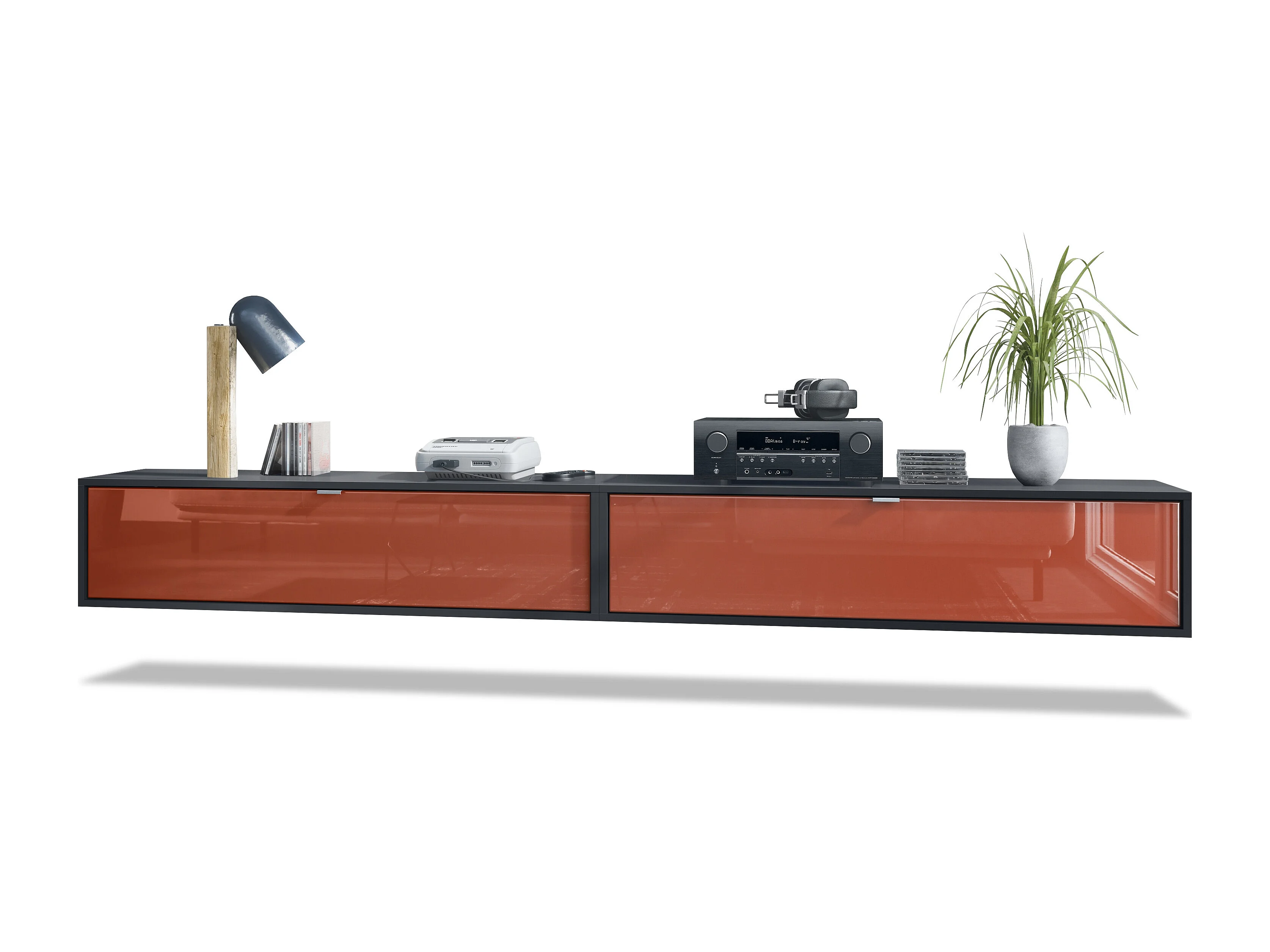 Ensemble de 2 set meuble TV Lana 120, lowboards de 120 x 29 x 37 cm chacun avec beaucoup d'espace de rangement, caisson en Noir mat, façades en Bordeaux brillant