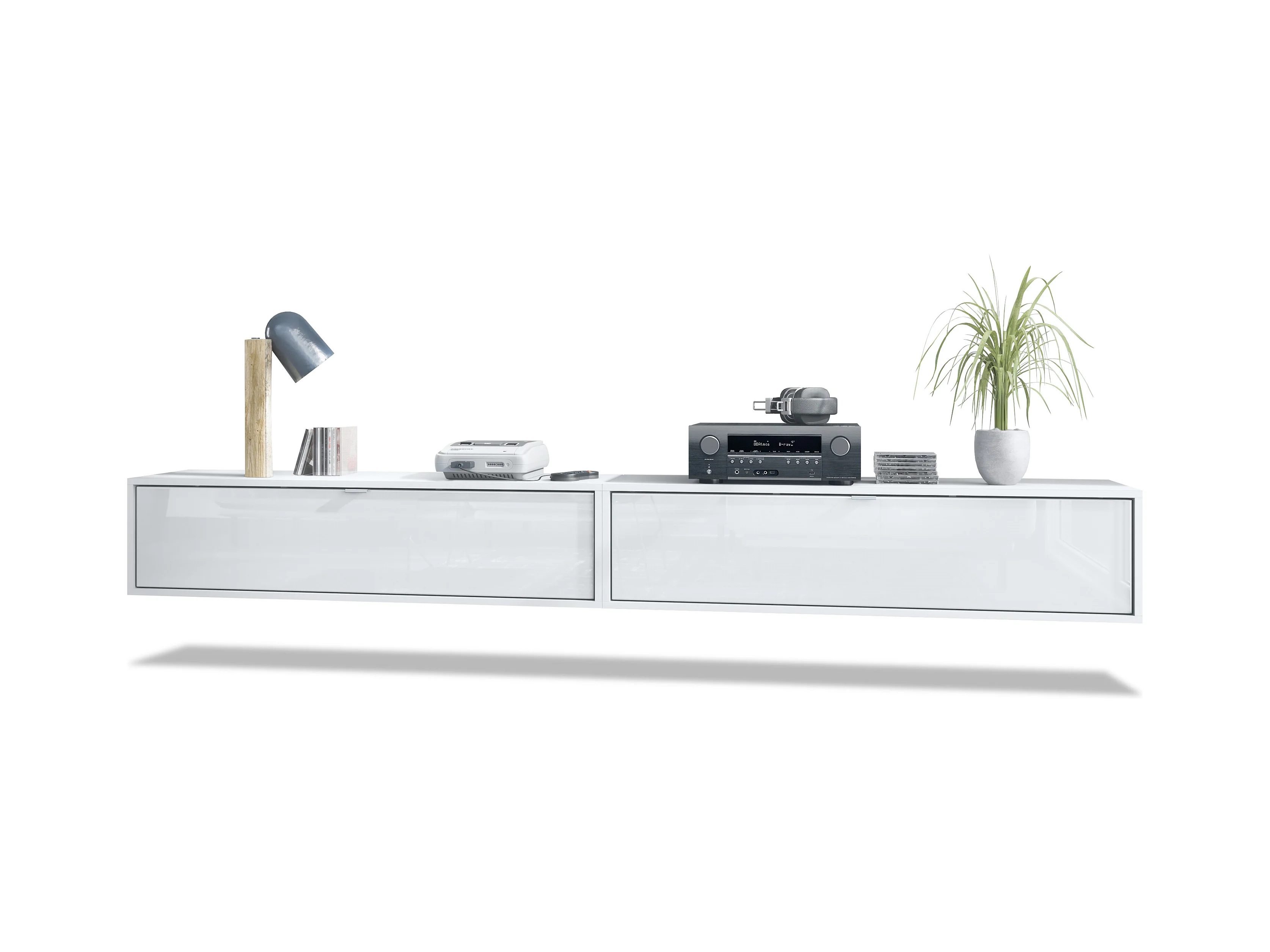 Ensemble de 2 set meuble TV Lana 120, lowboards de 120x29x37 cm chacun avec beaucoup d'espace de rangement, caisson en Blanc mat, façades en Blanc brillant