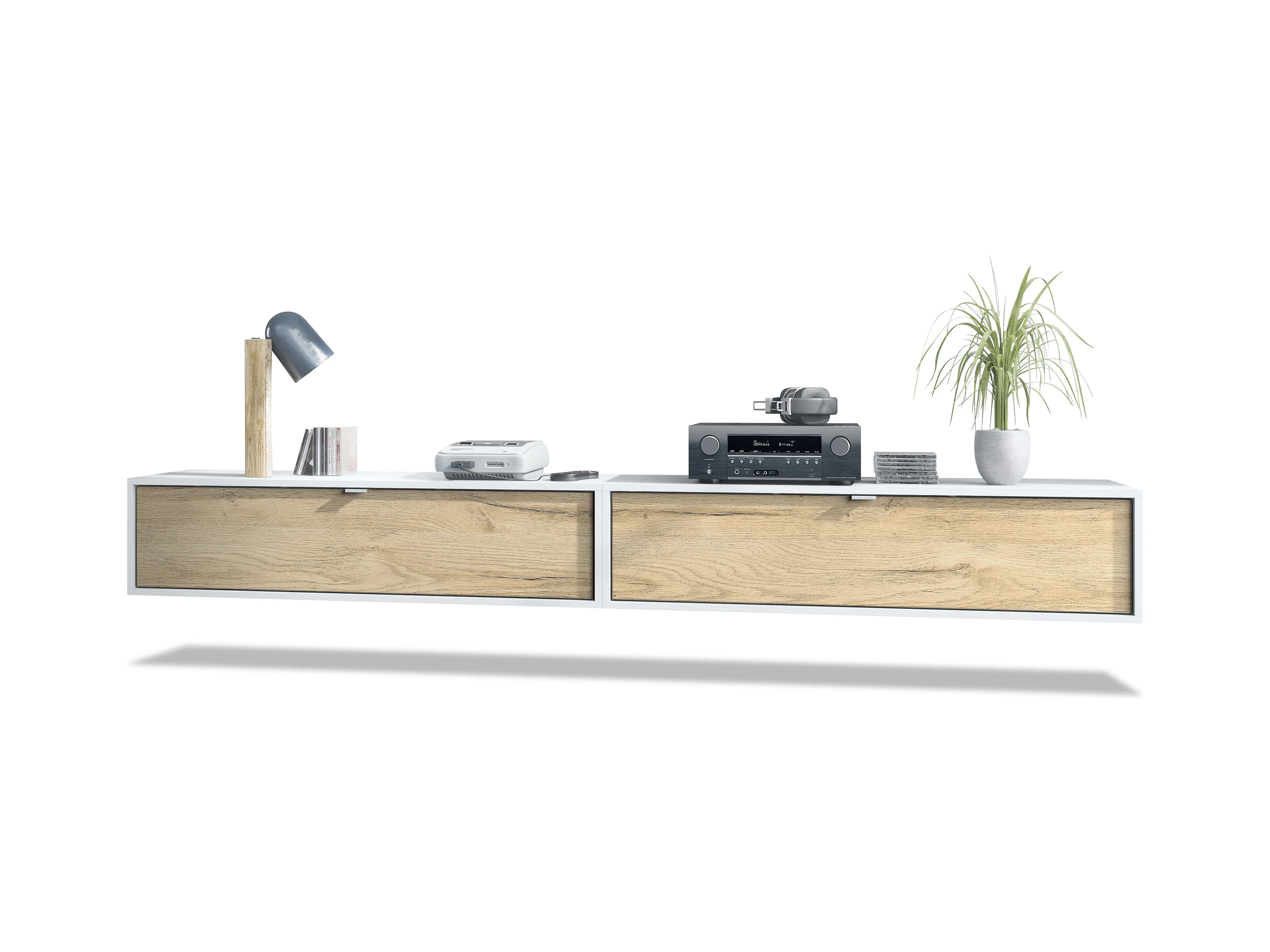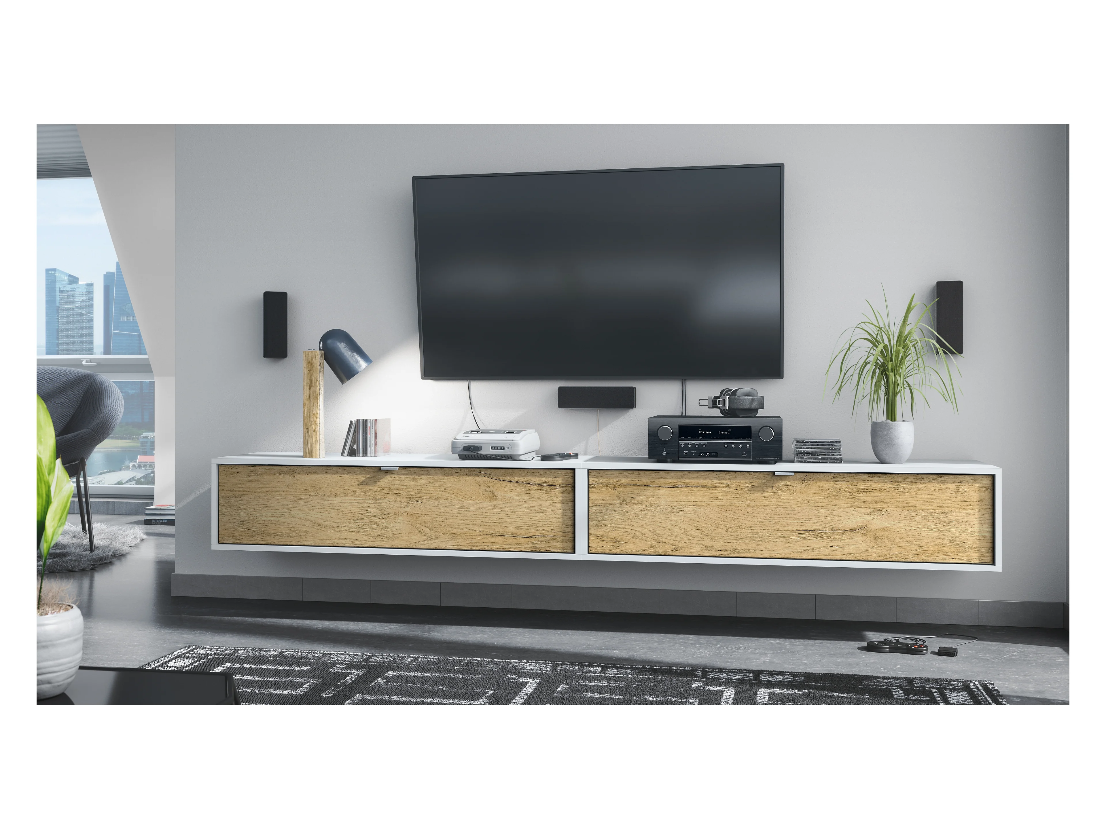Ensemble de 2 set meuble TV Lana 120, lowboards de 120x29x37 cm chacun avec beaucoup d'espace de rangement, caisson en Blanc mat, façades en Chêne Nature