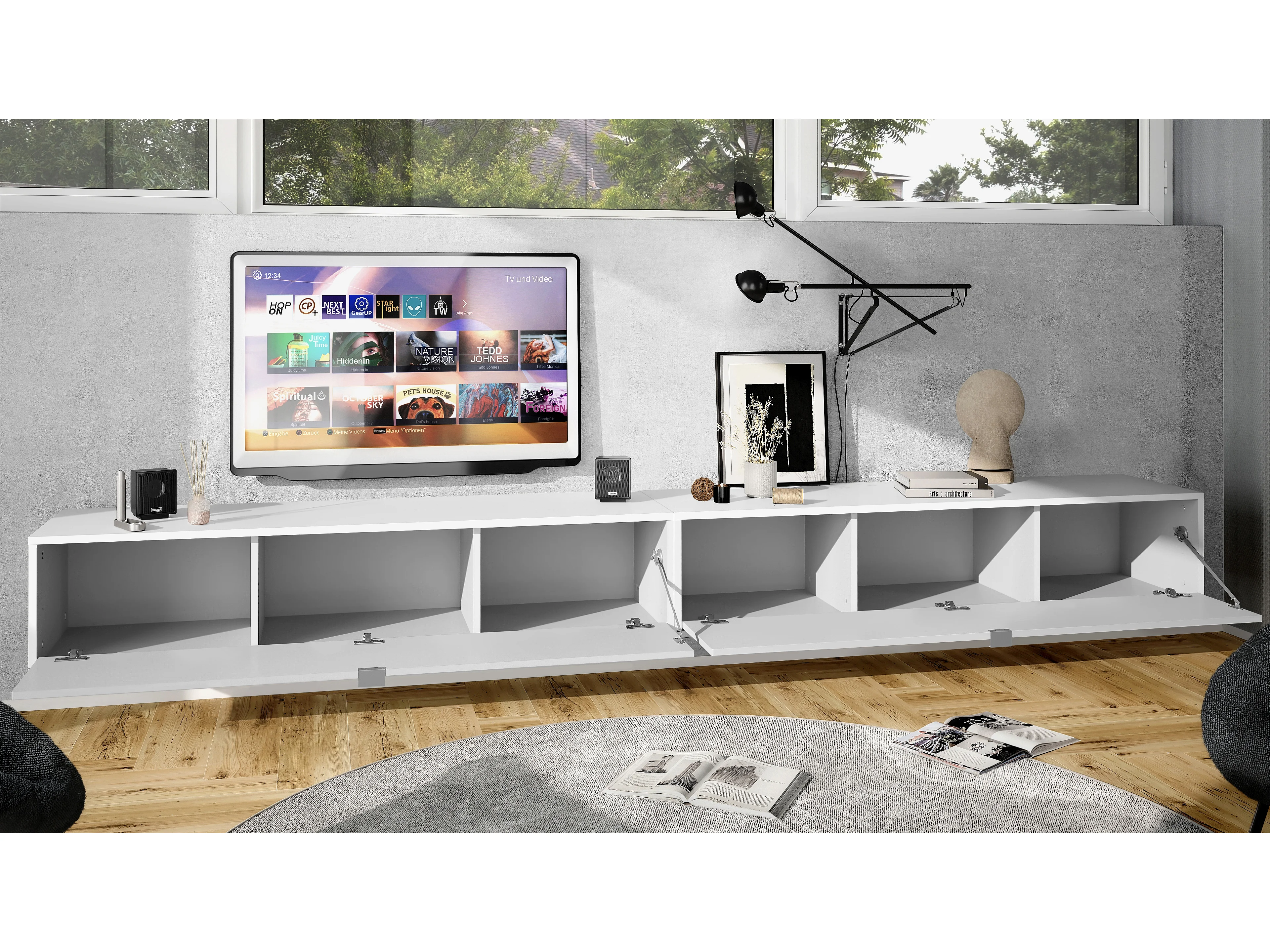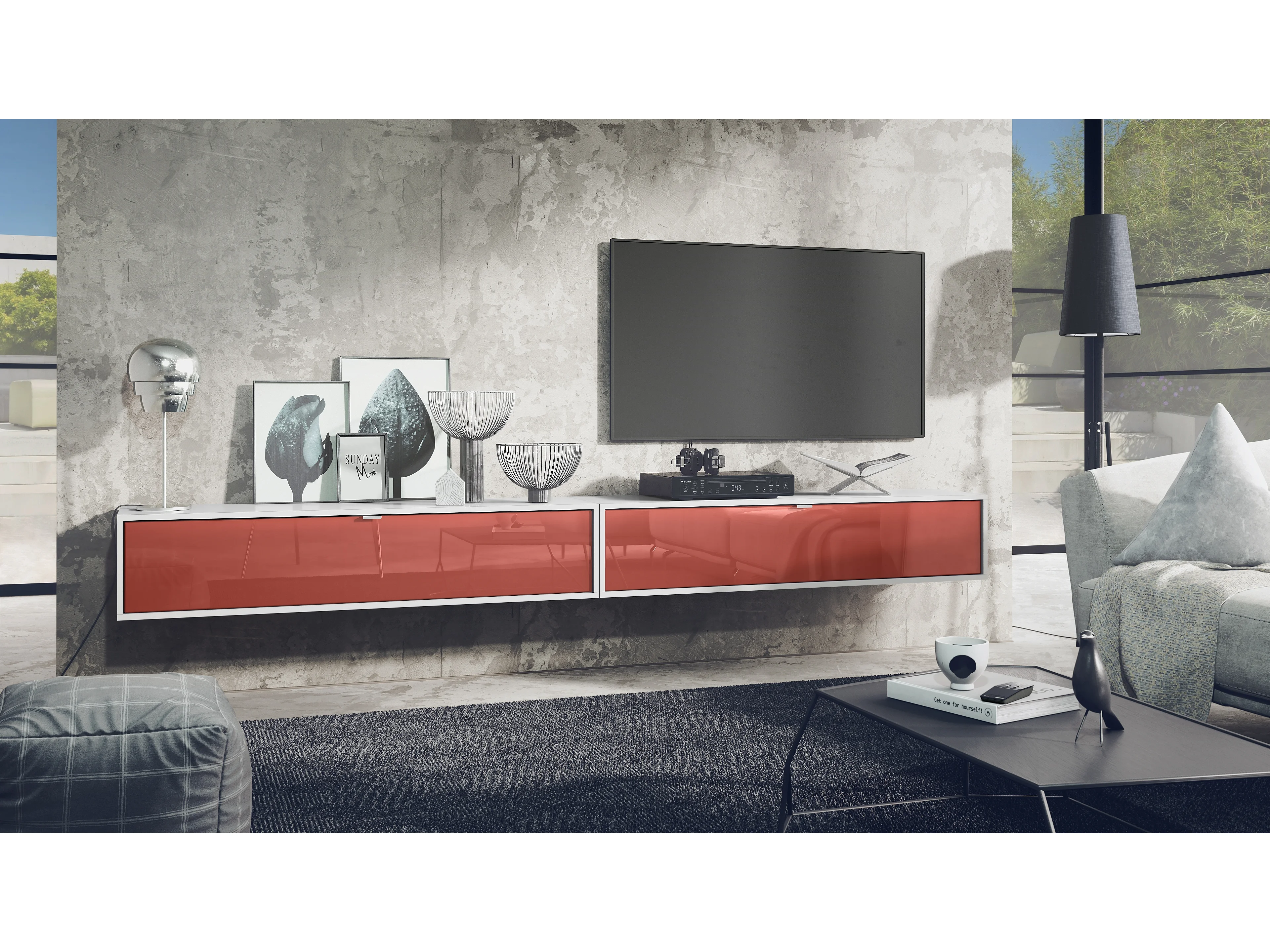 Ensemble de 2 set meuble TV Lana 140, lowboards de 140 x 29 x 37 cm chacun avec beaucoup d'espace de rangement, caisson en Blanc mat, façades en Bordeaux brillant