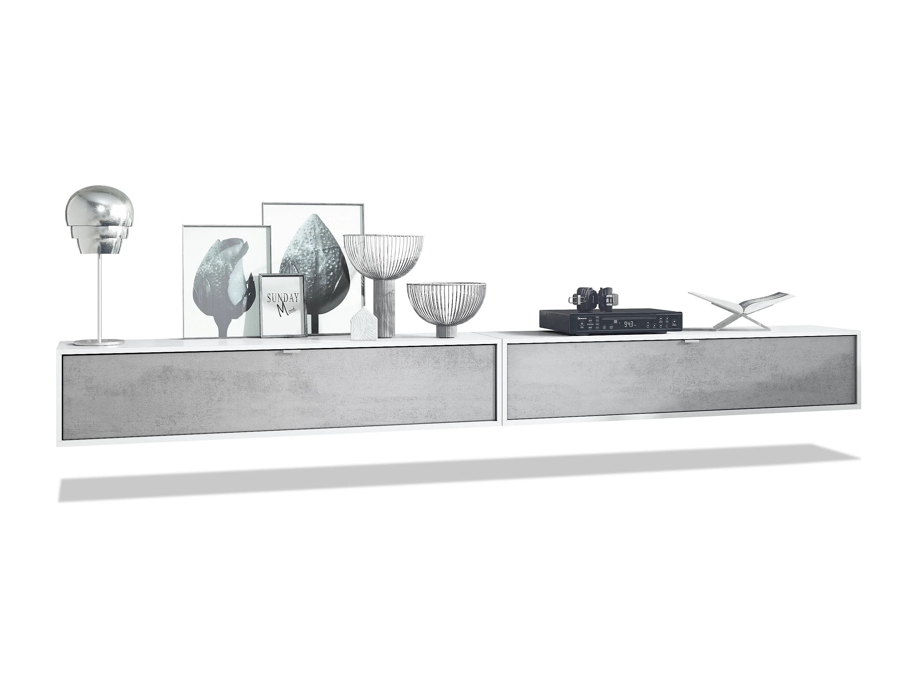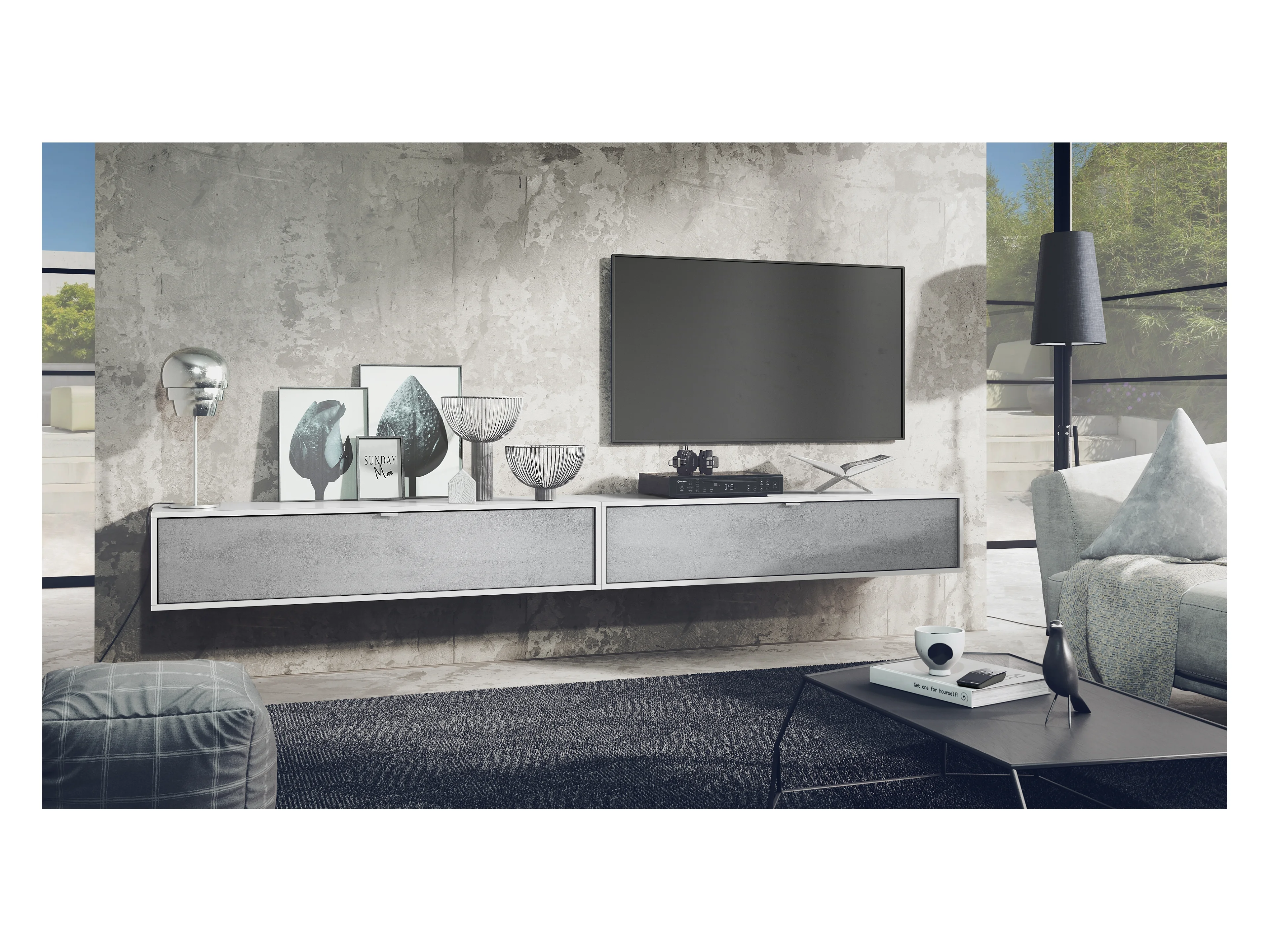 Ensemble de 2 set meuble TV Lana 140, lowboards de 140x29x37 cm chacun avec beaucoup d'espace de rangement, caisson en Blanc mat, façades en Aspect Béton Oxyde