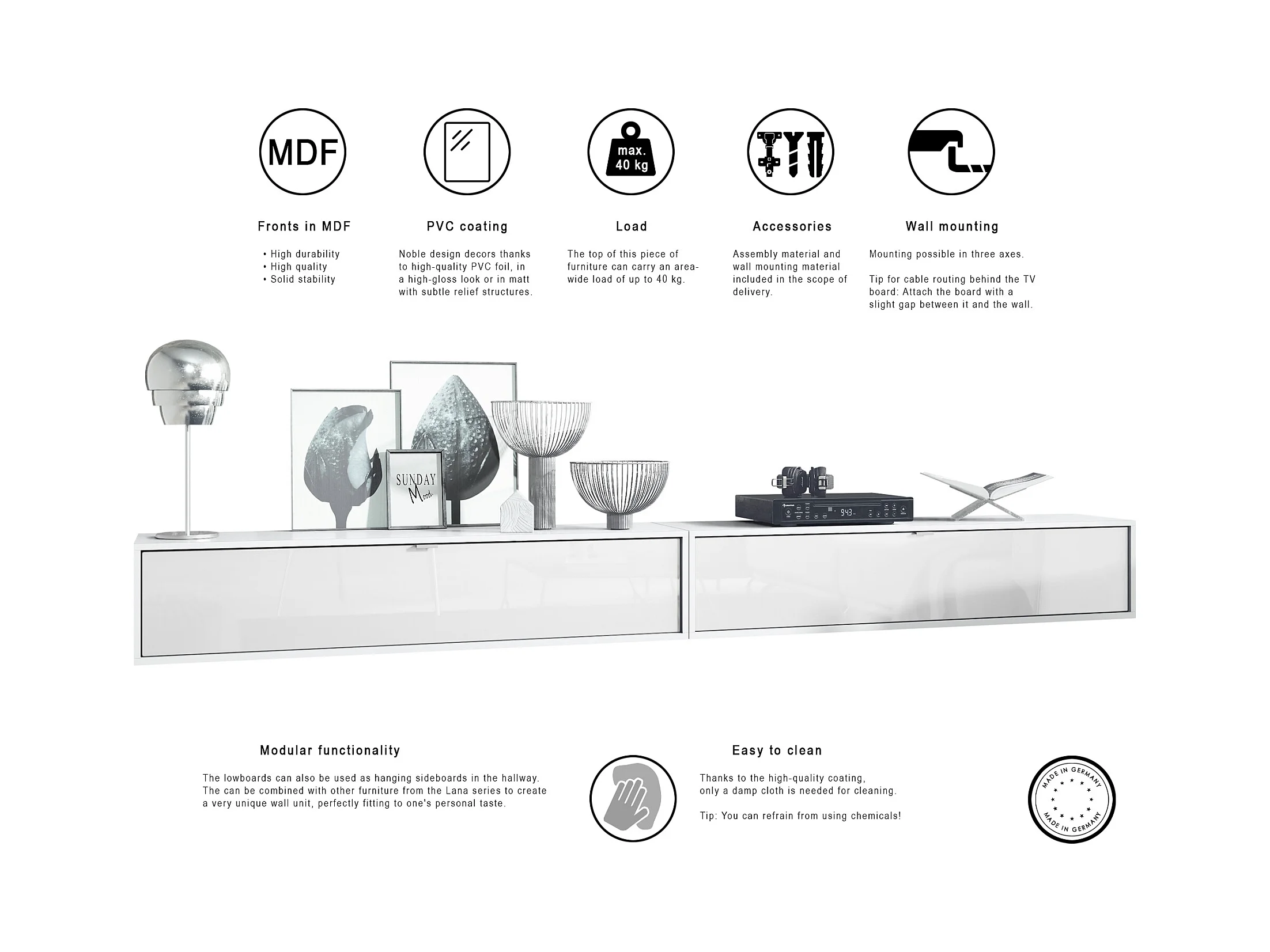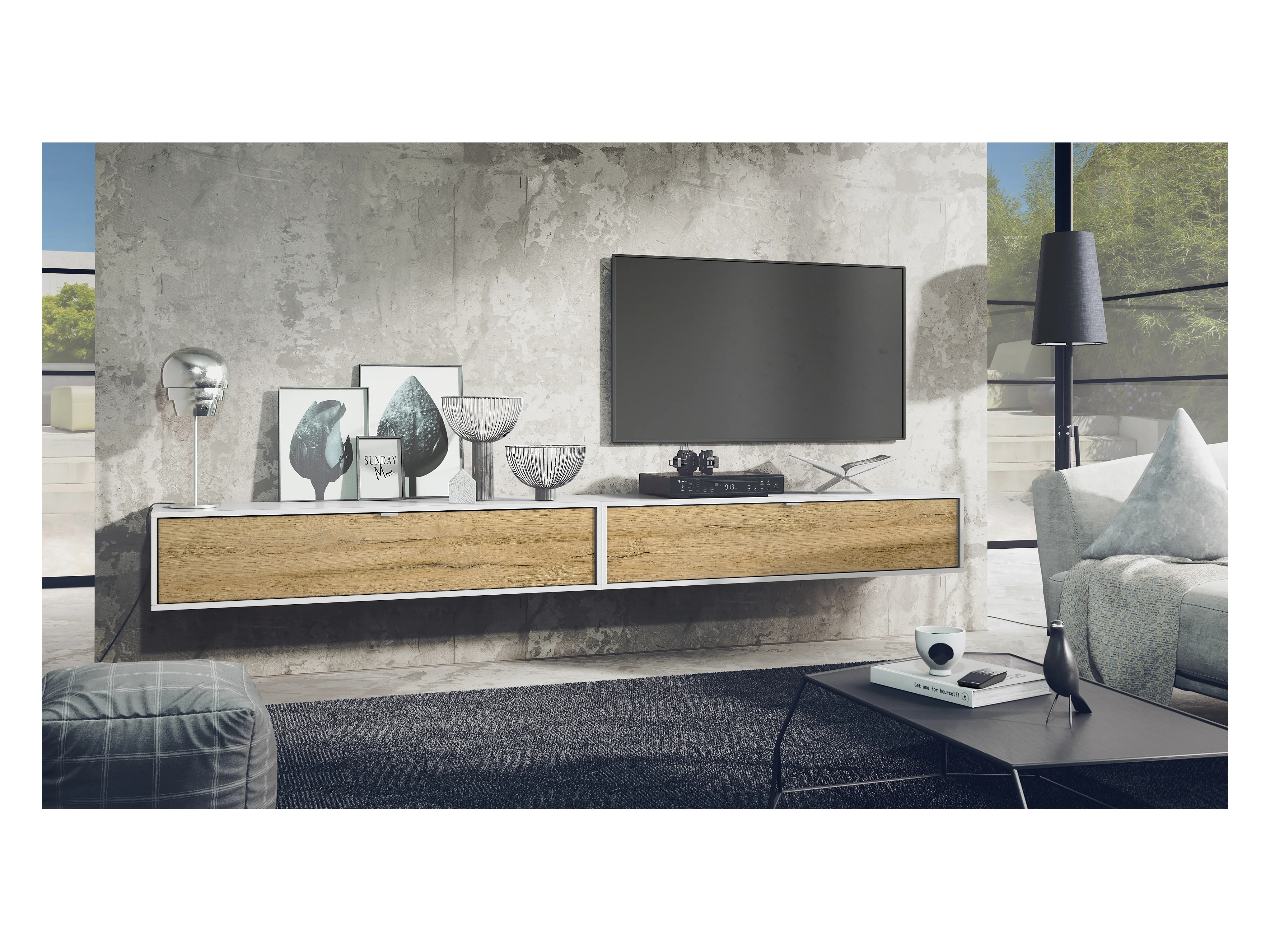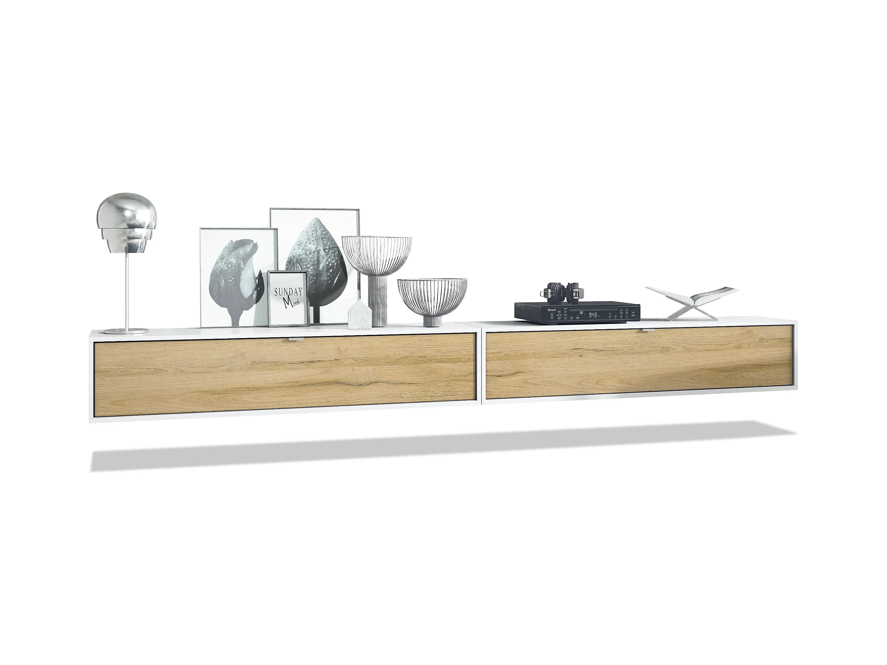 Ensemble de 2 set meuble TV Lana 140, lowboards de 140x29x37 cm chacun avec beaucoup d'espace de rangement, caisson en Blanc mat, façades en Chêne Nature