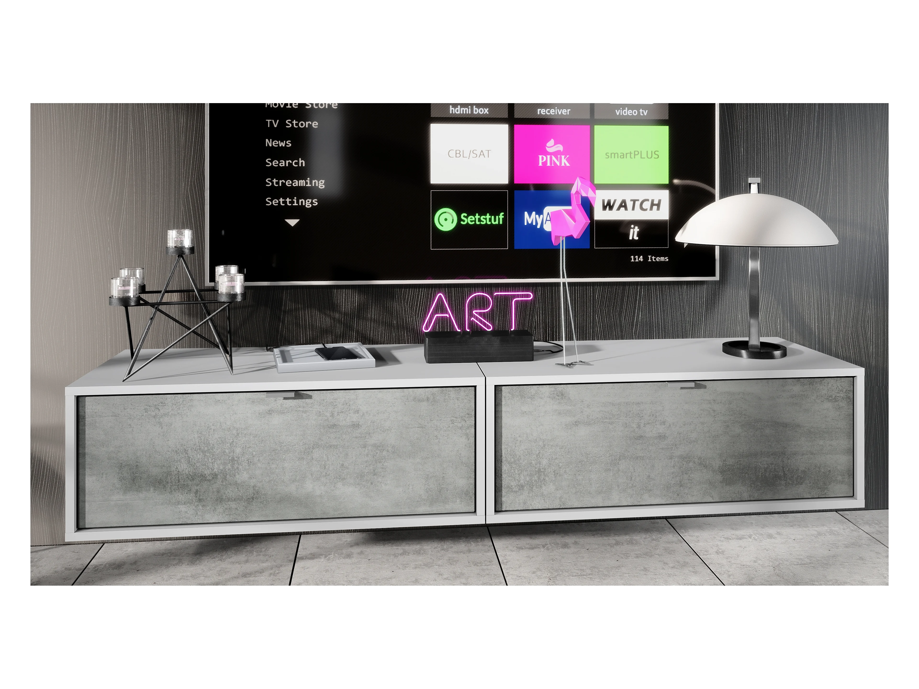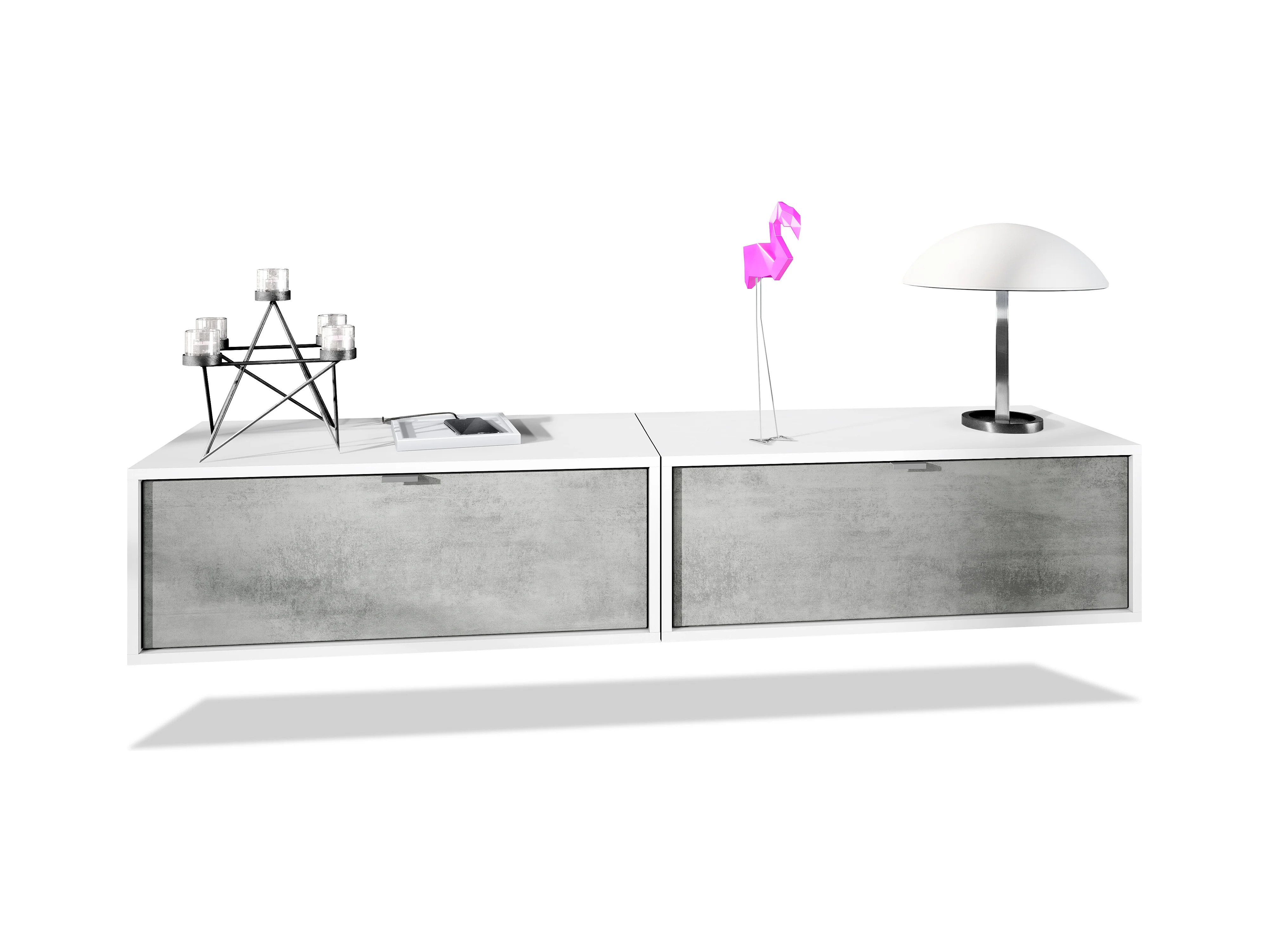 Ensemble de 2 set meuble TV Lana 80, lowboards de 80 x 29 x 37 cm chacun avec beaucoup d'espace de rangement, caisson en Blanc mat, façades en Aspect Béton Oxyde