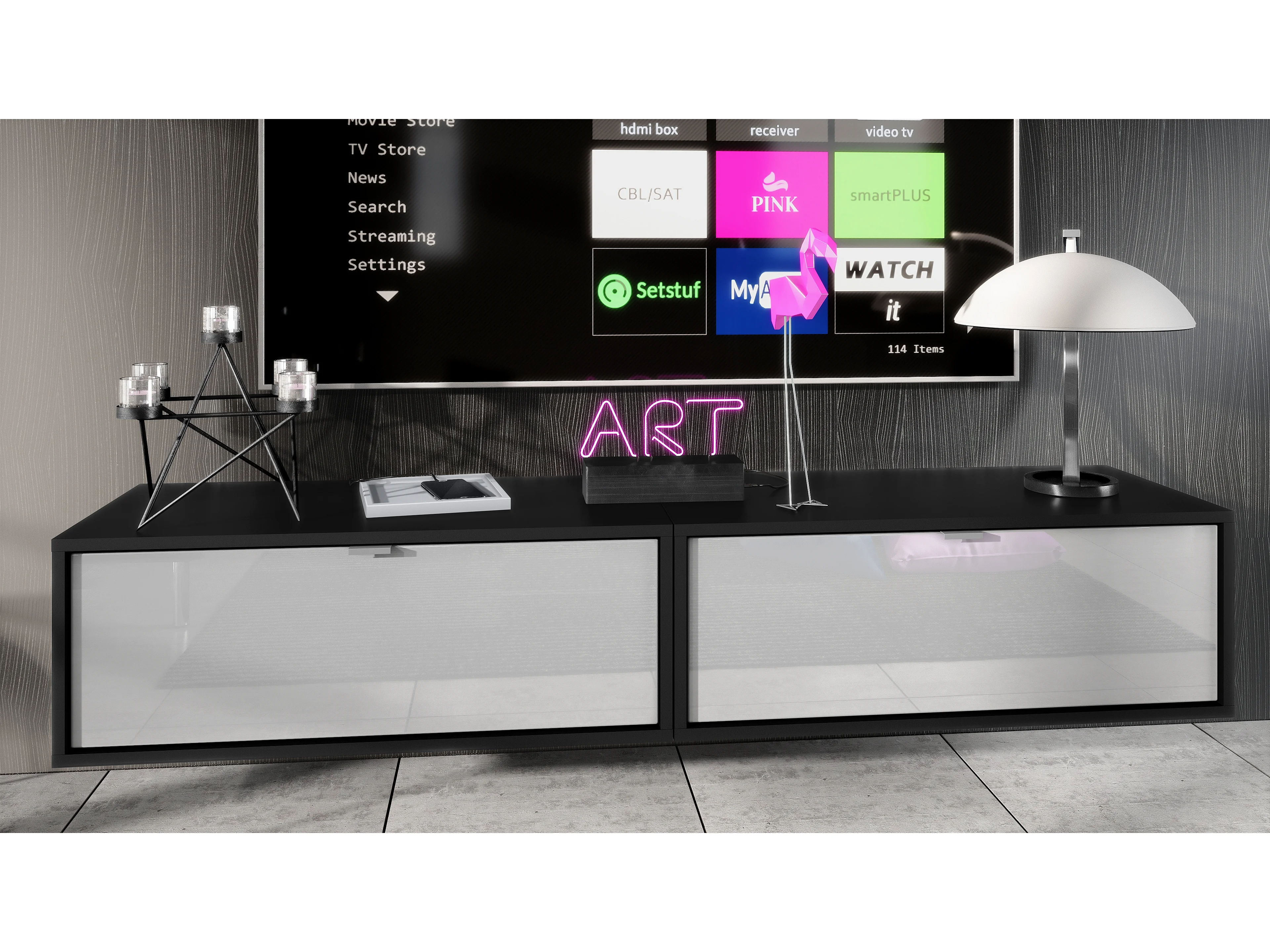 Ensemble de 2 set meuble TV Lana 80, lowboards de 80 x 29 x 37 cm chacun avec beaucoup d'espace de rangement, caisson en Noir mat, façades en Blanc haute brillance