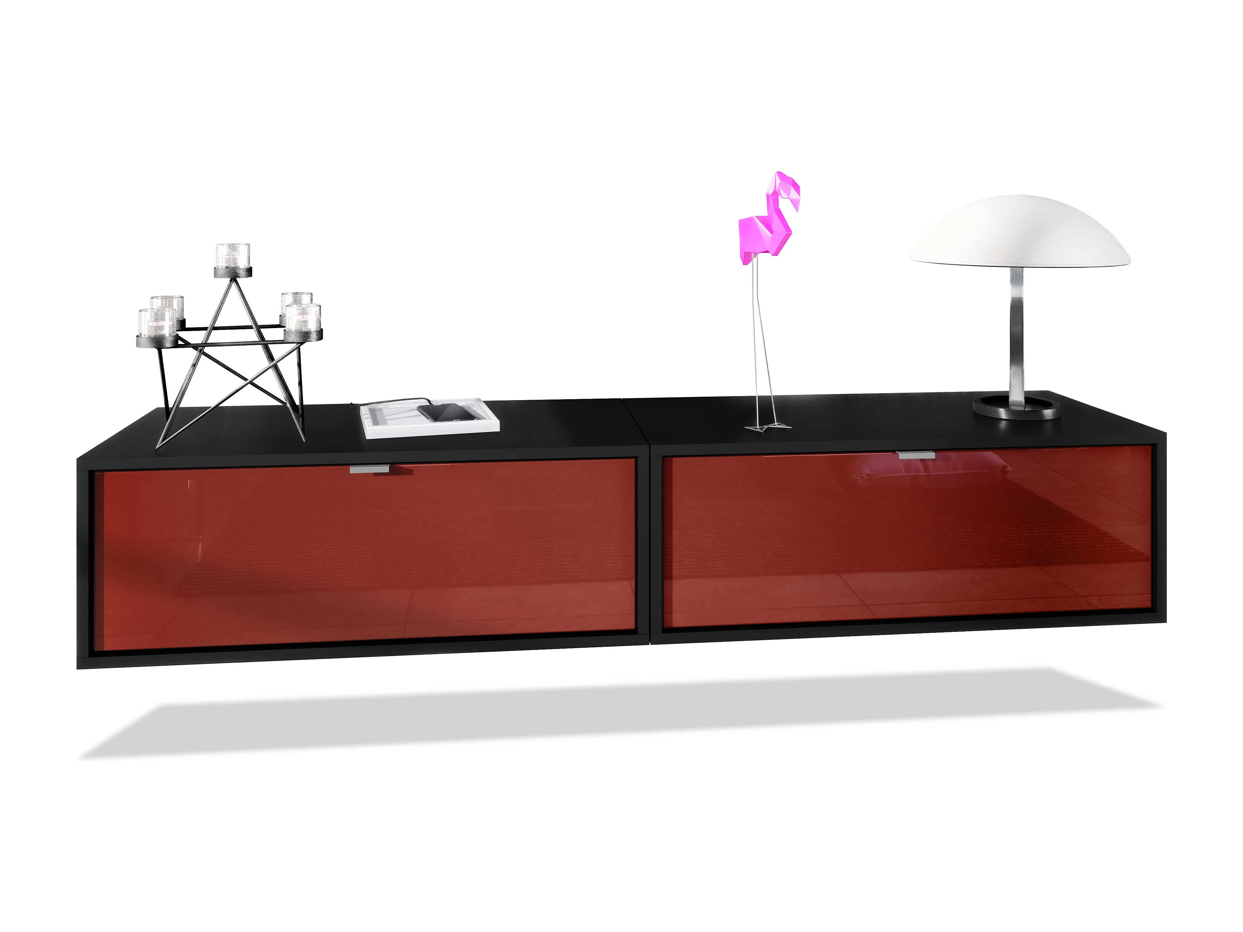 Ensemble de 2 set meuble TV Lana 80, lowboards de 80 x 29 x 37 cm chacun avec beaucoup d'espace de rangement, caisson en Noir mat, façades en Bordeaux brillant