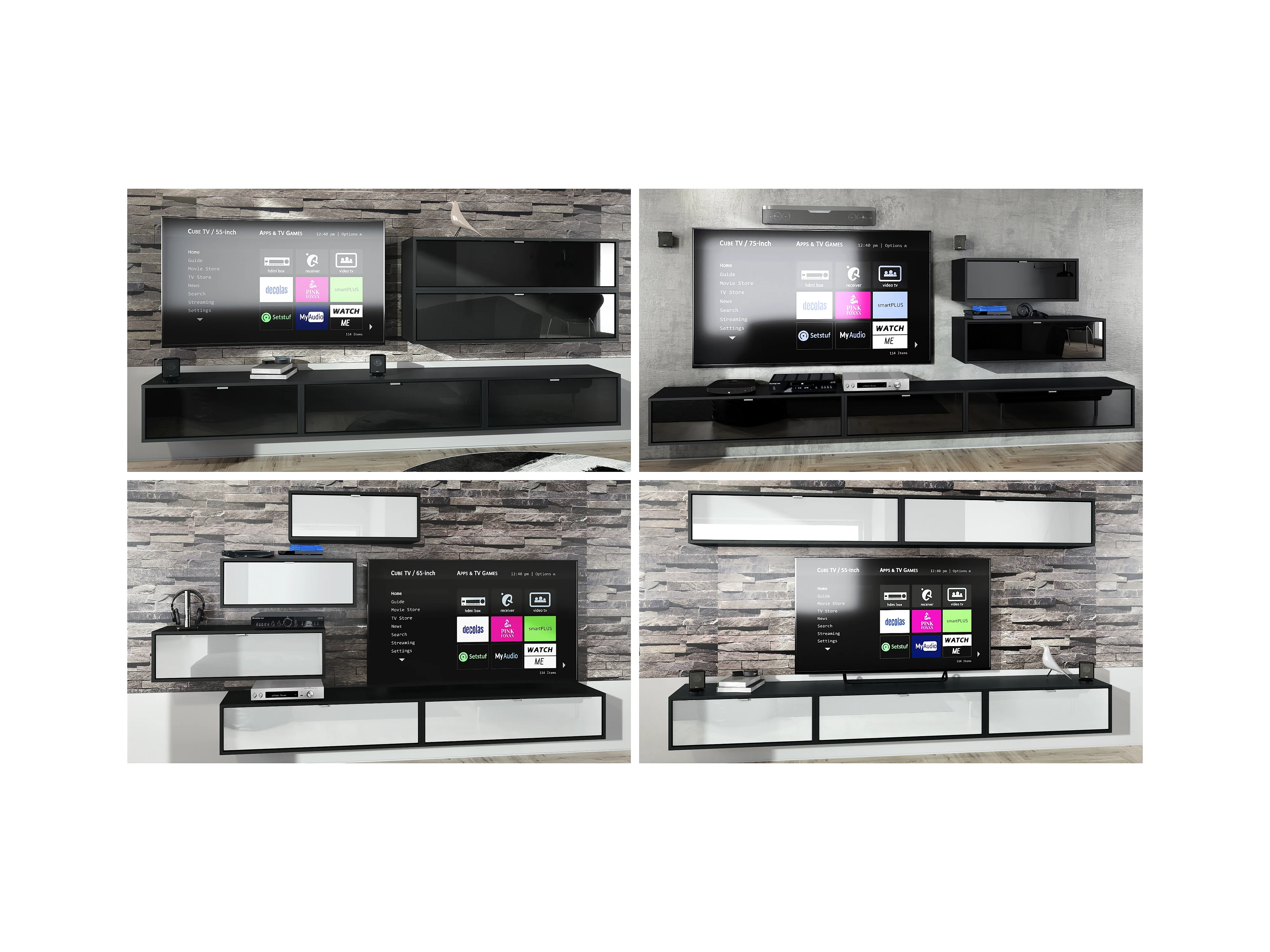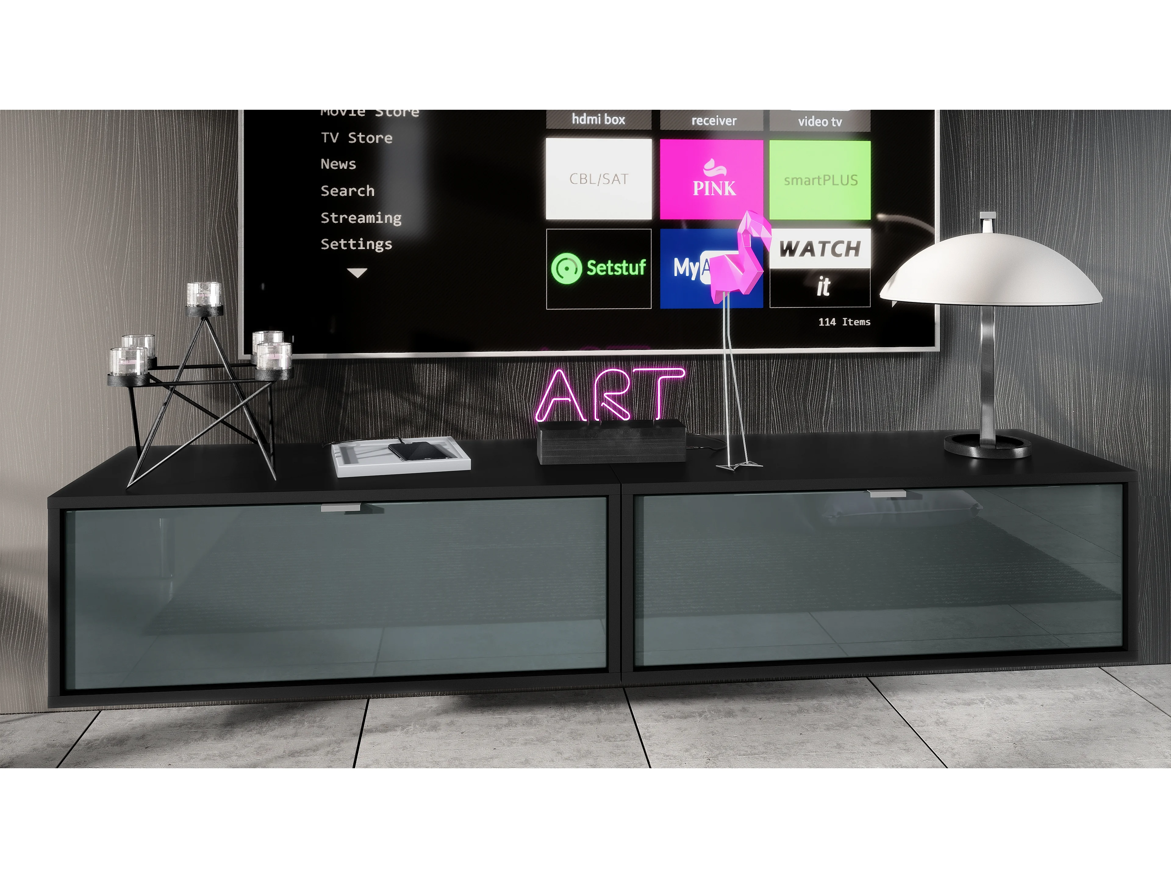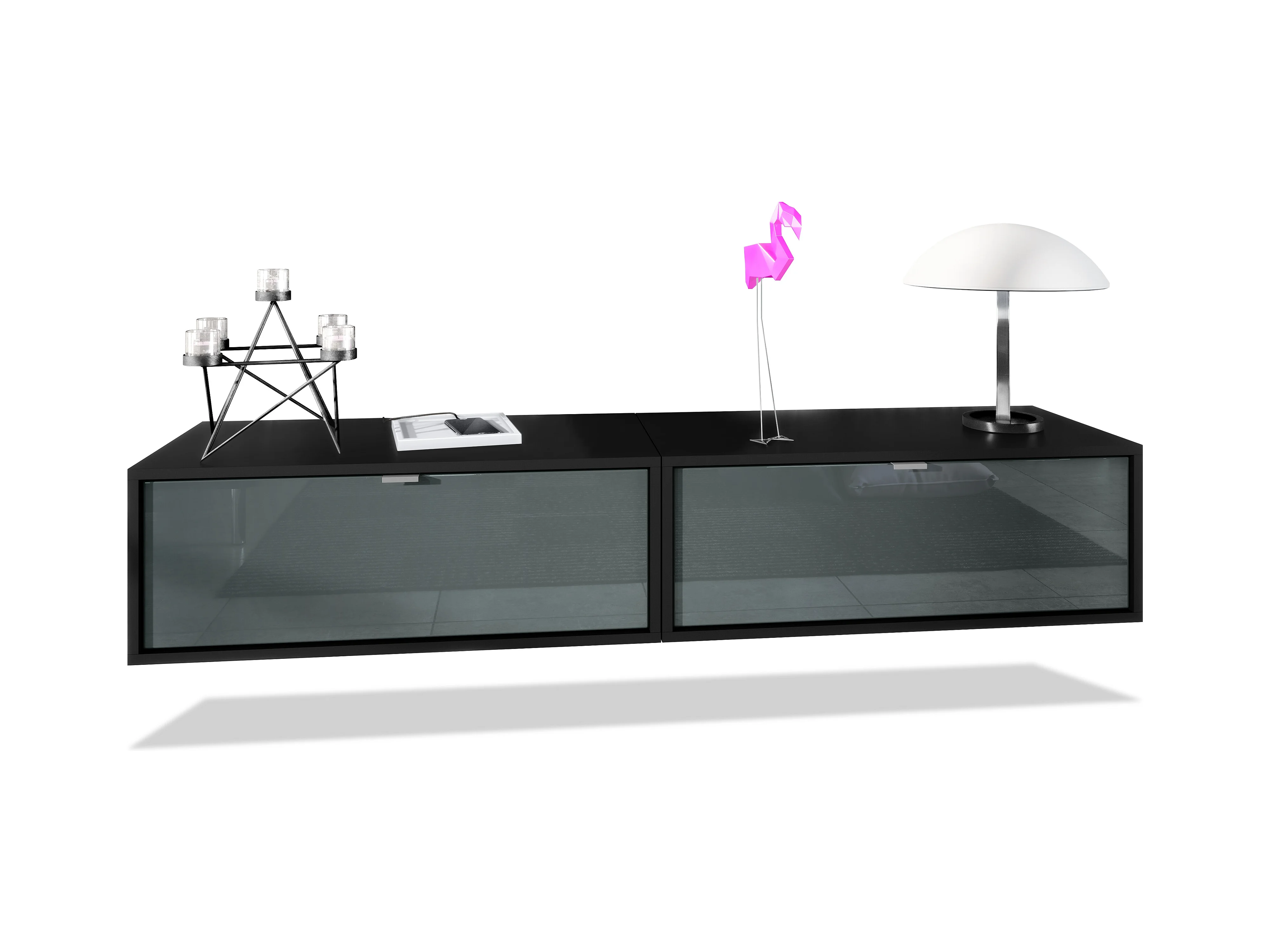 Ensemble de 2 set meuble TV Lana 80, lowboards de 80 x 29 x 37 cm chacun avec beaucoup d'espace de rangement, caisson en Noir mat, façades en Gris haute brillance
