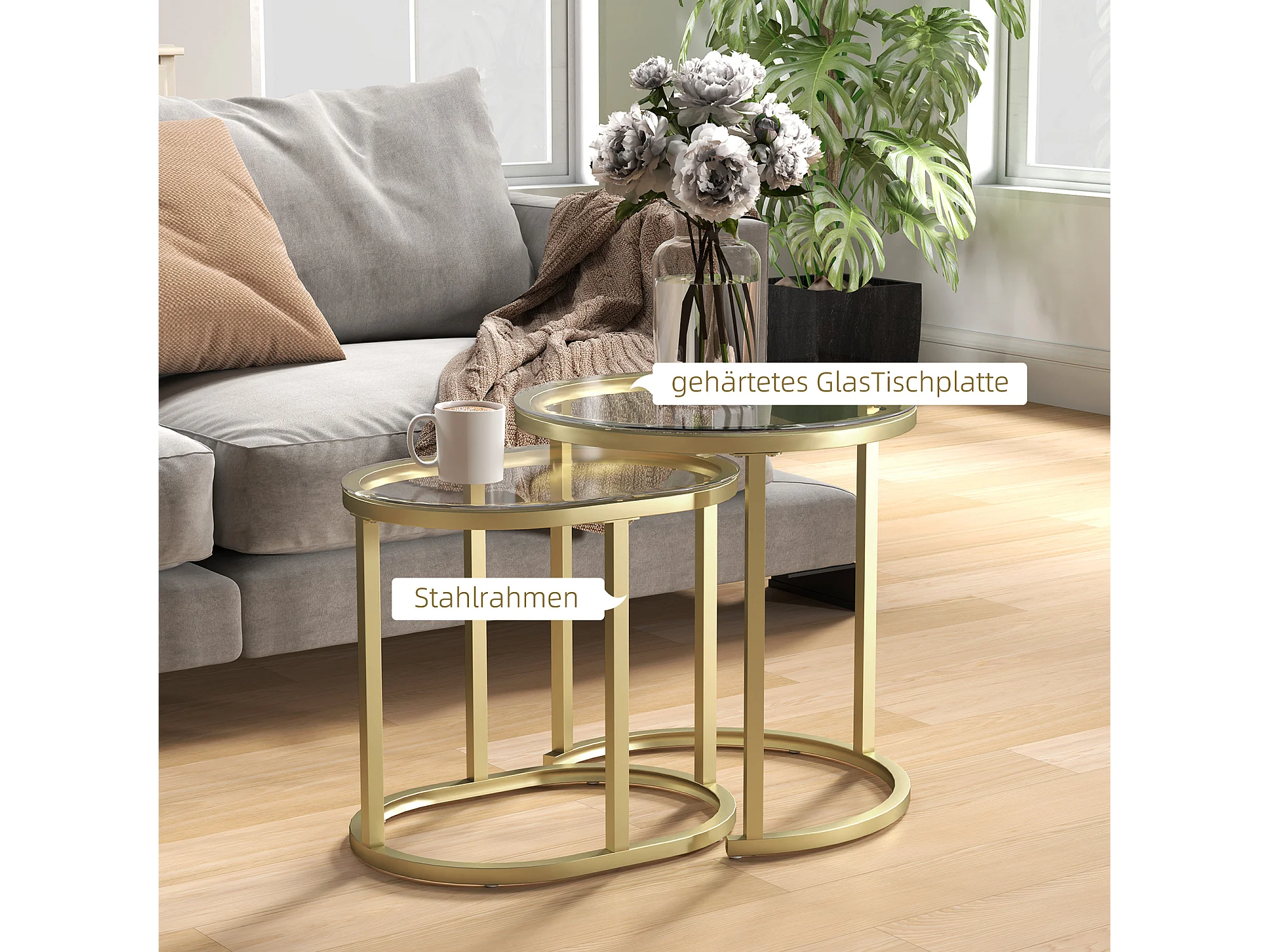 Lot de 2 tables basses tables d'appoint gigognes encastrables structure en acier et plateau verre trempé transparent or