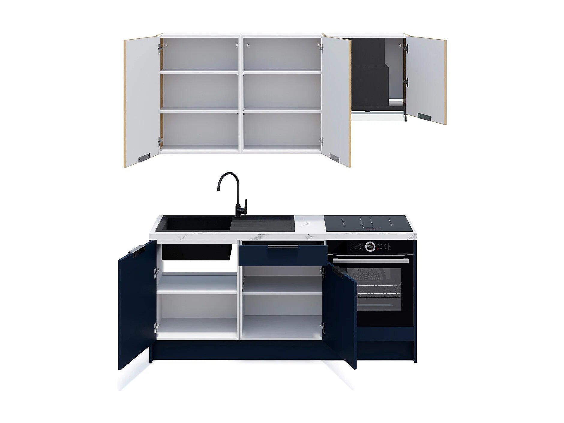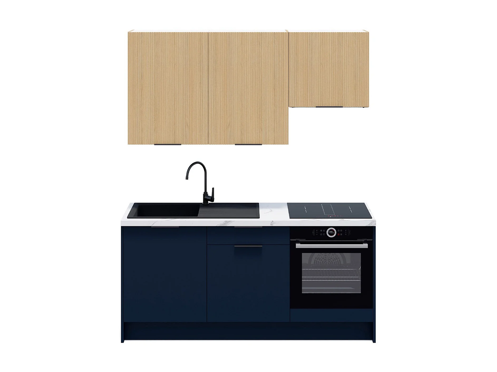 Ensemble de 6 meubles de cuisine - L. 185 cm - bleu marine et chêne clair cannelé - Luzia Mix