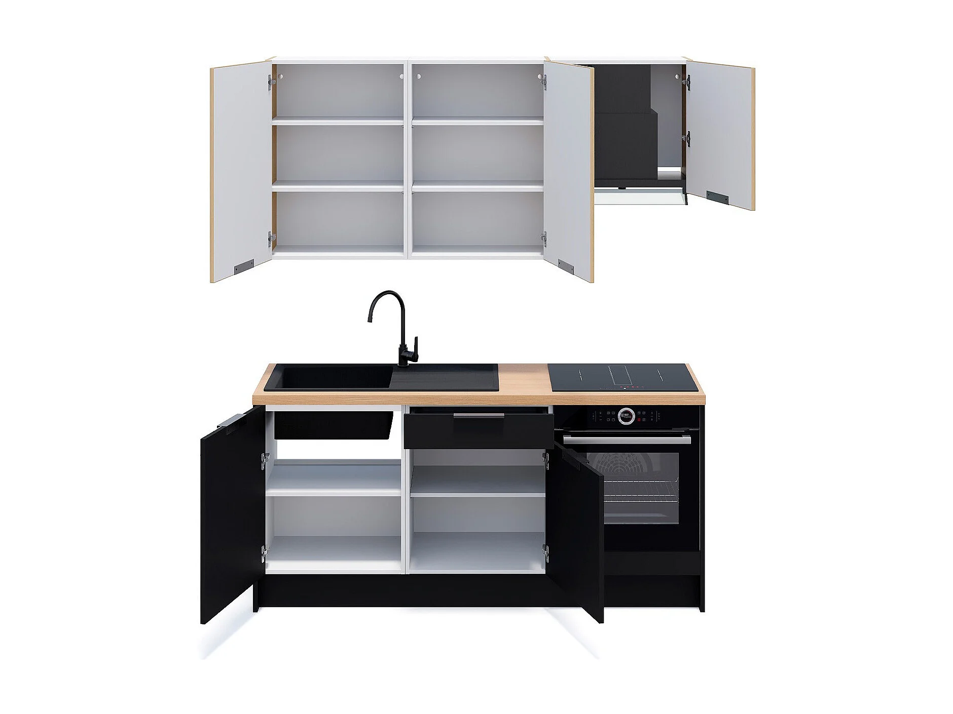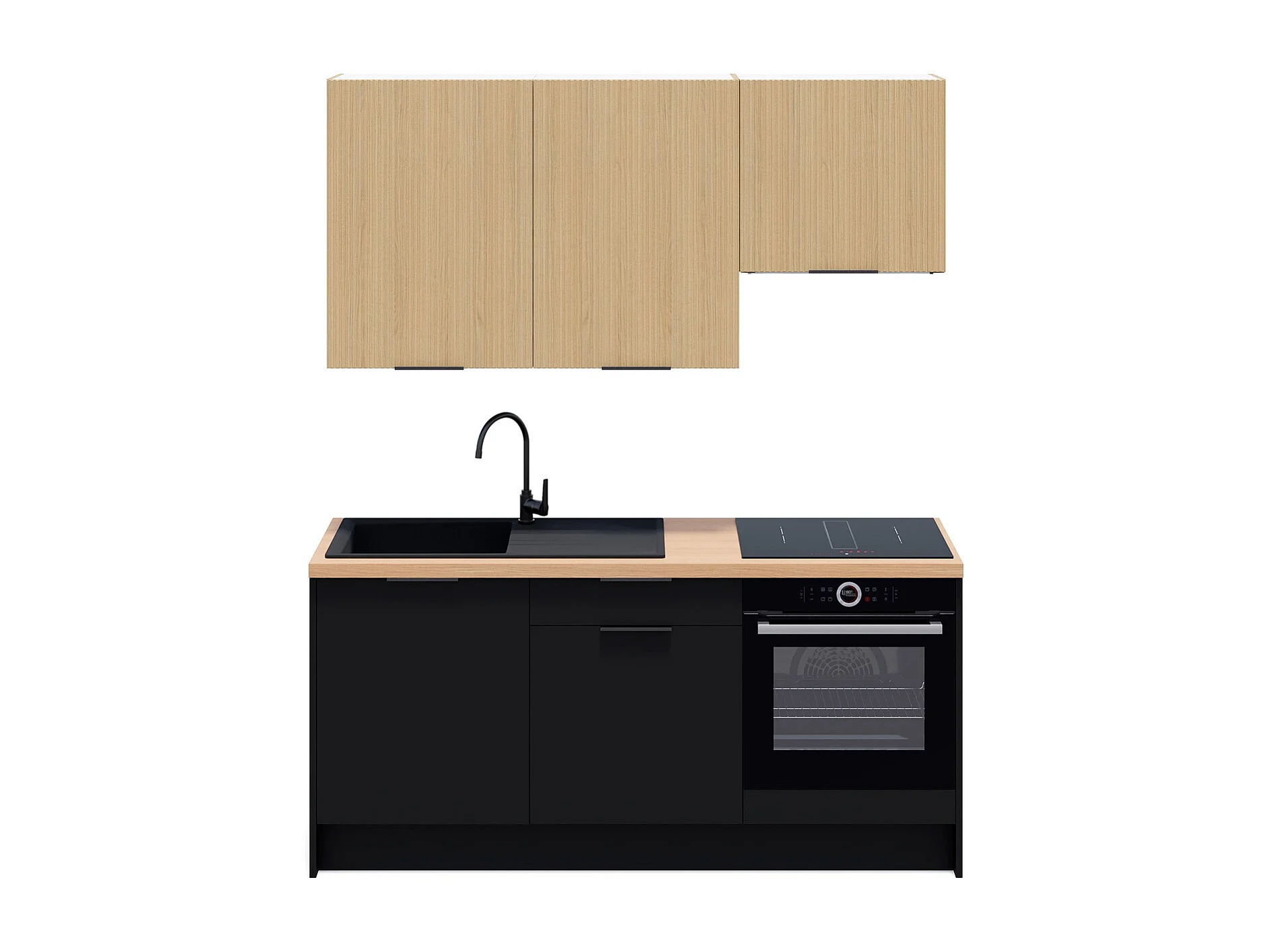 Ensemble de 6 meubles de cuisine - L. 185 cm - noir et chêne clair cannelé - Luzia Mix