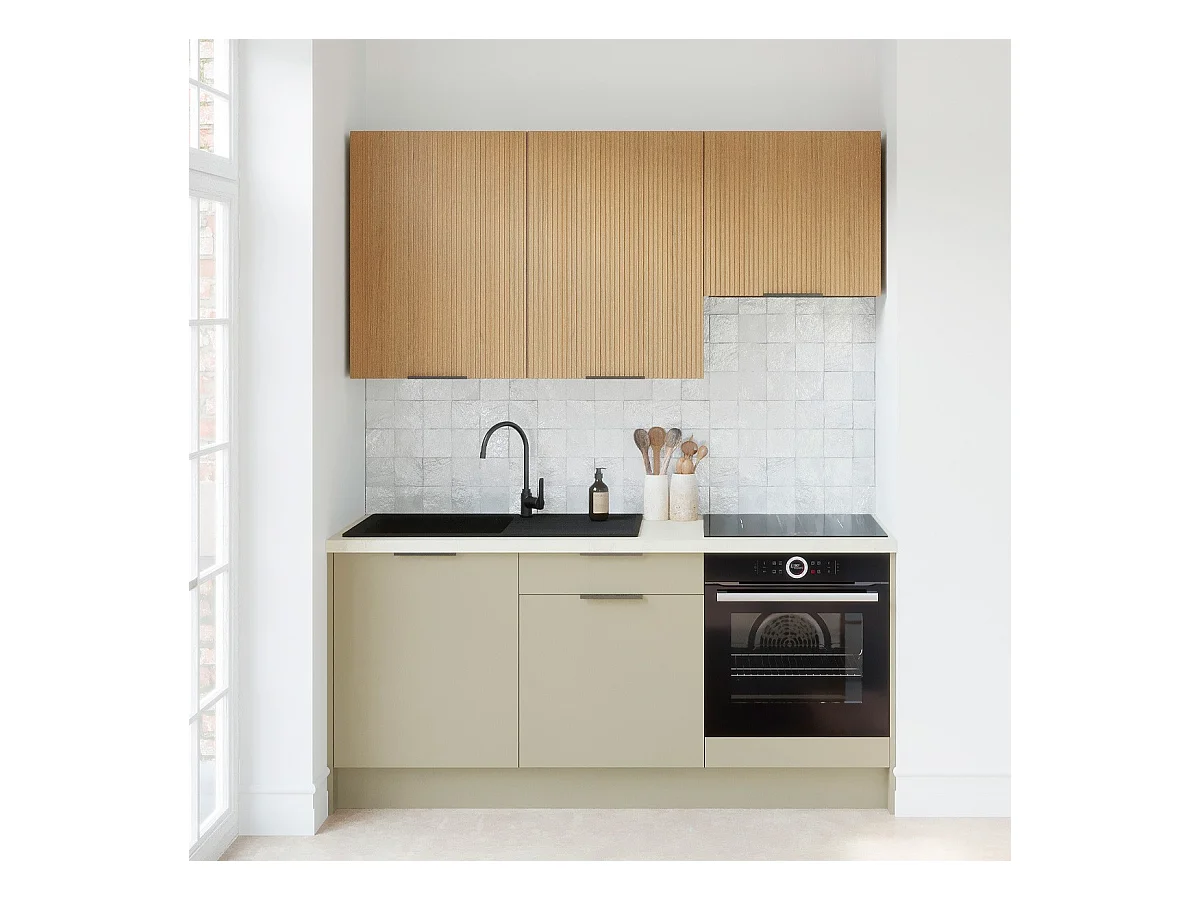 Ensemble de 6 meubles de cuisine - L. 185 cm - vert sauge et chêne clair cannelé - Luzia Mix