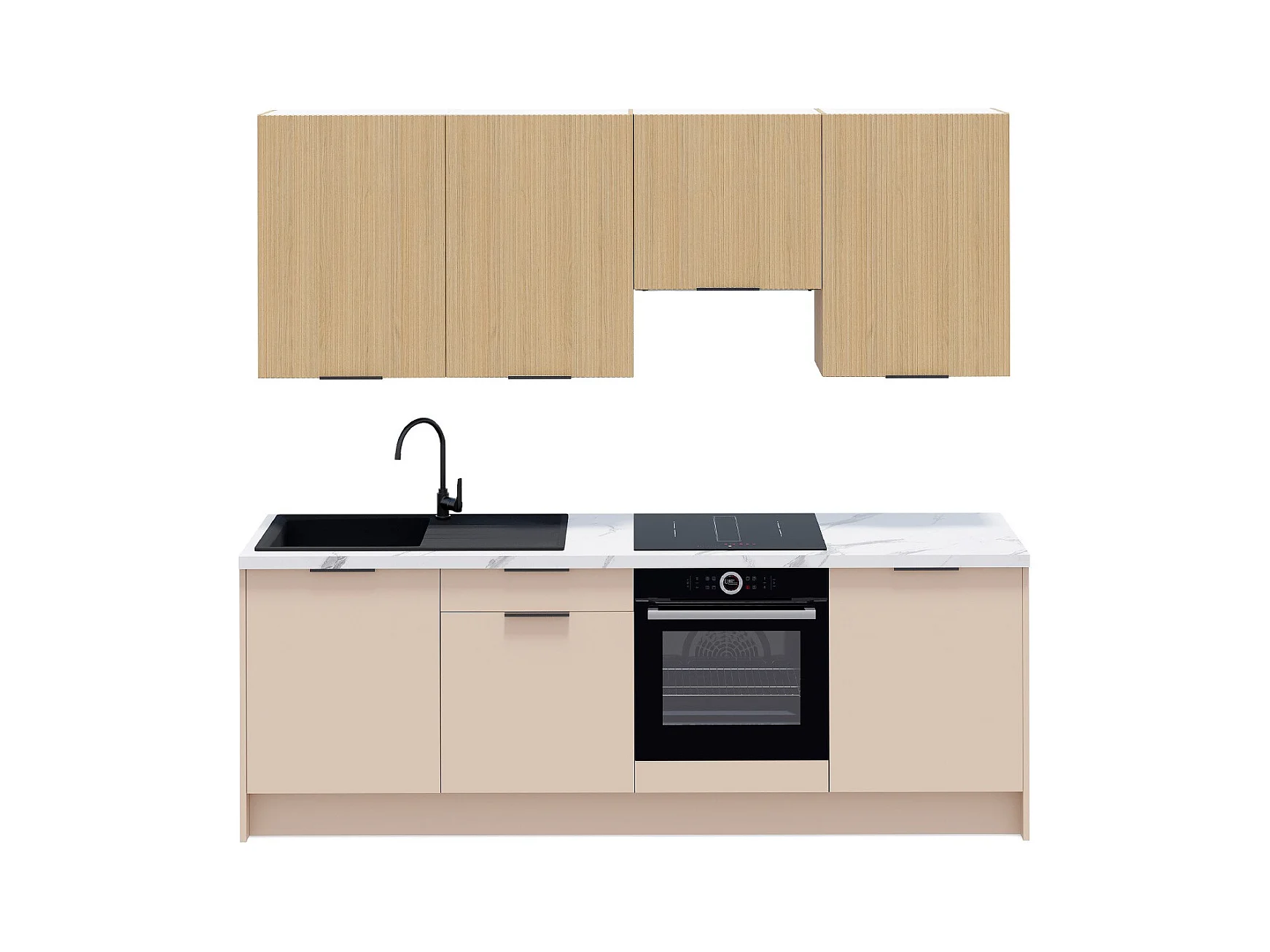 Ensemble de 8 meubles de cuisine - L. 245 cm - beige cachemire et chêne clair cannelé - Luzia Mix
