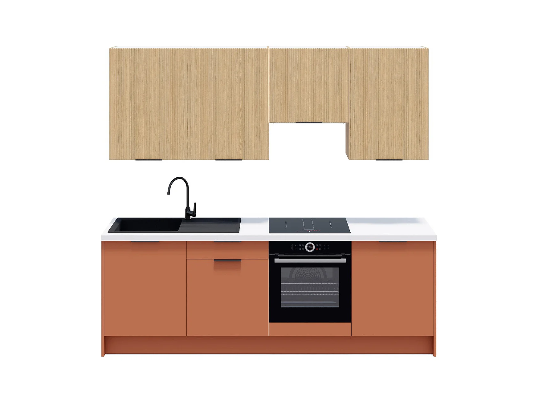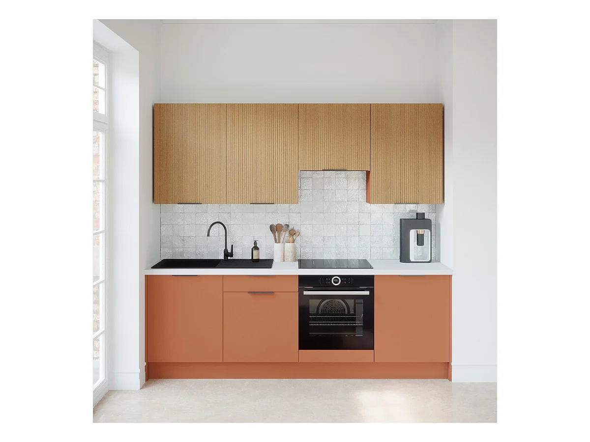 Ensemble de 8 meubles de cuisine - L. 245 cm - terracotta et chêne clair cannelé - Luzia Mix
