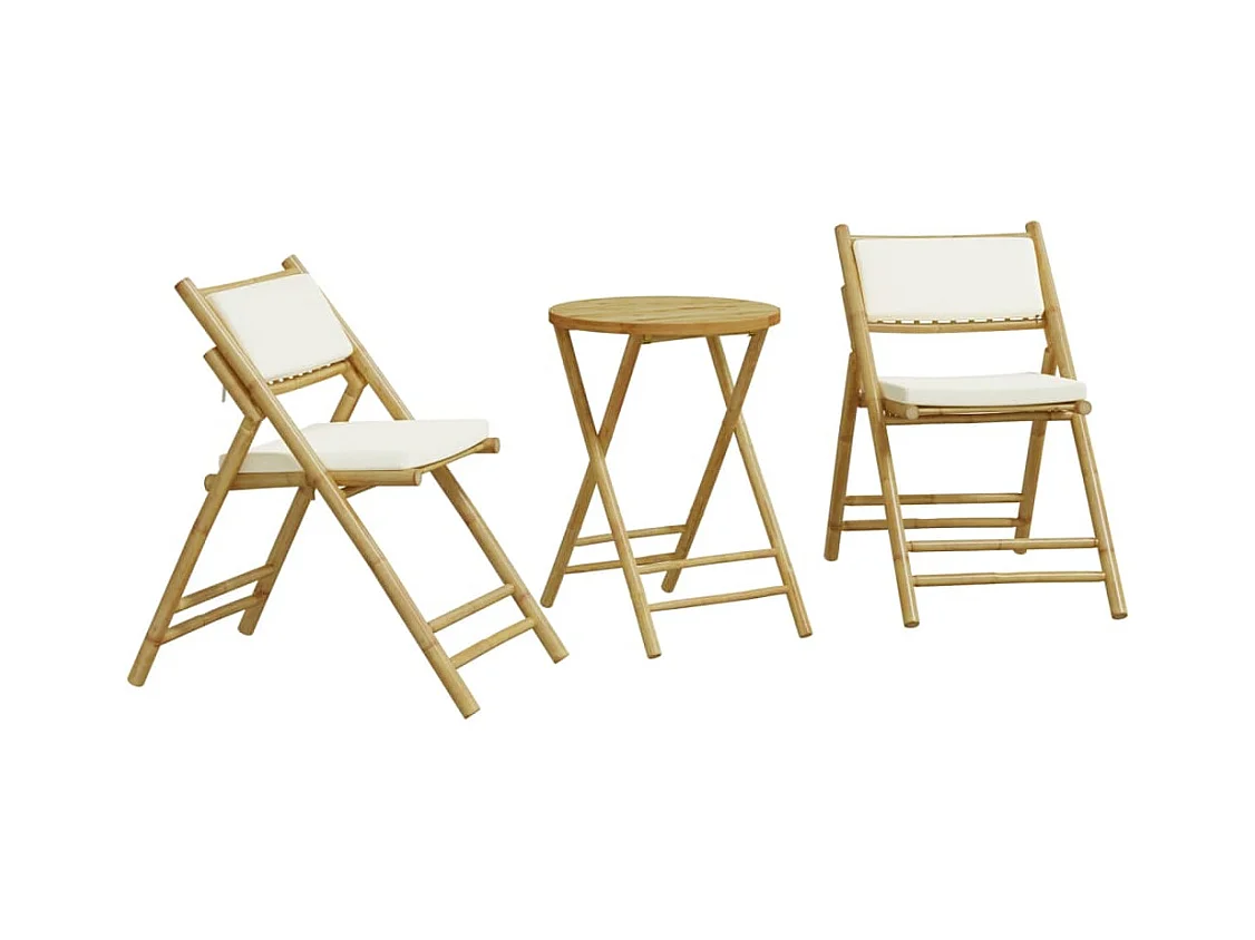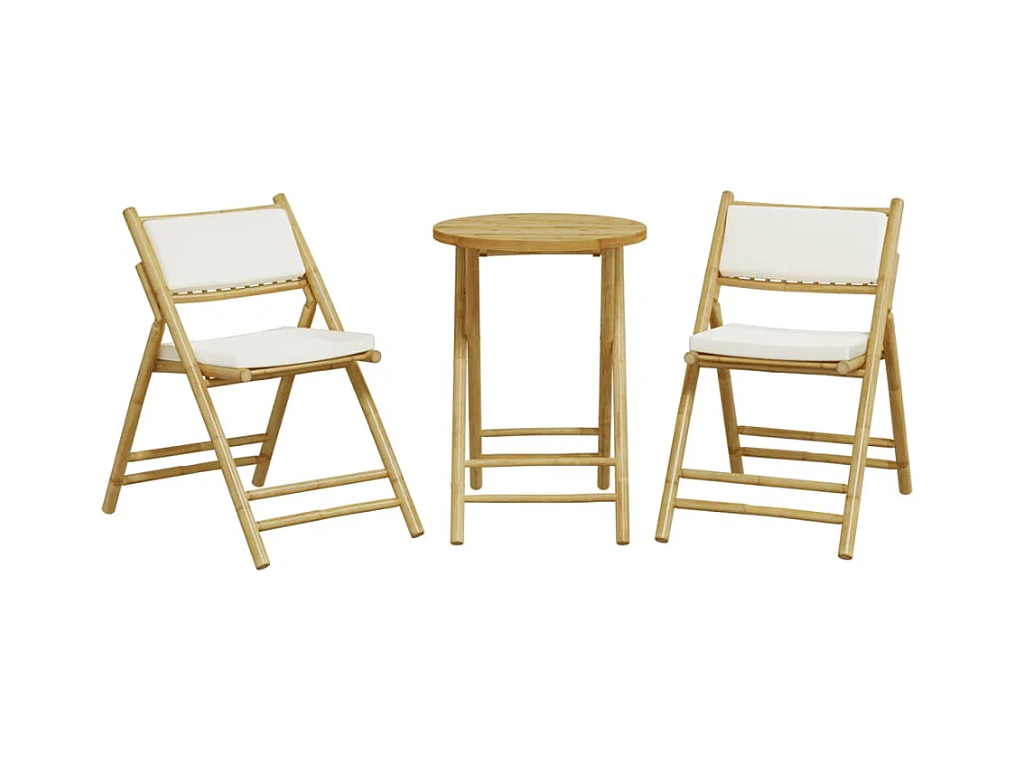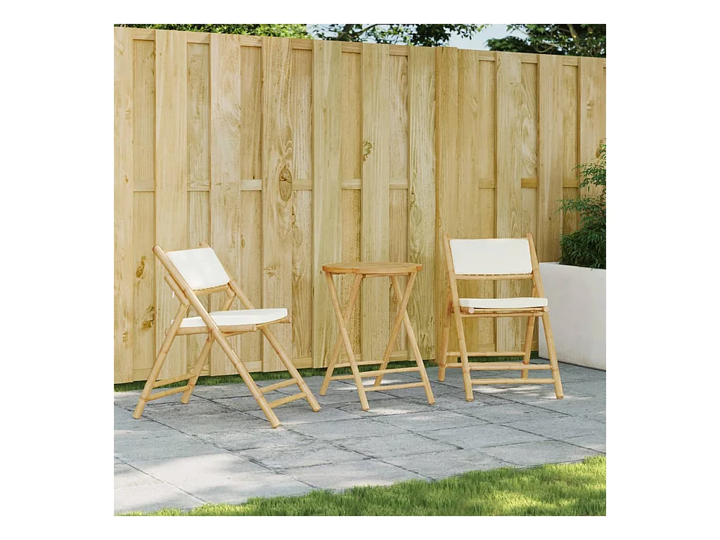Ensemble de bistro pliante 3 pcs et coussins blanc crème bambou FR25661