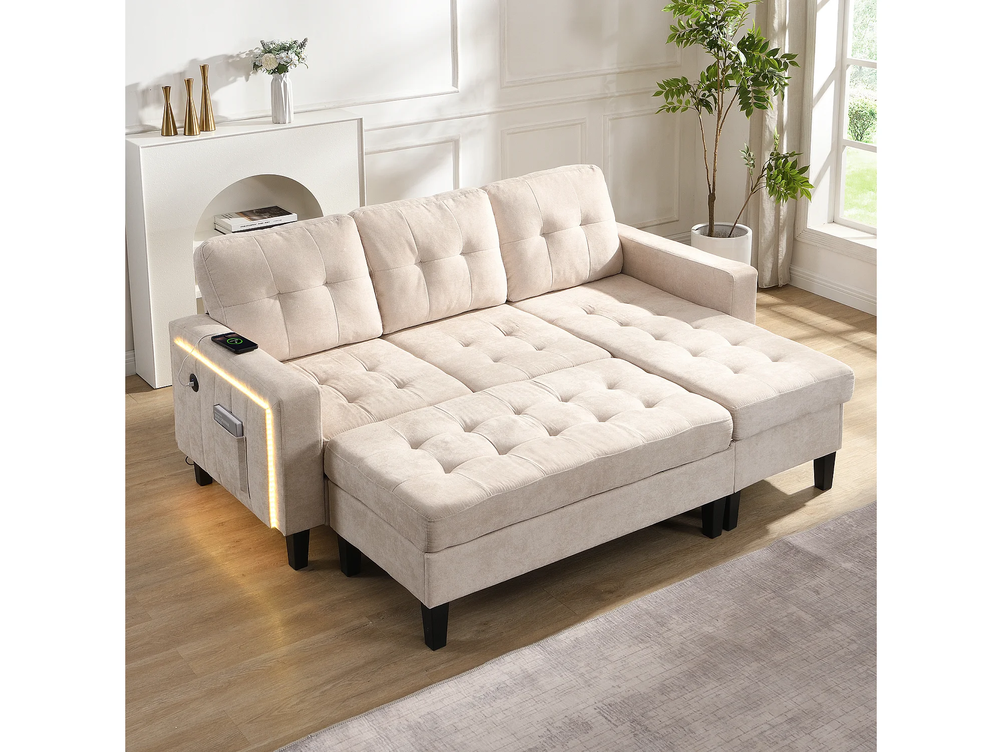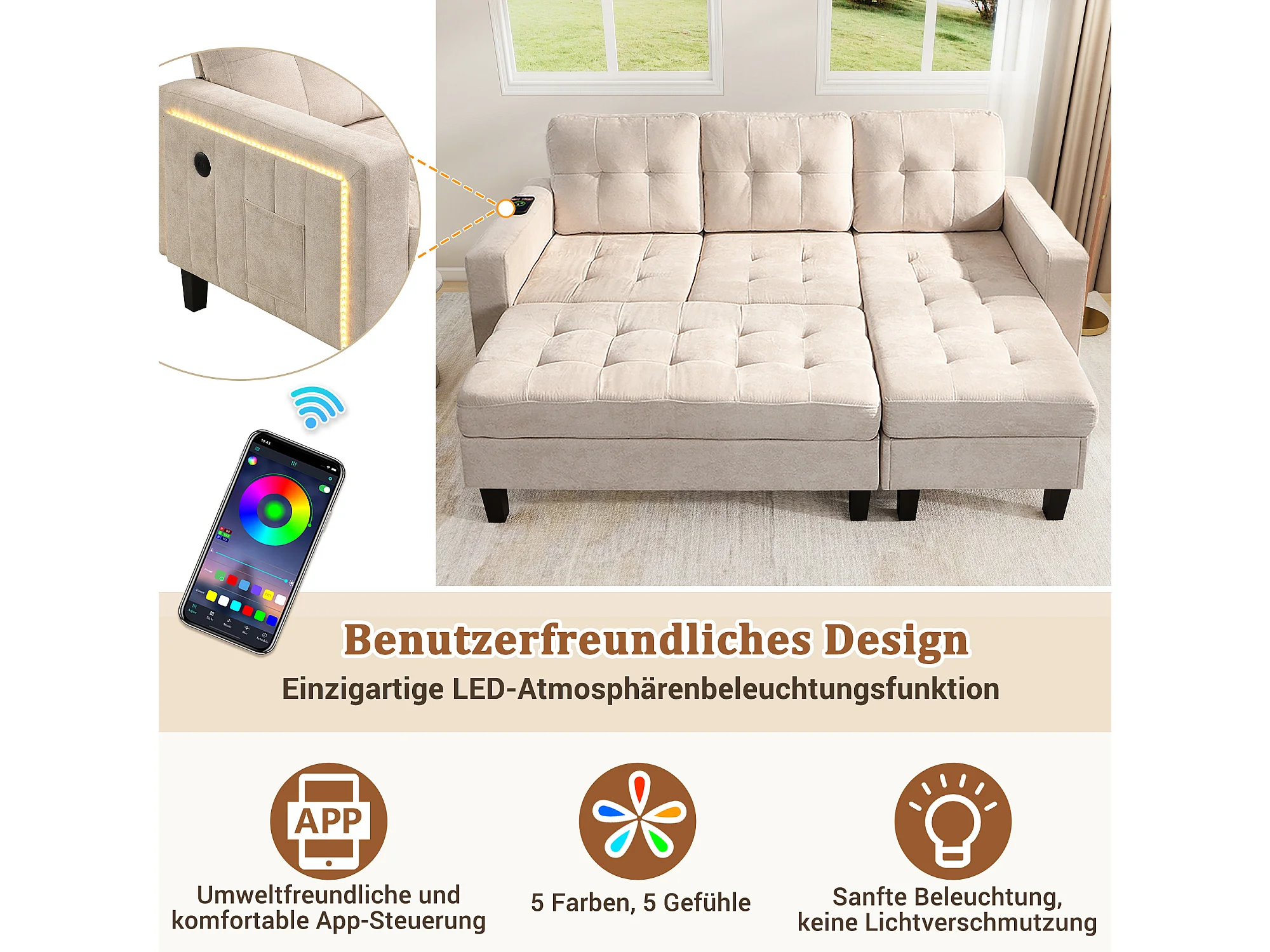 Ensemble de canapé de salon 3 places - 185 x 135 x 85 cm - avec repose-pieds mobile + Leds - velours - beige
