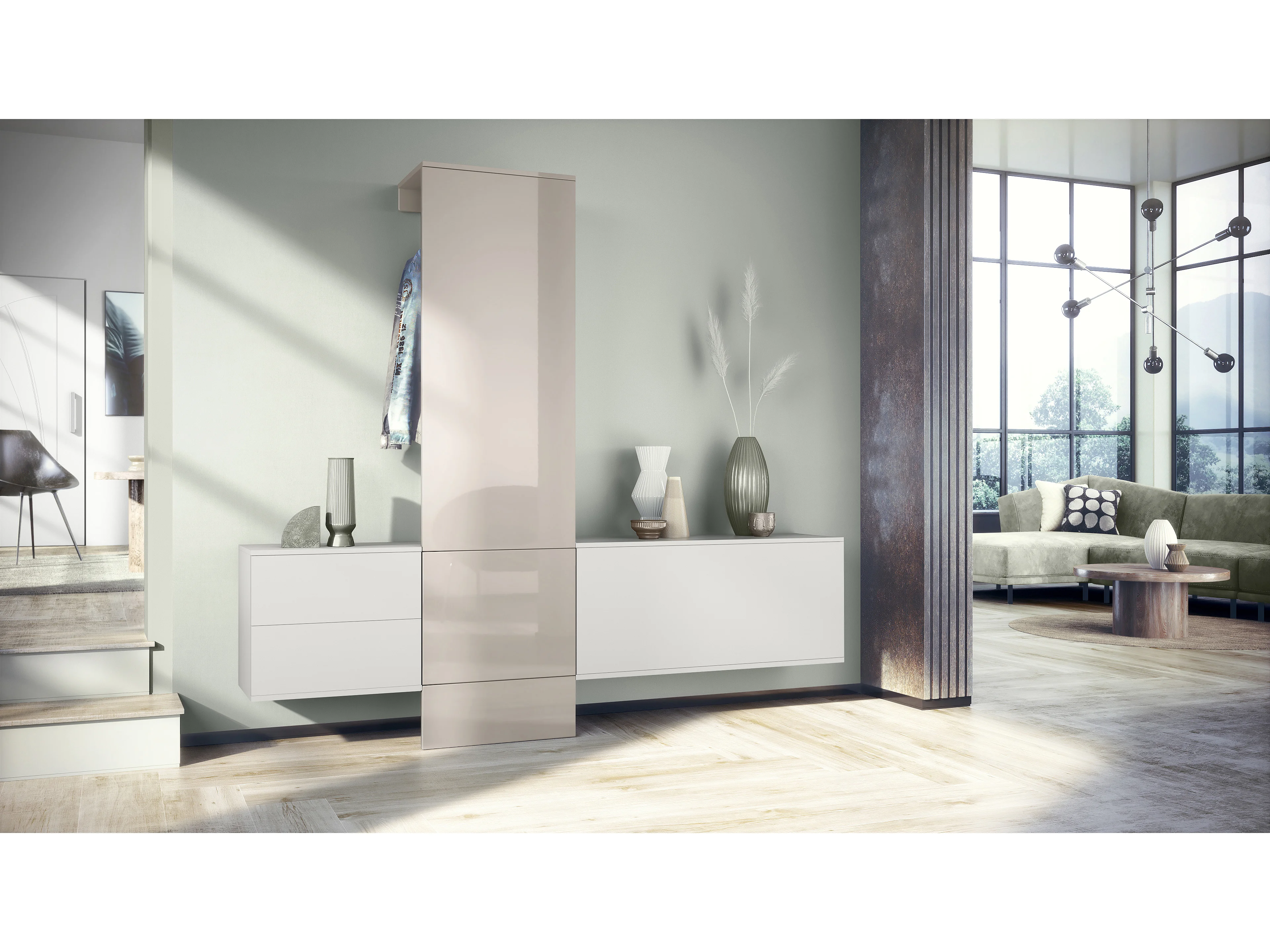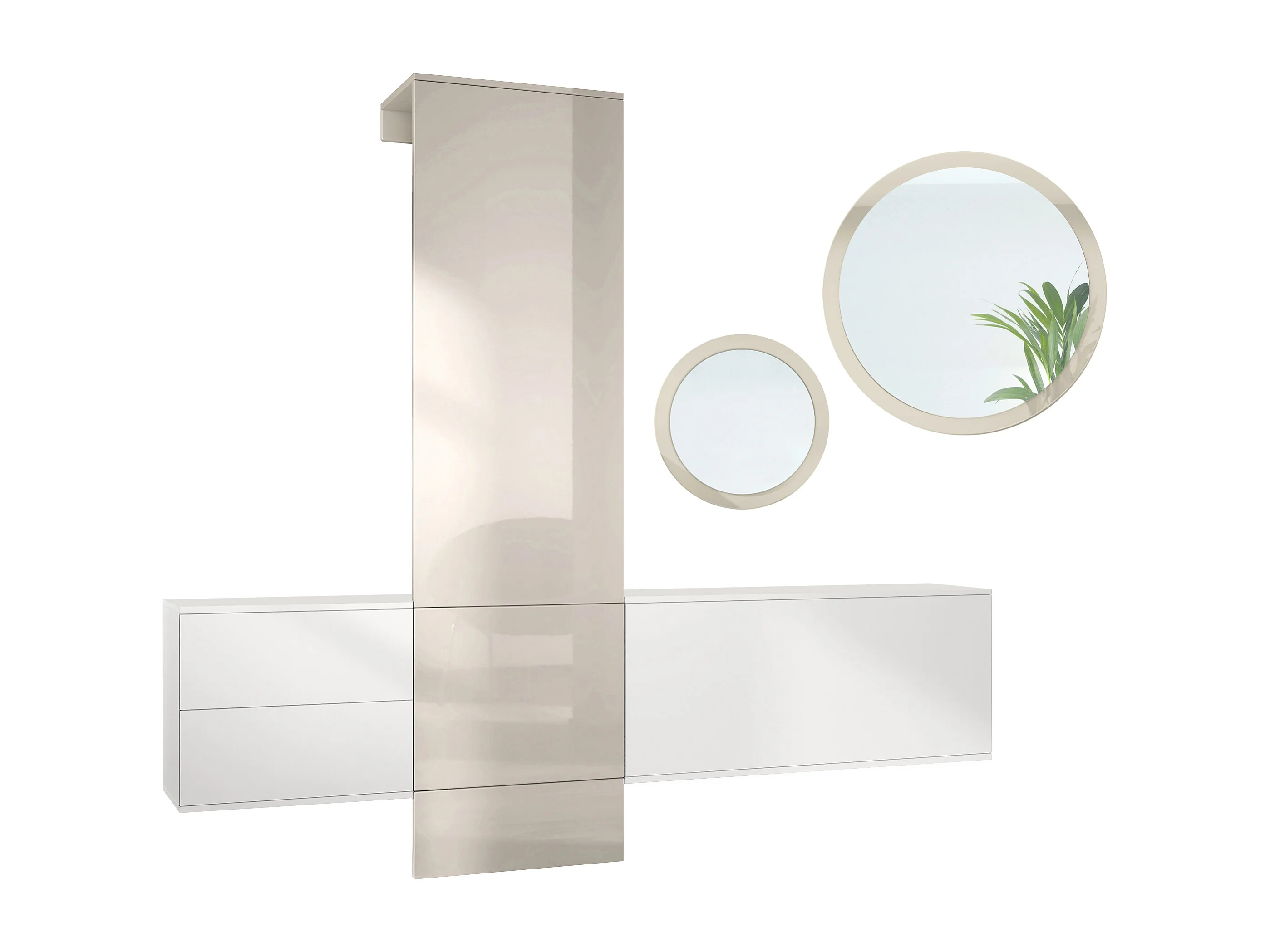 Ensemble de garde-robe DualVista, composé de 1 panneau de porte-manteau, 1 armoire à tiroirs, 1 module de rangement et 2 miroirs, blanc mat/gris sable brillant