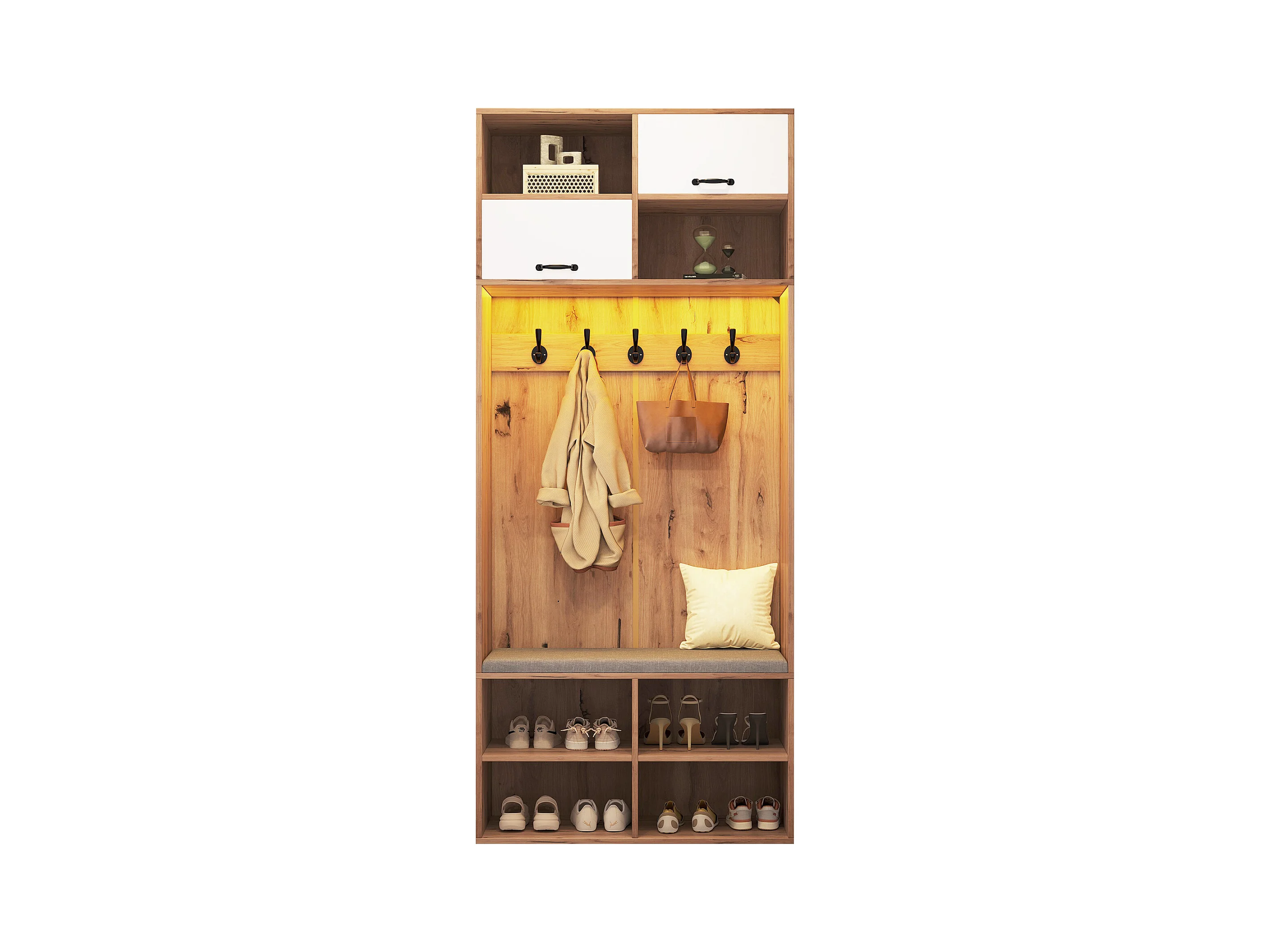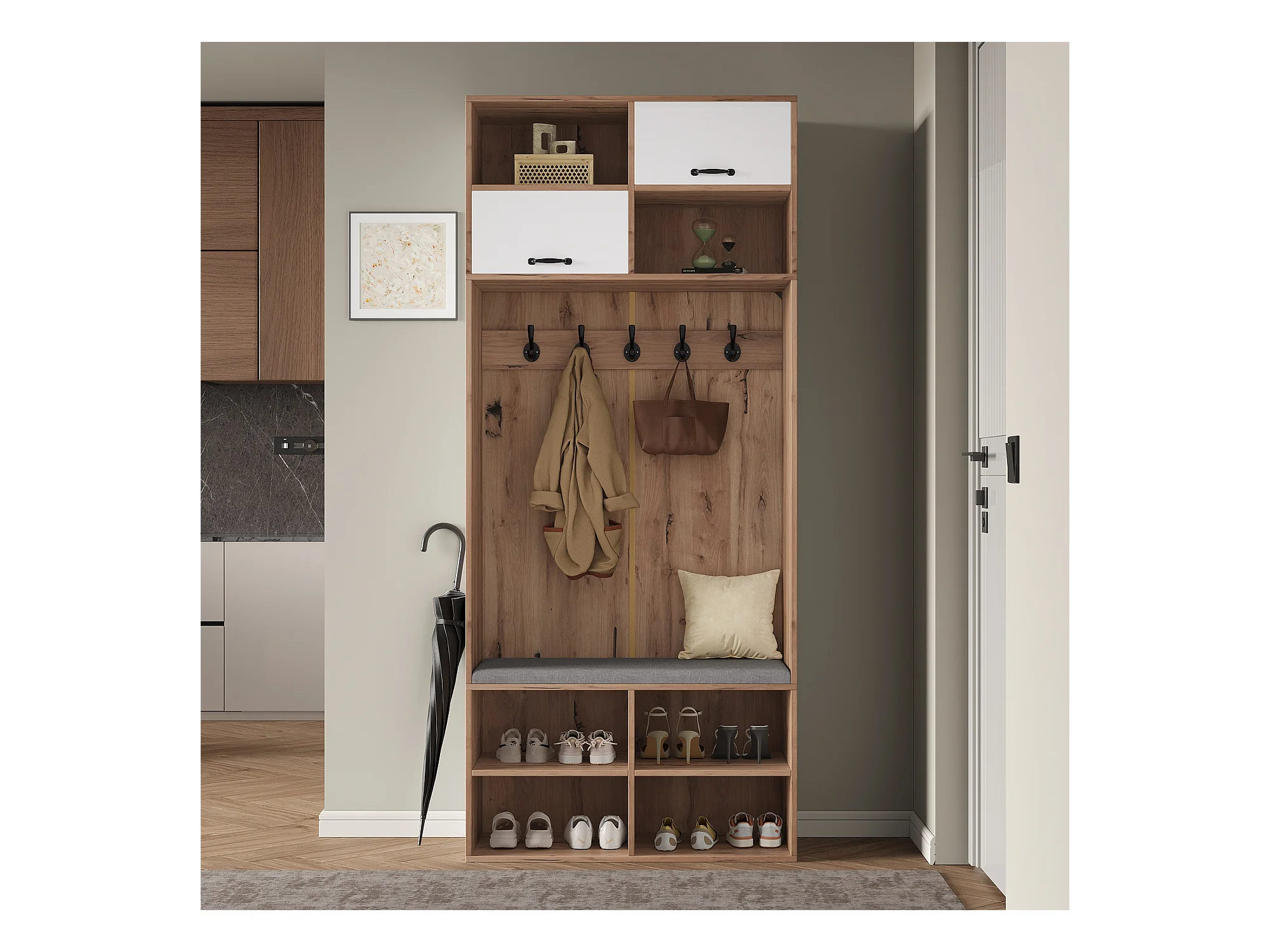 Ensemble de garde-robe/Vestiaire avec banc + 5 crochets + 2 portes + 6 rangements - 80 x 35 x 185 cm - aggloméré - naturel