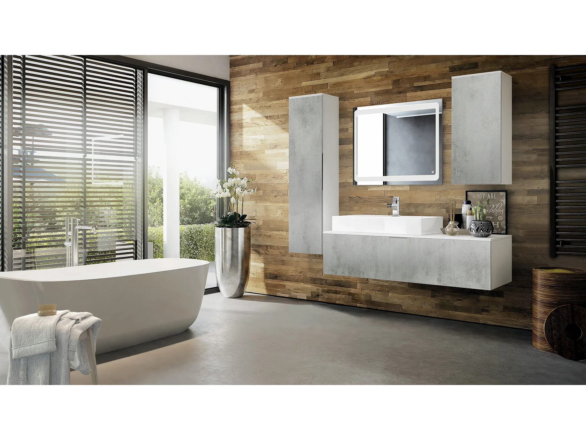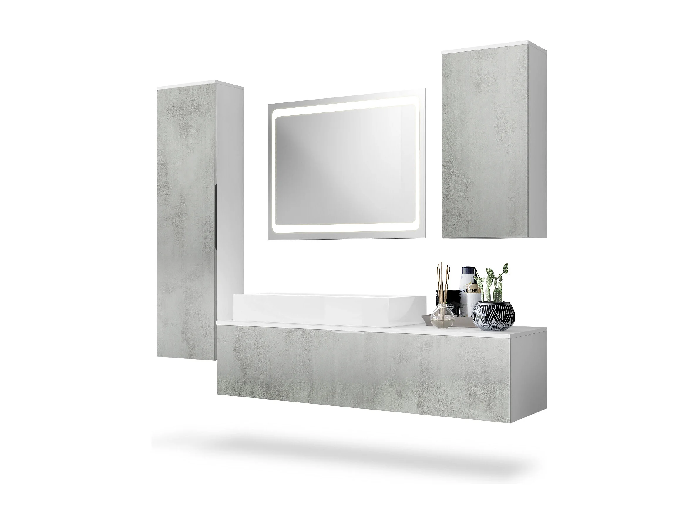 Ensemble de Meubles de Bains Beach, Corps en Blanc Mat/Façades en Aspect béton oxyde-optique avec Vasque à poser et Miroir LED