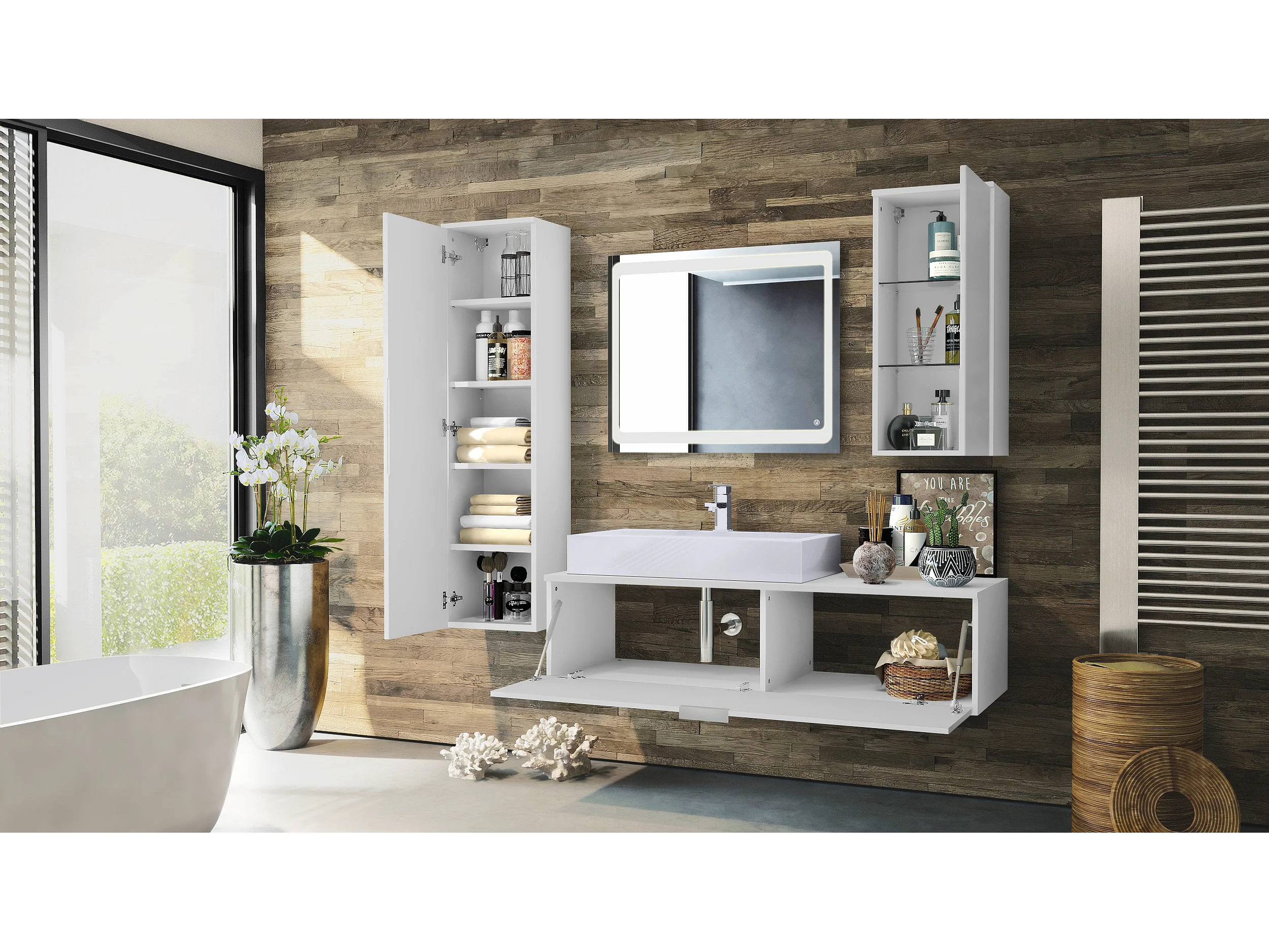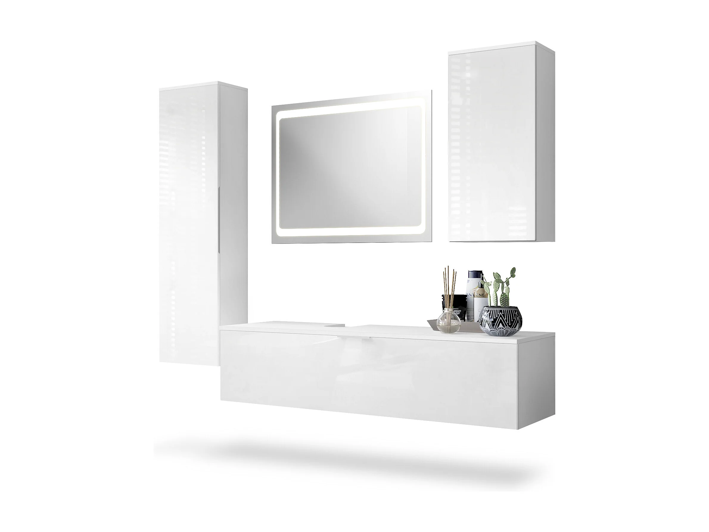 Ensemble de Meubles de Bains Beach, Corps en Blanc Mat/Façades en Blanc haute brillance avec miroir LED