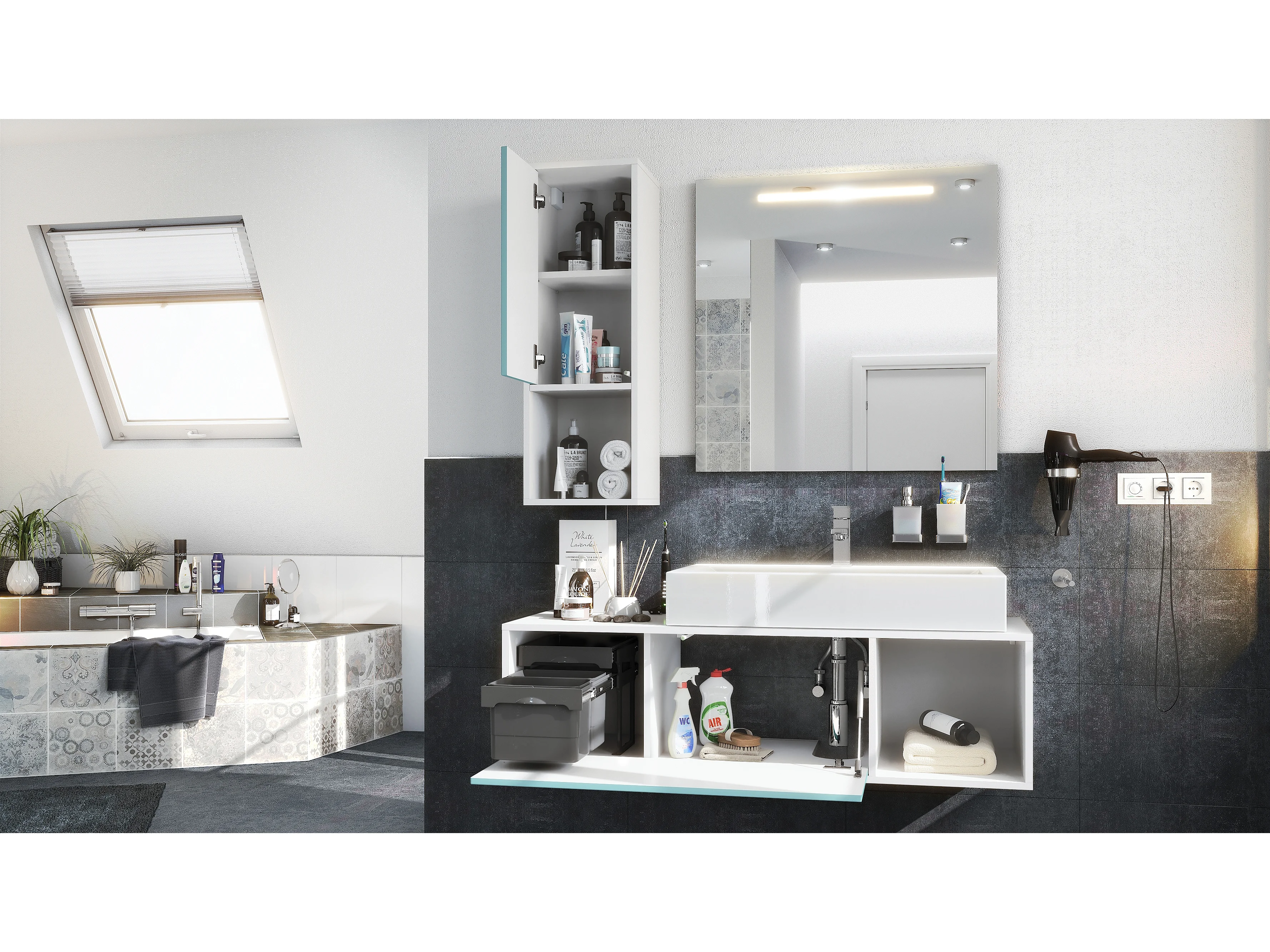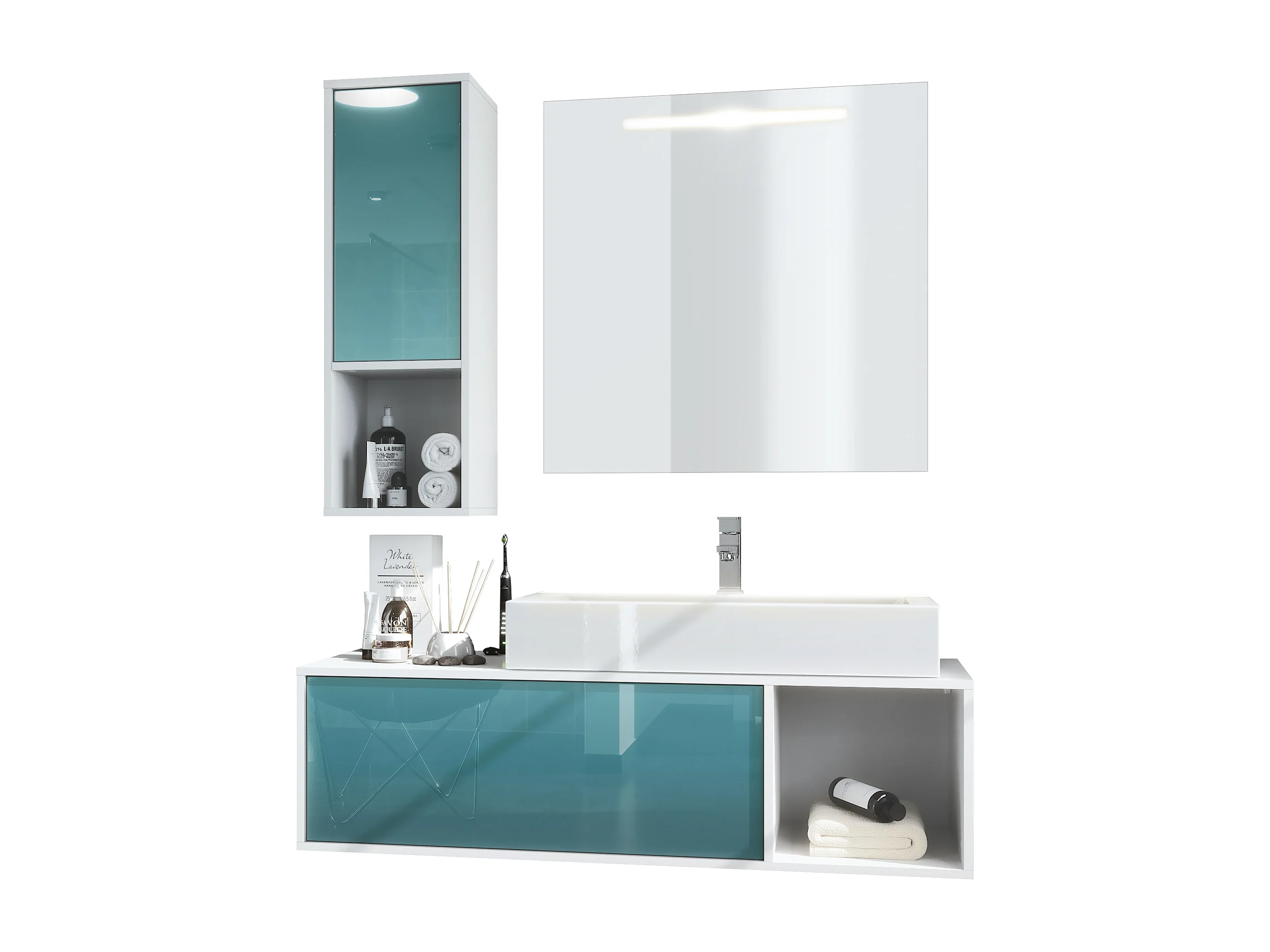 Ensemble de meubles de bains La Costa, Corps en Blanc mat, Façades en Turquoise haute brillance, avec Vasque à poser, Robinet et Miroir LED