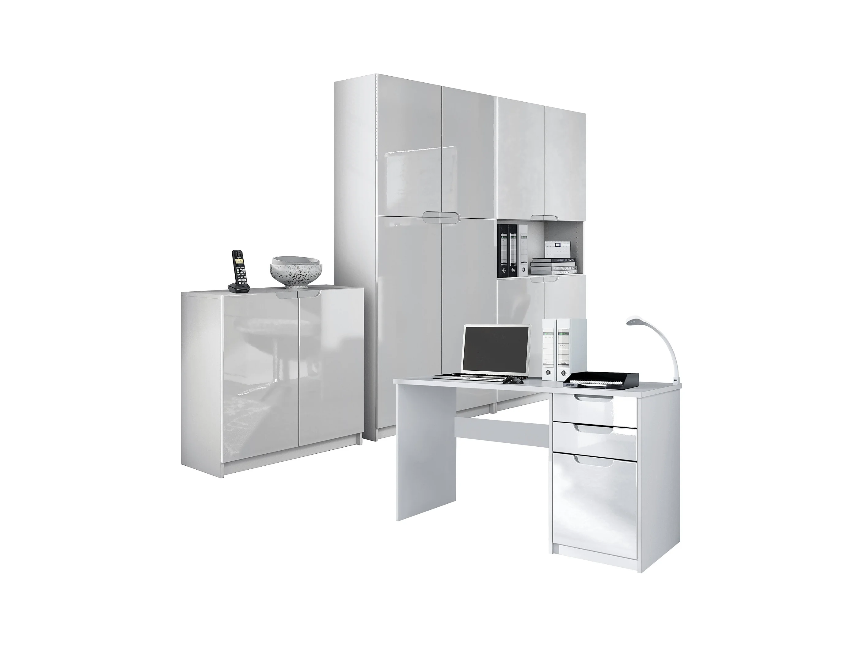 Ensemble de meubles de bureau Armoire Commode Rangement Logan, Corps en blanc mat / Façades en blanc haute brillance