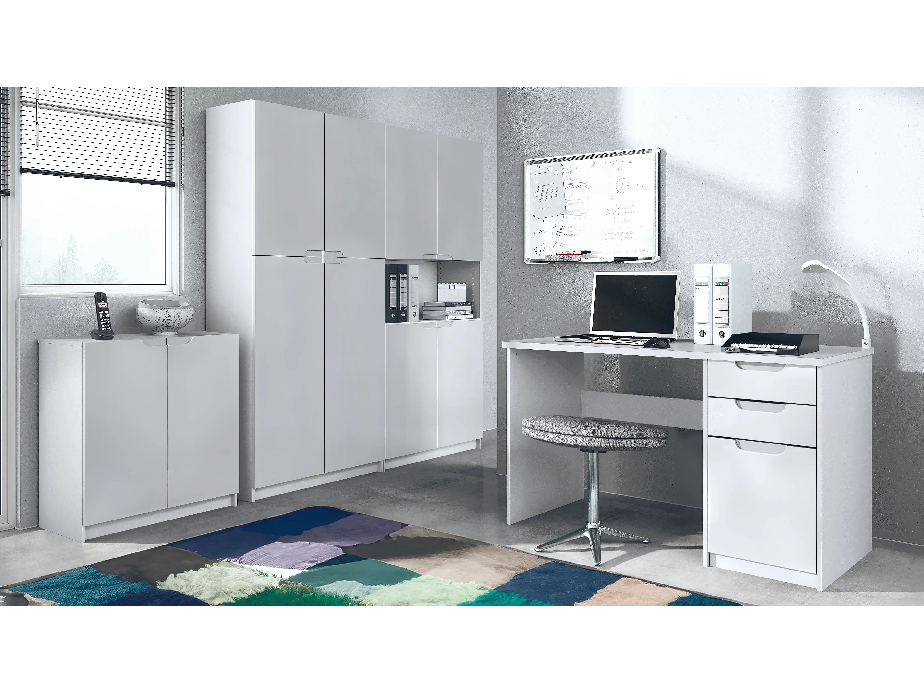Ensemble de meubles de bureau Armoire Commode Rangement Logan, Corps en blanc mat / Façades en blanc mat