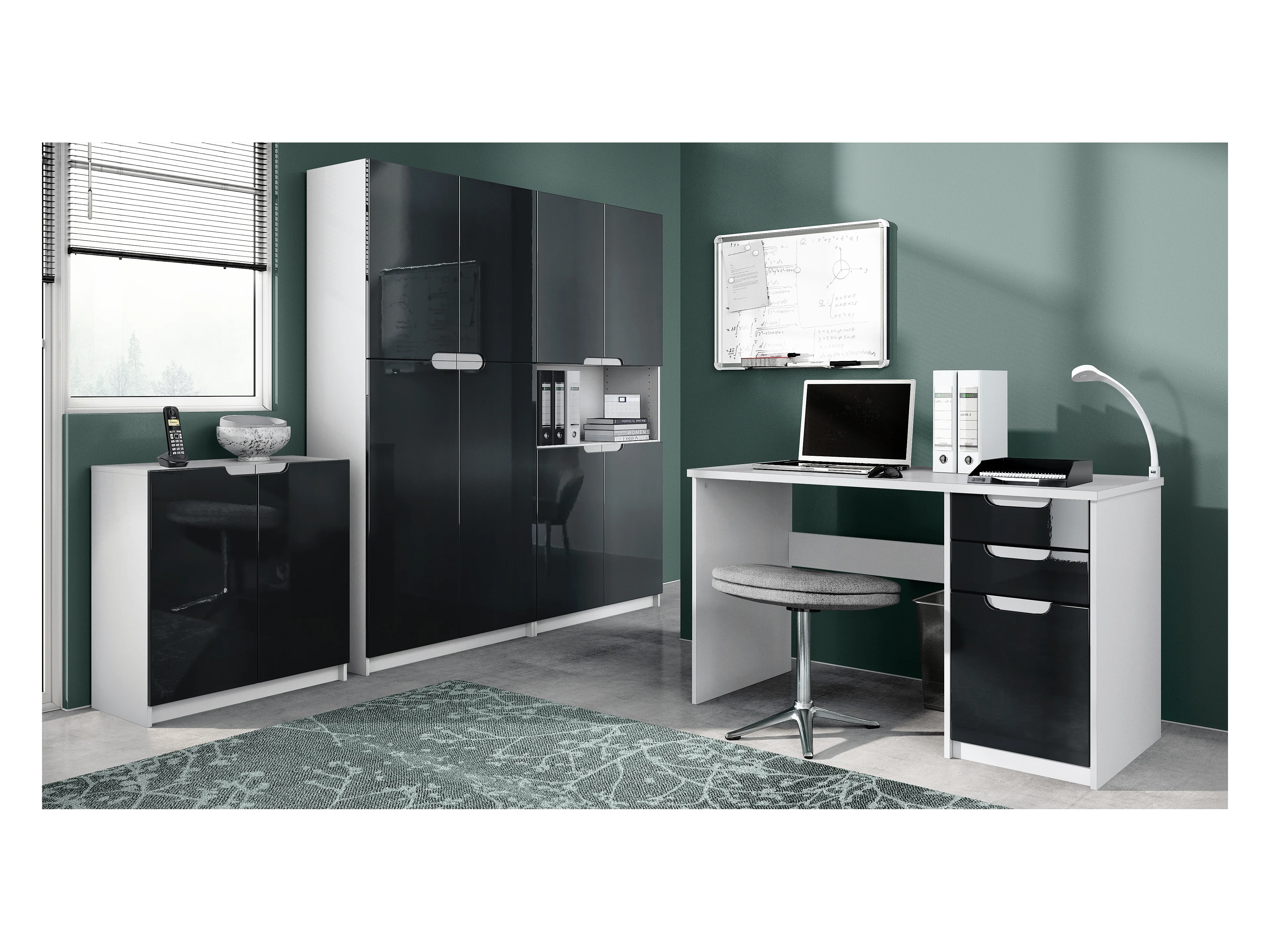 Ensemble de meubles de bureau Armoire Commode Rangement Logan, Corps en blanc mat / Façades en noir haute brillance