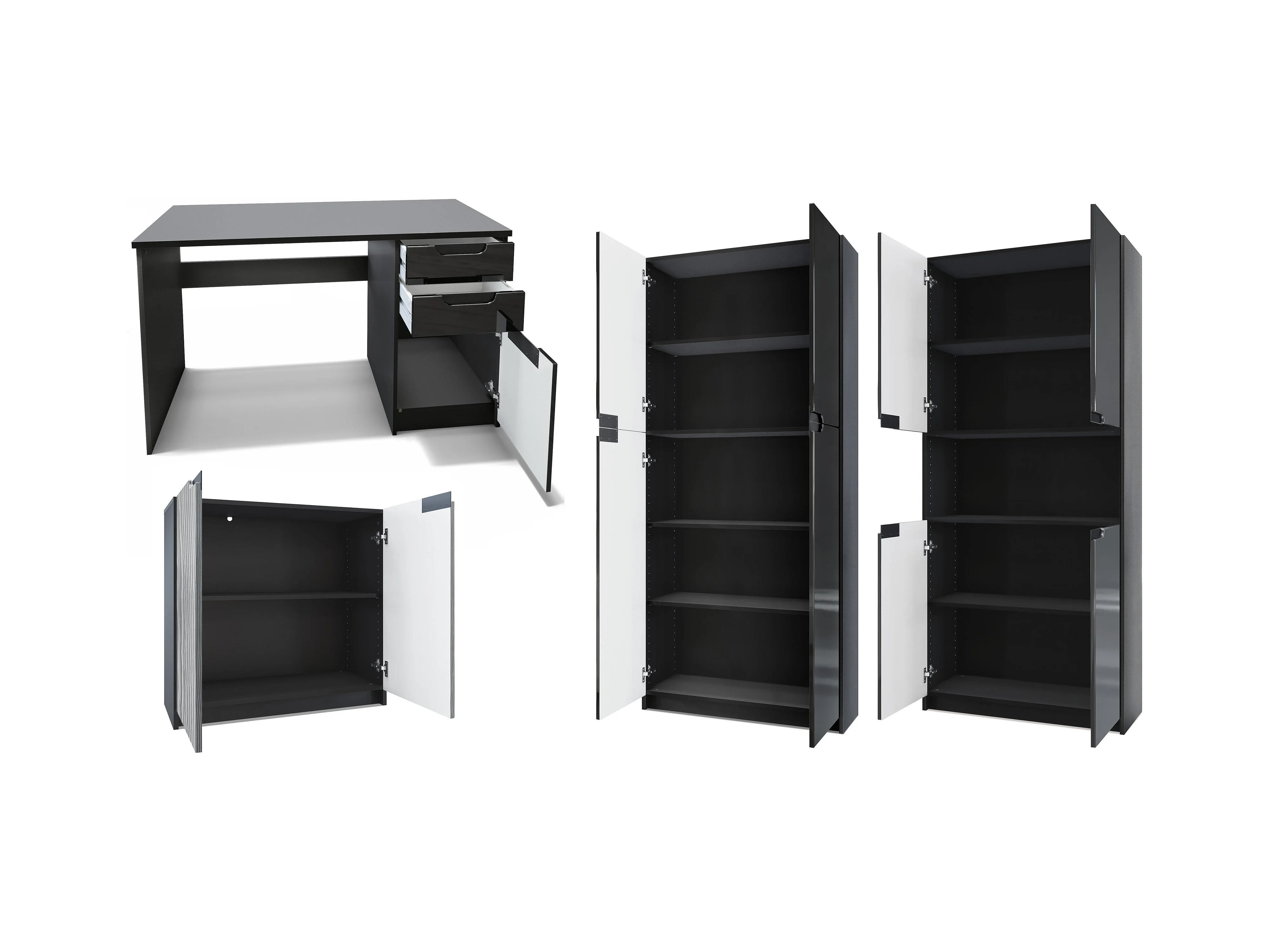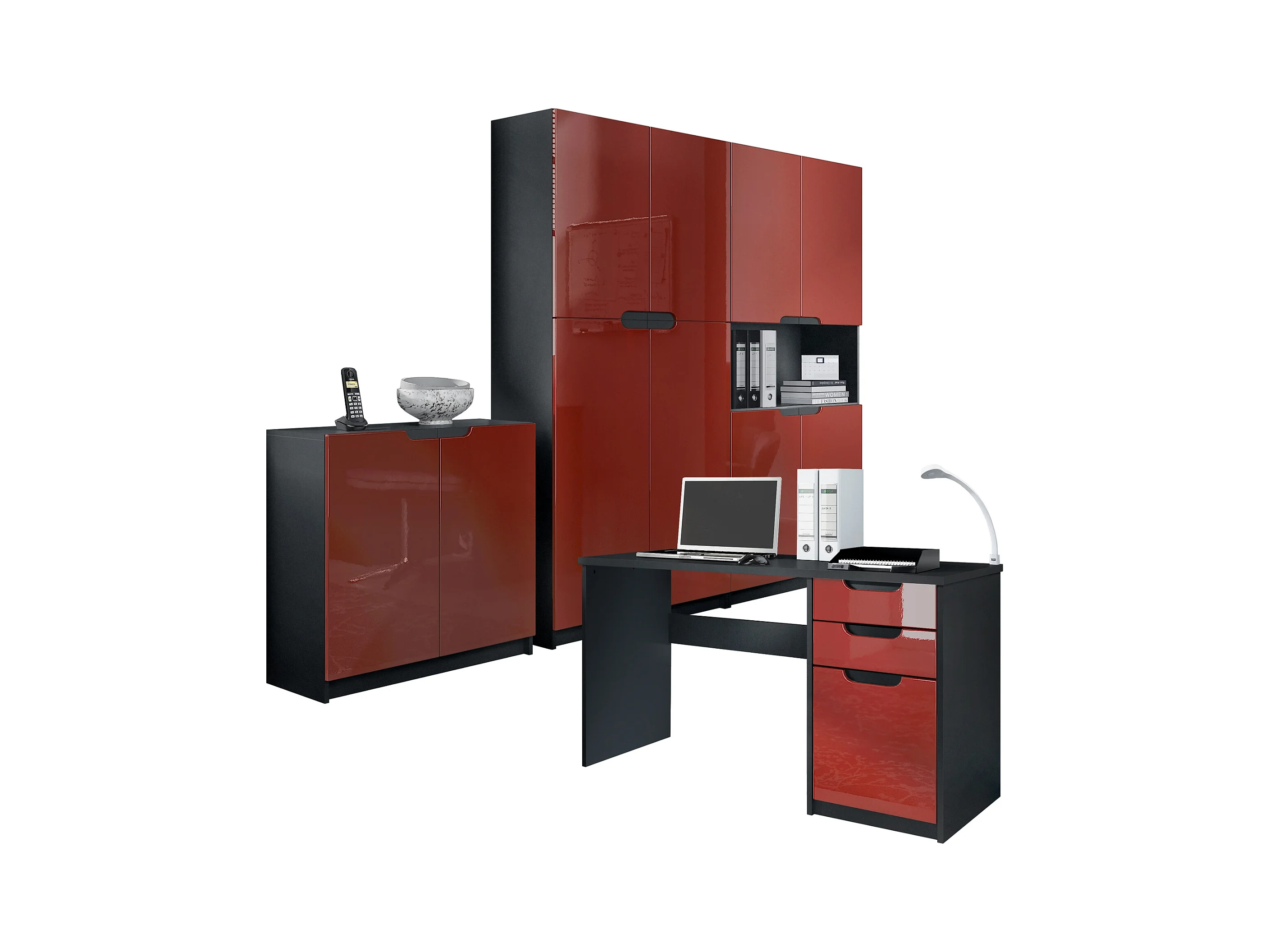 Ensemble de meubles de bureau Armoire Commode Rangement Logan, Corps en noir mat / Façades en bordeaux haute brillance