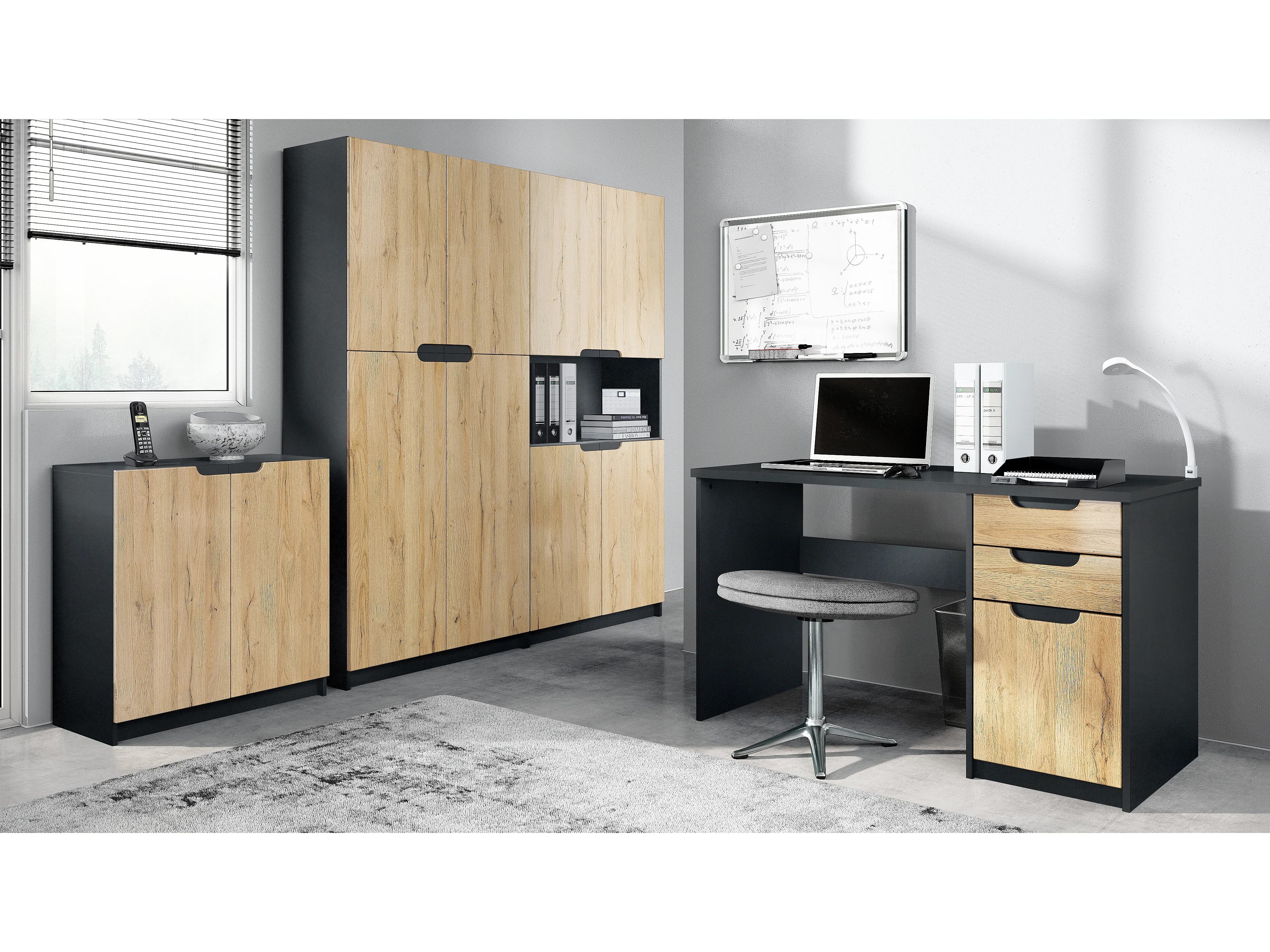 Ensemble de meubles de bureau Armoire Commode Rangement Logan, Corps en noir mat / Façades en chêne nature